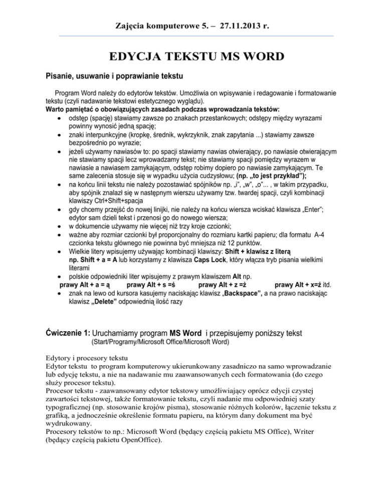 Zajęcia komputerowe 5. – 27.11.2013 r. EDYCJA TEKSTU MS WORD Pisanie, usuwanie i poprawianie tekstu Program Word należy do edytorów tekstów. Umożliwia on wpisywanie i redagowanie i formatowanie tekstu (czyli nadawanie tekstowi estetycznego wyglądu). Warto pamiętać o obowiązujących zasadach podczas wprowadzania tekstów: • odstęp (spację) stawiamy zawsze po znakach przestankowych; odstępy między wyrazami powinny wynosić jedną spację; • znaki interpunkcyjne (kropkę, średnik, wykrzyknik, znak zapytania ...) stawiamy zawsze bezpośrednio po wyrazie; • jeżeli używamy nawiasów to: po spacji stawiamy nawias otwierający, po nawiasie otwierającym nie stawiamy spacji lecz wprowadzamy tekst; nie stawiamy spacji pomiędzy wyrazem w nawiasie a nawiasem zamykającym, odstęp robimy dopiero po nawiasie zamykającym. Te same zalecenia stosuje się w wypadku użycia cudzysłowu; (np. „to jest przykład”); • na końcu linii tekstu nie należy pozostawiać spójników np. „i”, „w”, „o”... , w takim przypadku, aby spójnik znalazł się w następnym wierszu używamy tzw. twardej spacji, czyli kombinacji klawiszy Ctrl+Shift+spacja • gdy chcemy przejść do nowej linijki, nie należy na końcu wiersza wciskać klawisza „Enter”; edytor sam dzieli tekst i przenosi go do nowego wiersza; • w dokumencie używamy nie więcej niż trzy kroje czcionki; • ważne aby rozmiar czcionki był proporcjonalny do rozmiaru kartki papieru; dla formatu A-4 czcionka tekstu głównego nie powinna być mniejsza niż 12 punktów. • Wielkie litery wpisujemy używając kombinacji klawiszy: Shift + klawisz z literą np. Shift + a = A lub korzystamy z klawisza Caps Lock, który włącza tryb pisania wielkimi literami • polskie odpowiedniki liter wpisujemy z prawym klawiszem Alt np. prawy Alt + a = ą prawy Alt + s =ś prawy Alt + z =ż prawy Alt + x=ź itd. • znak na lewo od kursora kasujemy naciskając klawisz „Backspace”, a na prawo naciskając klawisz „Delete” odpowiednią ilość razy Ćwiczenie 1: Uruchamiamy program MS Word i przepisujemy poniższy tekst (Start/Programy/Microsoft Office/Microsoft Word) Edytory i procesory tekstu Edytor tekstu to program komputerowy ukierunkowany zasadniczo na samo wprowadzanie lub edycję tekstu, a nie na nadawanie mu zaawansowanych cech formatowania (do czego służy procesor tekstu). Procesor tekstu - zaawansowany edytor tekstowy umożliwiający oprócz edycji czystej zawartości tekstowej, także formatowanie tekstu, czyli nadanie mu odpowiedniej szaty typograficznej (np. stosowanie krojów pisma), stosowanie różnych kolorów, łączenie tekstu z grafiką, a jednocześnie określenie formatu papieru, na którym dany dokument ma być wydrukowany. Procesory tekstów to np.: Microsoft Word (będący częścią pakietu MS Office), Writer (będący częścią pakietu OpenOffice). Zajęcia komputerowe 5. – 27.11.2013 r. Ćwiczenie 2: Formatujemy tekst jak na rysunku Są dwa sposoby formatowania tekstu: • Pierwszy sposób polega na wybraniu odpowiednich formatów przed pisaniem dokumentu. • Drugi sposób to formatowanie gotowego tekstu. Ten sposób jest wygodniejszy, ponieważ pozwala zaplanować wygląd całej strony. Większość czynności związanych z porządkowaniem tekstu i jego formatowaniem wymaga zaznaczenia fragmentu dokumentu. Tekst można zaznaczyć na dwa sposoby: • Przeciągnąć po tekście myszką (lewy klawisz wciśnięty). Ustawić kursor na początku lub na końcu fragmentu tekstu do zaznaczenia i przy wciśniętym klawiszu Shift przesuwać punkt wstawiania za pomocą klawiszy ze strzałkami. Aby usunąć zaznaczenie należy kliknąć dokument w dowolnym miejscu. • Wskazówka Tytuł: krój czcionki „Times New Roman”, wielkość – 14, wyrównanie tekstu – do środka Dla tekstu: wcięcie z lewej: 1 cm odstępy: interlinia 1.5 wiersza wyrównanie tekstu – wyjustuj punktory: kropka Ćwiczenie 3. Dokument zapisujemy pod nazwą formatowanie tekstu.doc w podfolderze (folder znajdujący się w innym folderze, położonym niżej w strukturze katalogów) Zajęcia komputerowe założonym (na poprzednich zajęciach) w folderze Moje dokumenty Korzystamy z menu Plik\Zapisz jako