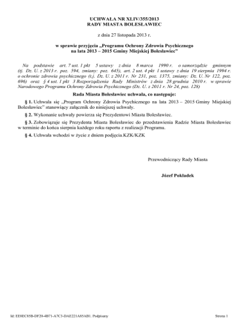 UCHWAŁA NR XLIV/355/2013 RADY MIASTA BOLESŁAWIEC z dnia 27 listopada 2013 r. w sprawie przyjęcia „Programu Ochrony Zdrowia Psychicznego na lata 2013 – 2015 Gminy Miejskiej Bolesławiec” Na podstawie art. 7 ust. 1 pkt 5 ustawy z dnia 8 marca 1990 r. o samorządzie gminnym (tj. Dz. U. z 2013 r. poz. 594, zmiany: poz. 645), art. 2 ust. 4 pkt 1 ustawy z dnia 19 sierpnia 1994 r. o ochronie zdrowia psychicznego (t.j. Dz. U. z 2011 r. Nr 231, poz. 1375, zmiany: Dz. U. Nr 122, poz. 696) oraz § 4 ust. 1 pkt 3 Rozporządzenia Rady Ministrów z dnia 28 grudnia 2010 r. w sprawie Narodowego Programu Ochrony Zdrowia Psychicznego (Dz. U. z 2011 r. Nr 24, poz. 128) Rada Miasta Bolesławiec uchwala, co następuje: § 1. Uchwala się „Program Ochrony Zdrowia Psychicznego na lata 2013 – 2015 Gminy Miejskiej Bolesławiec” stanowiący załącznik do niniejszej uchwały. § 2. Wykonanie uchwały powierza się Prezydentowi Miasta Bolesławiec. § 3. Zobowiązuje się Prezydenta Miasta Bolesławiec do przedstawienia Radzie Miasta Bolesławiec w terminie do końca sierpnia każdego roku raportu z realizacji Programu. § 4. Uchwała wchodzi w życie z dniem podjęcia.KZK/KZK Przewodniczący Rady Miasta Józef Pokładek Id: EE8EC85B-DF20-4B71-A7C3-DAE221A85AB1. Podpisany Strona 1 Załącznik Nr 1 do Uchwały Nr XLIV/355/2013 Rady Miasta Bolesławiec z dnia 27 listopada 2013 r. Program Ochrony Zdrowia Psychicznego na lata 2013 – 2015 Gminy Miejskiej Bolesławiec Bolesławiec, listopad 2013 rok Id: EE8EC85B-DF20-4B71-A7C3-DAE221A85AB1. Podpisany Strona 2 I. Podstawy prawne opracowania programu: Ustawy i rozporządzenia: 1) Ustawa z dnia 19 sierpnia 1994 roku o ochronie zdrowia psychicznego (Dz. U. z 1994 r. Nr 111, poz. 535 ze zm.); 2) Rozporządzenie Rady Ministrów z dnia 28 grudnia 2010 r. w sprawie Narodowego Programu Ochrony Zdrowia Psychicznego (Dz. U. z 2011 r. Nr 24, poz. 128). II. Powiązania programu z innymi aktami prawa miejscowego: 1) Strategia Rozwiązywania Problemów Społecznych Gminy Miejskiej Bolesławiec do roku 2015 przyjęta Uchwałą Nr XXXVI/358/05 Rady Miasta Bolesławiec z dnia 29 czerwca 2005 r. aktualizowana Uchwałą Nr LIX/488/10 Rady Miasta Bolesławiec z dnia 29 września 2010 r. 2) Miejski Program Przeciwdziałania Przemocy w Rodzinie oraz Ochrony Ofiar Przemocy w Rodzinie na lata 2010 – 2015 przyjęty Uchwałą Nr LIX/478/10 Rady Miasta Bolesławiec z dnia 29 września 2010 r. 3) Miejski Program Profilaktyki i Rozwiązywania Problemów Alkoholowych w mieście Bolesławiec (corocznie przyjmowany przez Radę Miasta Bolesławiec). 4) Miejski Program Przeciwdziałania Narkomanii w mieście Bolesławiec do roku 2015” przyjęty Uchwałą Nr XLIII/423/05 Rady Miasta Bolesławiec z dnia 28 grudnia 2005 r. Niektóre działania w zakresie zdrowia psychicznego prowadzone są w ramach w/w programów. III. Opis problemu zdrowotnego Zdrowie psychiczne jest „stanem dobrego samopoczucia, w którym jednostka realizuje swoje zdolności potrafi radzić sobie z normalnymi stresami życia, może pracować wydajnie i owocnie oraz jest w stanie ofiarować coś swojej społeczności”1, jest to globalne dobro publiczne; integralna część zdrowia i dobrostanu obywateli Europy oraz podstawowe prawo człowieka; jest warunkiem koniecznym dla istnienia zdrowej, społecznie odpowiedzialnej 1 http://www.who.int/mental_healt/evidence/en/promoting_mhh.pdf 2 Id: EE8EC85B-DF20-4B71-A7C3-DAE221A85AB1. Podpisany Strona 3 i produktywnej Europy, jaką przewiduje strategia lizbońska; wzmacnia więź społeczną i kapitał społeczny oraz zwiększa bezpieczeństwo życia w środowisku. Niełatwo jest podać prostą, uogólnioną definicję choroby psychicznej. Po pierwsze współczesna psychiatria wymienia wiele ich typów, różniących się między sobą rodzajem objawów, ich nasileniem i długością trwania, a także odmiennym wpływem na codzienne funkcjonowanie. Po drugie brak jest wyraźnej granicy pomiędzy zachowaniami i odczuciami prawidłowymi i patologicznymi. Przyjęta w 1948 roku konstytucja Światowej Organizacji Zdrowia określa zdrowie psychiczne jako pełny dobrostan fizyczny, psychiczny i społeczny człowieka. Słabe zdrowie psychiczne, zaburzenia psychiczne i zaburzenia zachowania występują w każdym wieku, u obu płci, w różnych kulturach i grupach ludności. Prawdopodobieństwo zaburzeń psychicznych jest jednak znacznie większe u ludzi o niższym statusie społeczno ekonomicznym niż u osób o wyższym statusie. Zaburzenia psychiczne stanowią ogromne obciążenie dla poszczególnych osób i rodzin, mogą zmniejszyć zatrudnienie, wydajność pracy i wysokość zarobków oraz zwiększyć ryzyko przestępczości, wypadków samochodowych, maltretowania, wykorzystywania seksualnego i zaniedbywania dzieci, rozwodów, bezdomności, przemocy domowej i samobójstw. Każdy człowiek dokonuje w codziennym życiu wyborów, które bądź szkodzą zdrowiu, bądź je wspomagają. Rodzaj podejmowanych decyzji zależy niewątpliwie od człowieka. To jednak, jakie ma możliwości wyboru, uzależnione jest już od szeregu czynników, na które często sam nie ma wpływu. Ochrona zdrowia jest więc procesem zmierzającym do zachowania zdrowia. Działania promocyjne i profilaktyczne często w mniejszym lub większym stopniu zachodzą na siebie. Profilaktyka – jest jedną z procedur ingerowania w rzeczywistość społeczną i świadomość kształtowania rozwoju rzeczywistości. Z przeglądu najnowszych danych przedstawionych przez Światową Organizację Zdrowia (WHO) wynika, że w chwili obecnej depresja stanowi czwarty najpoważniejszy problem zdrowotny na świecie, w roku 2020 będzie na drugim miejscu wśród takich problemów, a 10 lat później może stać się główną przyczyną niepełnosprawności .2 2 Źródło: Główny Urząd Statystyczny – Informacje i opracowania statystyczne - Zdrowie i ochrona zdrowia w 2011 r. 3 Id: EE8EC85B-DF20-4B71-A7C3-DAE221A85AB1. Podpisan