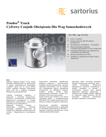 Pendeo® Truck Cyfrowy Czujnik Obciążenia Dla Wag Samochodowych 25 t i 50 t, typ C3 i C6 • Łatwy w montażu • Sygnał wyjściowy RS 485 odporny • • • • • Opis Rodzina czujników Pendeo® Truck została specjalnie zaprojektowana do zastosowania w wagach samochodowych. Konstrukcja czujników oparta jest na naszej dobrze znanej, unikalnej koncepcji sprawdzonej przez wiele lat w trudnych warunkach działania wag samochodowych. Unikalna konstrukcja czujników, w połączeniu z zestawami montażowymi, umożliwia zrównoważenie przemieszczeń poprzecznych powstających w wyniku oddziaływań mechanicznych i termicznych konstrukcji wagi samochodowej. Połączenie geometrii czujnika z odpowiednią twardością materiału gwarantuje doskonałe zachowanie się czujnika przy odchylaniu od pionu, dużą siłę zwrotną i długoterminową bezobsługową pracę. Zastosowana konstrukcja wahadłowego podparcia, połączona z opatentowanym kształtem elementu pomiarowego, zapewnia optymalne przeniesienie siły do czujnika oraz minimalizację wpływu oddziaływań zewnętrznych na dokładność pomiaru. Czujniki cechuje szeroki zakres dopuszczalnych przeciążeń, wysoka powtarzalność i liniowość przetwarzania. Dzięki hermetycznej obudowie oraz użyciu specjalnego kabla, z termoplastycznego elastomeru TPE, czujniki można stosować w krańcowo trudnych warunkach użytkowania. Zastosowanie specjalnej technologii elementów tensometrycznych, w połączeniu ze skrzynkami połączeniowymi PR 6024/.., zapewnia zwiększone zabezpieczenie przed wyładowaniami elektrycznymi. na zakłócenia Bezobsługowy, kompaktowa konstrukcja Mocna konstrukcja zamknięta w hermetycznej obudowie ze stali nierdzewnej Technologia DMS dająca dużą odporność na wyładowania atmosferyczne Duża przeciążalność (do 150%) Dodatkowe zabezpieczenie dzięki funkcji diagnostyki Optymalny dobór wszystkich elementów łańcucha pomiarowego umożliwia łatwe i szybkie uruchomienie. Wbudowany mikroprocesor umożliwia komunikację z każdym czujnikiem co pomaga w uruchomieniu. Podczas pracy funkcja diagnostyki informuje użytkownika o bieżącym stanie każdego czujnika. Odporny na zakłócenia sygnał wyjściowy RS 485 gwarantuje doskonałą komunikację pomiędzy czujnikami a wskaźnikiem. Dane Techniczne Maksymalne obciążenie największa wartość zakresu pomiarowego Emax 25 50 Wyjście nominalne sygnał wyjściowy przy maksymalnym obciążeniu Cn znormaliz. do znormaliz. do Emax Emax Czułość przy nominalnym maksymalna rozdzielczość dla nominalnego obciążenia d 200.000 200.000 obciążeniu Emax ≥ 25 t 400.000 400.000 Dopuszczalne obciążenie dopuszczalne obciążenie bez utraty parametrów Eu 37,5 75 t Niszczące obciążenie powodujące uszkodzenia mechaniczne Ed > 75 > 150 t Nominalne ugięcie maks. elastyczne odkształcenie pod nominalnym obciążeniem Snom 0,7 0,8 mm Klasa dokładności C3 C6 Klasa dokładności 0,015 t cyfra 0,008 % Emax Minimalne obciążenie najmniejsza wartość zakresu pomiarowego Emin 0 0 % Emax Minimalna działka minimalna działka legalizacyjna czujnika (vmin = Emax/Y) Y 14.000 20.000 współczynnik dla minimalnej wartości wyjścia przy powrocie do punktu zera (DR = Emax / Z) Z 3.000 8.000 Tolerancja czułości wyjścia dopuszczalna odchyłka od wartości nominalnej dc < 0,07 < 0,07 % Emax Sygnał zera Smin < 1,0 < 1,0 % Emax εR < 0,005 < 0,005 % Emax dcr < 0,015 < 0,008 % Emax dLin < 0,01 < 0,01 % Emax dhy <0,0165 < 0,008 % Emax Wpływ temperatury na Smin sygnał wyjściowy czujnika bez obciążenia maksymalna zmiana sygnału wyjścia czujnika przy ponownych obciążeniach maks. zmiana sygnału wyjścia czujnika przy obciążeniu nominalnym maksymalna odchyłka od linii prostej przechodzącej przez punkt zera maksymalna różnica sygnału wyj. czujnika przy jego obciążaniu od zera do wartości nominalnej i ponownym odciążaniu do zera maks. zmiana Smin/10K ΔT przy BT w stos. do Cn TKSmin < 0,01 < 0,007 %Emax/10K Wpływ temperatury na Cn maks. zmiana Cn /10K ΔT przy BT w stos. do Cn TKC < 0,01 < 0,005 %Emax/10K Impedancja izolacji pomiędzy obwodami pomiarowymi a obudową RIS >5.000 >5.000 MΩ. legalizacyjna Współczynnik pełzania działek Błąd powtarzalności Pełzanie, w ciągu 30 min. Nieliniowość Histereza przy 50 VDC Nominalne napięcie zasilania UN 24 24 V DC Zakres napięcia zasilania dla zachowania parametrów czujnika BU 20 … 28 20 … 28 V DC Nominalna temperatura pracy dla zachowania parametrów czujnika BT -10... +40 -10 ... +40 °C Dopuszczalna temp. pracy dopuszczalna dla ciągłej pracy bez uszkodzenia BTu -30..+70 -30..+70 °C Temperatura transport i magazynowanie BTI -40..+95 -40 ... +95 °C Dopuszczalne odchylenie dopuszczalne odchylenie od linii pionu Sex 10 10 mm Odporność na drgania odporność na drgania (zg. z IEC 68-2-6 Fc ) 20 g, 100 h, 20 g, 100 h, 10 Hz…150 Hz 10 Hz…150 Hz < 420 < 420 magazynowania Wpływ ciśnienia atm. wpływ ciśnienia atmosferycznego na Smin PK Smin Definicje zgodne z VDI / VDE 2637 Podane tu dane techniczne służą jedynie jako opis produktu i nie mają charakteru danych gwarantowanych w sensie metrologicznym. g / kPa czerwony, (+) zasilania niebieski, (-) zasilania zielony, sygnał B szary, sygnał A ekran Wymiary w mm Siła zwrotna ustawienia czujnika Każde odchylenie górnej części czujnika od osi pionowej powoduje powstanie siły zwrotnej. Wartość tej siły wynosi 1,55% wartości działającego obciążenia na każdy mm odchylenia. Stopień ochrony IP68, IEC529/EN 60529: czujnik przeszedł próbę szczelności 1,5 m pod wodą przez 10.000 godzin IP 69K, DIN 40050: woda pod wysokim ciśnieniem, mycie parą Stopień ochrony odpowiadający NEMA 6 Obudowa czujnika Głęboko tłoczona obudowa ze stali nierdzewnej, membrana i elementy pomiarowe hermetycznie uszczelnione, spawane, wypełnione gazem obojętnym. Promień zgięcia Instalacja stała ≥ 50 mm Instalacja ruchoma ≥150 mm Transmisja cyfro