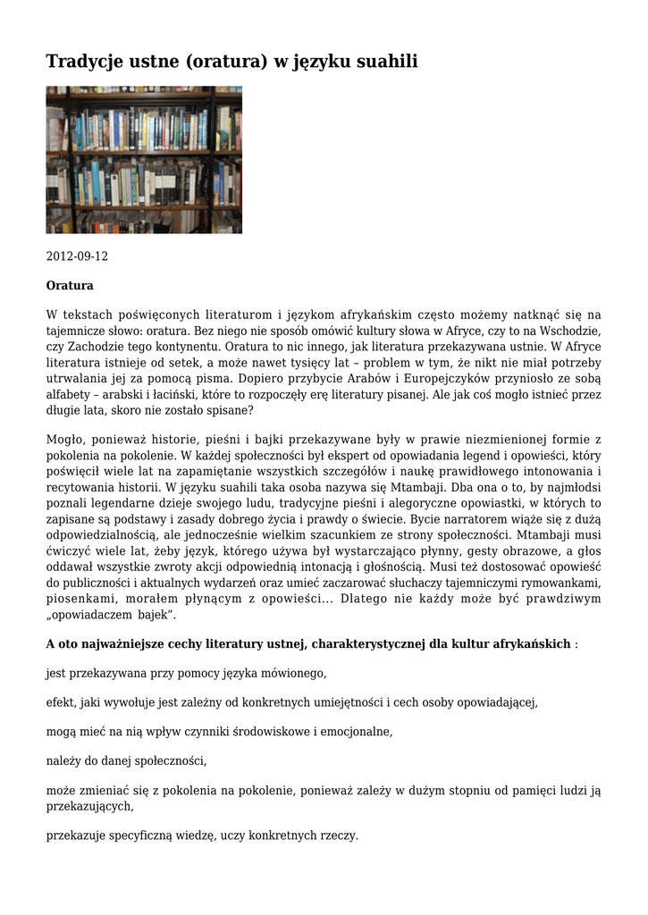 Tradycje ustne (oratura) w języku suahili 2012-09-12 Oratura W tekstach poświęconych literaturom i językom afrykańskim często możemy natknąć się na tajemnicze słowo: oratura. Bez niego nie sposób omówić kultury słowa w Afryce, czy to na Wschodzie, czy Zachodzie tego kontynentu. Oratura to nic innego, jak literatura przekazywana ustnie. W Afryce literatura istnieje od setek, a może nawet tysięcy lat – problem w tym, że nikt nie miał potrzeby utrwalania jej za pomocą pisma. Dopiero przybycie Arabów i Europejczyków przyniosło ze sobą alfabety – arabski i łaciński, które to rozpoczęły erę literatury pisanej. Ale jak coś mogło istnieć przez długie lata, skoro nie zostało spisane? Mogło, ponieważ historie, pieśni i bajki przekazywane były w prawie niezmienionej formie z pokolenia na pokolenie. W każdej społeczności był ekspert od opowiadania legend i opowieści, który poświęcił wiele lat na zapamiętanie wszystkich szczegółów i naukę prawidłowego intonowania i recytowania historii. W języku suahili taka osoba nazywa się Mtambaji. Dba ona o to, by najmłodsi poznali legendarne dzieje swojego ludu, tradycyjne pieśni i alegoryczne opowiastki, w których to zapisane są podstawy i zasady dobrego życia i prawdy o świecie. Bycie narratorem wiąże się z dużą odpowiedzialnością, ale jednocześnie wielkim szacunkiem ze strony społeczności. Mtambaji musi ćwiczyć wiele lat, żeby język, którego używa był wystarczająco płynny, gesty obrazowe, a głos oddawał wszystkie zwroty akcji odpowiednią intonacją i głośnością. Musi też dostosować opowieść do publiczności i aktualnych wydarzeń oraz umieć zaczarować słuchaczy tajemniczymi rymowankami, piosenkami, morałem płynącym z opowieści... Dlatego nie każdy może być prawdziwym „opowiadaczem bajek”. A oto najważniejsze cechy literatury ustnej, charakterystycznej dla kultur afrykańskich : jest przekazywana przy pomocy języka mówionego, efekt, jaki wywołuje jest zależny od konkretnych umiejętności i cech osoby opowiadającej, mogą mieć na nią wpływ czynniki środowiskowe i emocjonalne, należy do danej społeczności, może zmieniać się z pokolenia na pokolenie, ponieważ zależy w dużym stopniu od pamięci ludzi ją przekazujących, przekazuje specyficzną wiedzę, uczy konkretnych rzeczy. Afrykańska oratura spełnia też rozmaite funkcje: opowieści mogą służyć czystej rozrywce, ale często mają też funkcję edukacyjną – radzą, pokazują zachowania porządane w społeczności, uczą o otaczającym ludzi środowisku. Ważne jest również to, że wspólne słuchanie tradycyjnych przekazów integruje społeczność – utrwala wartości kulturowe, tworzy więź między odbiorcami, a także, co szczególnie ważne w przypadku rodzimych języków afrykańskich, rozwija znajomość literackiego języka, którego nie używa się przecież na co dzień. Literatura ustna jest też sposobem na zabicie czasu – godziny spędzone na słuchaniu magicznych opowieści płyną przecież o wiele szybciej... Literaturę ustną badacze dzielą na kilka gatunków. Najważniejsze z nich to: przysłowia, zagadki, piosenki, bajki i legendy. Poniżej znajdziecie ich krótkie charakterystyki i przykłady: Przysłowia (Methali) Jak w każdym chyba języku świata, w suahili ważną rolę pełnią przysłowia, czyli methali. Są to krótkie, zwykle jednozdaniowe wypowiedzi, zawsze występujące w jednej, utartej formie. Niosą ze sobą najprostsze i najważniejsze prawdy o świecie i ludziach. Przysłowia często są związane z dłuższymi opowieściami, pełniąc rolę ich morału lub podsumowania. Rola przysłów jest istotna z wielu powodów: ostrzegają one ludzi przed niebezpieczeństwem i nieodpowiednimi zachowaniami, nauczają o wielu rzeczach, są używane przez pisarzy i mówców, by przybliżyć poruszane przez nich problemy społeczności, udzielają porad, a przede wszystkim wiążą ze sobą lokalną społeczność – wiele z nich podkreśla ważność jedności, zgody i solidarności. Przysłowia są obecne w codziennym życiu mieszkańców Kenii i Tanzanii. Napisy na murach, samochodach, autobusach, a przede wszystkim ozdobnych chustach – kangach, na bieżąco przypominają wszystkim o mądrości poprzednich pokoleń. Zagadki (Vitendawili) Kolejną krótką formą literacką są tradycyjne zagadki. Nie dość, że pobudzają one do myślenia, to pełnia też funkcję socjalizującą. Podczas fascynujących pojedynków na słowne łamigłówki zawiązują się przyjaźnie na całe lata! Na zapytanie „Kitendawili?” („Zagadkę?”), odpowiadamy zwykle „Tega!” („Pewnie!”) i czekamy na intelektualne wyzwanie. Oto dwie z popularnych zagadek: Sisi ndugu wawili. Tunaishi tukikabiliana lakini hatuonani hata kidogo. // Jesteśmy dwoma braćmi. Mieszkamy po przeciwnej stronie drogi, ale nigdy się nie spotykamy. Macho // Oczy. Nina watoto wangu wanne, akiondoka moja, watatu wanaumwa. // Mam czworo dzieci, kiedy jedno odejdzie, reszta jest chora. Miguu minne ya kitanda. // Cztery nogi łóżka Łatwo wyobrazić sobie, jak ciężko jest wydedukować prawidłową odpowiedź! Piosenki (Nyimbo) Suahilijskie piosenki są śpiewane przy akompaniamencie instrumentów, na przykład bębnów. Mogą być wykonywane przez jedną, albo wiele osób – czasem każda z nich ma do wyśpiewania swoją własną rolę. Używa się też w nich charakterystycznego, poetyckiego języka, ważną rolę pełni właściwa intonacja i akcent. Piosenki podzielone są na zwrotki – beti i wersy – mishororo. Wiele z nich posiada refren, lub pojedynczy wers, który jest wielokrotnie powtarzany. Piosenki możemy podzielić przede wszystkim ze względu na okoliczności, w jakich są śpiewane. Mamy więc piosenki ślubne, w których gratuluje się Młodej Parze i życzy jej szczęścia i takie, śpiewane podczas rytuału inicjacji. Mamy rytmiczne hodiya, które śpiewa