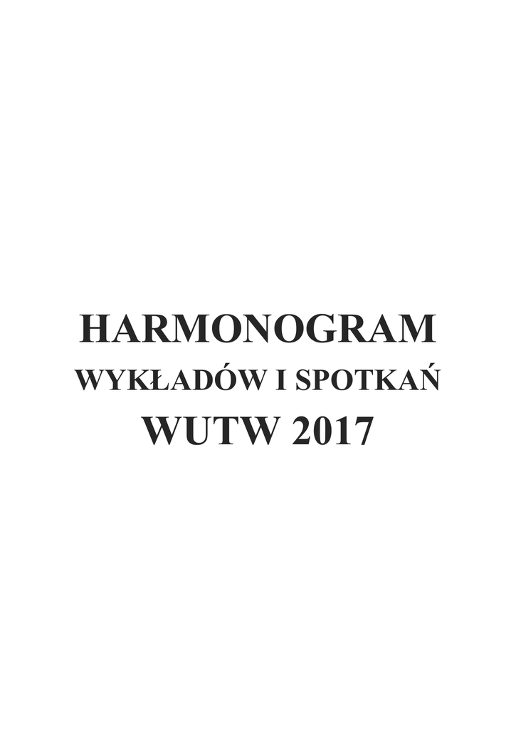 HARMONOGRAM WYKŁADÓW I SPOTKAŃ WUTW 2017 LUTY 2017 2 lutego 2017 /czwartek/ godz. 15.00 INAUGURACJA Centrum Kultury Wilanów, ul. Kolegiacka 3 Piosenkarka i aktor. Koncert Danuta Błażejczyk, Zbigniew Lesień WITAJ MAŁA GWIAZDKO 7 lutego 2017 /wtorek/ godz. 15.00 OSOBOWOŚCI Centrum Kultury Wilanów, ul. Kolegiacka 3 Wybitna aktorka. Nauczyciel akademicki. Autorka książek. Anna Seniuk Nietypowa baba ze mnie 8 lutego 2017 /środa/ godz. 12.00 i 12.30 SPACERY PO WARSZAWIE Telewizja Polska, ul. Woronicza 17 Zwiedzanie studiów TVP 9 lutego 2017 /czwartek/ godz. 14.00 JUBILEUSZ WILANOWSKIEGO UNIWERSYTETU Centrum Kultury Wilanów, ul. Kolegiacka 3 KONCERT. PARYSKI ROMANS 28 lutego 2017 /wtorek/ godz. 15.00 OSOBOWOŚCI Centrum Kultury Wilanów, ul. Kolegiacka 3 Wybitna aktorka teatralna i estradowa. Autorka książek Krystyna Sienkiewicz Skrawki MARZEC 2017 1 marca 2017 /środa/ godz. 11.00 SPACERY PO WARSZAWIE Muzeum Azji i Pacyfiku, ul. Solec 24 Muzeum Azji i Pacyfiku – ekspozycja stała 2 marca 2017 /czwartek/ godz. 15.00 Centrum Kultury Wilanów, ul. Kolegiacka 3 KONCERT ŻOŁNIERZE WYKLĘCI 6 marca 2017 /poniedziałek/ godz.10.00 WARSZTATY TWÓRCZE Centrum Kultury Wilanów, ul. Kolegiacka 3 Krystyna Kruszewska Kwiaty z krepiny 7 marca 2017 /wtorek/ godz. 13.45 HAGIOGRAFIA – ŻYWOT, MIT, HISTORIA Centrum Kultury Wilanów, ul. Kolegiacka 3 Doktorantka w Instytucie Literatury Polskiej UW. Anna Kaczor Św. Kinga – dlaczego obchodzimy lipcowe diesnatalis? 7 marca 2017 /wtorek/ godz. 15.00 HISTORIA Centrum Kultury Wilanów, ul. Kolegiacka 3 Dziennikarz. Reżyser. Grzegorz Polak Niezawodni przyjaciele. Nieznana pomoc Węgrów podczas II wojny światowej 8 marca 2017 /środa/ godz. 11.00 SPACERY PO WARSZAWIE Muzeum Geologii, ul. Rakowiecka 4 Muzeum Geologii – ekspozycja stała 9 marca 2017 /czwartek/ godz. 15.00 SZTUKA Centrum Kultury Wilanów, ul. Kolegiacka 3 Aktor. Reżyser. Animator kultury Dariusz Jakubowski Miłość i poezja 14 marca 2017 /wtorek/ godz. 13.45 HAGIOGRAFIA – ŻYWOT, MIT, HISTORIA Centrum Kultury Wilanów, ul. Kolegiacka 3 Doktorantka w Instytucie Literatury Polskiej UW. Anna Kaczor Św. Jadwiga – Król. Kobieta. Święta 14 marca 2017 /wtorek/ godz. 15.00 ZDROWIE Centrum Kultury Wilanów, ul. Kolegiacka 3 Instytut Biologii Doświadczalnej. Dr Grażyna Mosieniak Sposób na długowieczność – rozwiązany problem czy nieosiągalny cel 15 marca 2017 /środa/ godz. 13.00 SPACERY PO WARSZAWIE Muzeum Karykatury, ul. Kozia 11 Muzeum Karykatury – ekspozycja stała 16 marca 2017 /czwartek/ godz. 15.00 ROK WISŁY Centrum Kultury Wilanów, ul. Kolegiacka 3 Hydrolog. Ewa Bogdanowicz Rok Wisły I 21 marca 2017 /wtorek/ godz. 13.45 HAGIOGRAFIA – ŻYWOT, MIT, HISTORIA Centrum Kultury Wilanów, ul. Kolegiacka 3 Doktorantka w Instytucie Literatury Polskiej UW. Anna Kaczor Św. Jerzy w tradycji ikonograficznej Katolików i Prawosławnych 21 marca 2017 /wtorek/ godz. 15.00 PODRÓŻE Z KSIĄŻKĄ Centrum Kultury Wilanów, ul. Kolegiacka 3 Socjolożka i dziennikarka. Studium Europy Wschodniej UW. dr Ludwika Włodek Spisz czyli europejska historia na pograniczu polsko słowackim 22 marca 2017 /środa/ godz. 11.00 SPACERY PO WARSZAWIE Przewodnik, założyciel fundacji „Ja Wisła”. Przemek Pasek Tajemnice Saskiej Kępy 23 marca 2017 /czwartek/ godz. 15.00 PSYCHOLOGIA Centrum Kultury Wilanów, ul. Kolegiacka 3 Doktor psychologii i terapeutka uzależnień. Ewa Woydyłło - Osiatyńska Jak się kłócić i pozostać w zgodzie? 28 marca 2017 /wtorek/ godz. 13.45 HAGIOGRAFIA – ŻYWOT, MIT, HISTORIA Centrum Kultury Wilanów, ul. Kolegiacka 3 Doktorantka w Instytucie Literatury Polskiej UW. Anna Kaczor Kim byli Jezuici? – Stanisław Kostka 28 marca 2017/wtorek/ godz. 15.00 HISTORIA Centrum Kultury Wilanów, ul. Kolegiacka 3 Dyrektorka Archiwum Polskiej Akademii Nauk. dr hab. Hanna Krajewska Lux in arcana – najciekawsze dokumenty z tajnego archiwum watykańskiego 29 marca 2017 /środa/ godz. 11.00 SPACERY PO WARSZAWIE Muzeum Pragi, ul. Targowa 50/52 Muzeum Pragi – ekspozycja stała 30 marca 2017 /czwartek/ godz. 15.00 ROK KOŚCIUSZKI Centrum Kultury Wilanów, ul. Kolegiacka 3 Historyk, kustosz, przewodnik. Adrian Pogorzelski Tadeusz Kościuszko – bohater trzech narodó KWIECIEŃ 2017 3 kwietnia 2017 /poniedziałek/ godz. 10.00 WARSZTATY TWÓRCZE Centrum Kultury Wilanów, ul. Kolegiacka 3 Krystyna Kruszewska Biżuteria z koralików 4 kwietnia 2017 /wtorek/ godz. 13.45 HAGIOGRAFIA – ŻYWOT, MIT, HISTORIA Centrum Kultury Wilanów, ul. Kolegiacka 3 Doktorantka w Instytucie Literatury Polskiej UW. Anna Kaczor Mówili o nim, że przegrał, a to jest zwycięstwo. Zygmunt Szczęsny Feliński 4 kwietnia 2017 /wtorek/ godz. 15.00 PODRÓŻE Z KSIĄŻKĄ Centrum Kultury Wilanów, ul. Kolegiacka 3 Ambasador. Pisarz Leszek Szerepka Oblicza Białorusi 5 kwietnia 2017 /środa/ godz. 11.00 SPACERY PO WARSZAWIE Przewodnik, wykładowca, varsavianiska. Elżbieta Zatorowska Saska Kępa – ekskluzywna ulica Warszawy Spotkanie na placu Waszyngtona 6 kwietnia 2017 /czwartek/ godz. 15.00 ZDROWIE Centrum Kultury Wilanów, ul. Kolegiacka 3 Blogerka. Katarzyna Bosacka Wiem co jem 11 kwietnia 2017 /wtorek/ godz. 13.00 WIELKANOC Centrum Kultury Wilanów, ul. Kolegiacka 3 Spotkanie z okazji Świąt Wielkiej Nocy 20 kwietnia 2017 /czwartek/ godz. 15.00 ROK WISŁY Centrum Kultury Wilanów, ul. Kolegiacka 3 Hydrolog. Ewa Bogdanowicz Rok Wisły II 25 kwietnia 2017 /wtorek/ godz. 13.45 HAGIOGRAFIA – ŻYWOT, MIT, HISTORIA Centrum Kultury Wilanów, ul. Kolegiacka 3 Doktorantka w Instytucie Literatury Polskiej UW. Anna Kaczor Czasy wojny, czasy caratu – św. Urszula Ledóchowska 25 kwietnia 2017 /wtorek/ godz. 15.00 HISTORIA – ANTROPOLOGIA KULTURY Centrum Kultury Wilanów, ul. Kolegiacka 3 Kierownik Pracowni Antropologicznej Muzeum Archeologii. Maurycy Stanaszek Wampiry w średniowiecznej Polsce 26 kwietnia 2017 /środa/ godz. 11.00 SPACERY PO WARSZAWIE Przewodnik, założyciel fundacji „Ja Wis