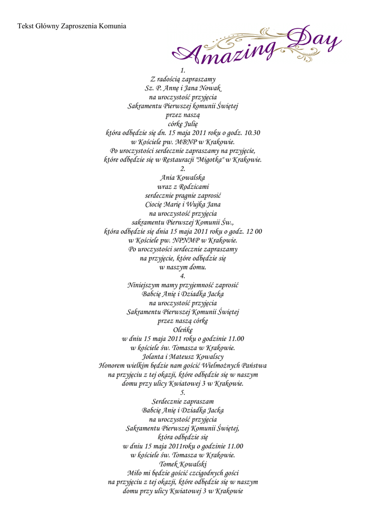 Tekst Główny Zaproszenia Komunia 1. Z radością zapraszamy Sz. P. Annę i Jana Nowak na uroczystość przyjęcia Sakramentu Pierwszej komunii Świętej przez naszą córkę Julię która odbędzie się dn. 15 maja 2011 roku o godz. 10.30 w Kościele pw. MBNP w Krakowie. Po uroczystości serdecznie zapraszamy na przyjęcie, które odbędzie się w Restauracji "Migotka" w Krakowie. 2. Ania Kowalska wraz z Rodzicami serdecznie pragnie zaprosić Ciocię Marię i Wujka Jana na uroczystość przyjęcia sakramentu Pierwszej Komunii Św., która odbędzie się dnia 15 maja 2011 roku o godz. 12 00 w Kościele pw. NPNMP w Krakowie. Po uroczystości serdecznie zapraszamy na przyjęcie, które odbędzie się w naszym domu. 4. Niniejszym mamy przyjemność zaprosić Babcię Anię i Dziadka Jacka na uroczystość przyjęcia Sakramentu Pierwszej Komunii Świętej przez naszą córkę Oleńkę w dniu 15 maja 2011 roku o godzinie 11.00 w kościele św. Tomasza w Krakowie. Jolanta i Mateusz Kowalscy Honorem wielkim będzie nam gościć Wielmożnych Państwa na przyjęciu z tej okazji, które odbędzie się w naszym domu przy ulicy Kwiatowej 3 w Krakowie. 5. Serdecznie zapraszam Babcię Anię i Dziadka Jacka na uroczystość przyjęcia Sakramentu Pierwszej Komunii Świętej, która odbędzie się w dniu 15 maja 2011roku o godzinie 11.00 w kościele św. Tomasza w Krakowie. Tomek Kowalski Miło mi będzie gościć czcigodnych gości na przyjęciu z tej okazji, które odbędzie się w naszym domu przy ulicy Kwiatowej 3 w Krakowie