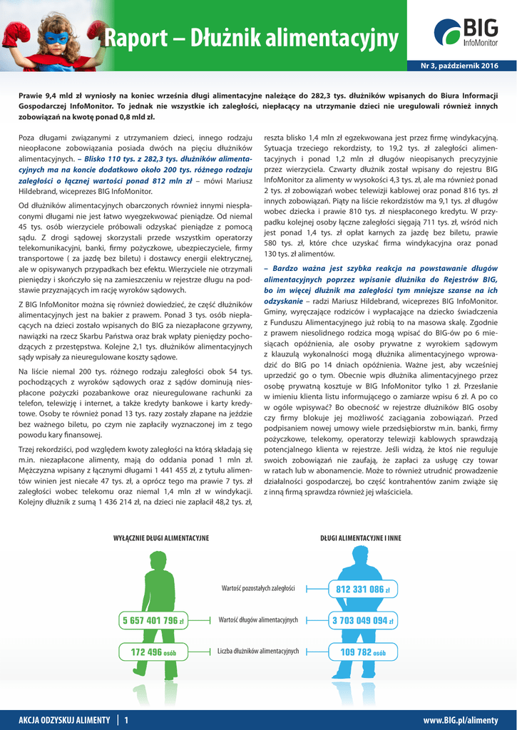 Raport – Dłużnik alimentacyjny Nr 3, październik 2016 Prawie 9,4 mld zł wyniosły na koniec września długi alimentacyjne należące do 282,3 tys. dłużników wpisanych do Biura Informacji Gospodarczej InfoMonitor. To jednak nie wszystkie ich zaległości, niepłacący na utrzymanie dzieci nie uregulowali również innych zobowiązań na kwotę ponad 0,8 mld zł. Poza długami związanymi z utrzymaniem dzieci, innego rodzaju nieopłacone zobowiązania posiada dwóch na pięciu dłużników alimentacyjnych. – Blisko 110 tys. z 282,3 tys. dłużników alimentacyjnych ma na koncie dodatkowo około 200 tys. różnego rodzaju zaległości o łącznej wartości ponad 812 mln zł – mówi Mariusz Hildebrand, wiceprezes BIG InfoMonitor. Od dłużników alimentacyjnych obarczonych również innymi niespłaconymi długami nie jest łatwo wyegzekwować pieniądze. Od niemal 45 tys. osób wierzyciele próbowali odzyskać pieniądze z pomocą sądu. Z drogi sądowej skorzystali przede wszystkim operatorzy telekomunikacyjni, banki, rmy pożyczkowe, ubezpieczyciele, rmy transportowe ( za jazdę bez biletu) i dostawcy energii elektrycznej, ale w opisywanych przypadkach bez efektu. Wierzyciele nie otrzymali pieniędzy i skończyło się na zamieszczeniu w rejestrze długu na podstawie przyznających im rację wyroków sądowych. Z BIG InfoMonitor można się również dowiedzieć, że część dłużników alimentacyjnych jest na bakier z prawem. Ponad 3 tys. osób niepłacących na dzieci zostało wpisanych do BIG za niezapłacone grzywny, nawiązki na rzecz Skarbu Państwa oraz brak wpłaty pieniędzy pochodzących z przestępstwa. Kolejne 2,1 tys. dłużników alimentacyjnych sądy wpisały za nieuregulowane koszty sądowe. Na liście niemal 200 tys. różnego rodzaju zaległości obok 54 tys. pochodzących z wyroków sądowych oraz z sądów dominują niespłacone pożyczki pozabankowe oraz nieuregulowane rachunki za telefon, telewizję i internet, a także kredyty bankowe i karty kredytowe. Osoby te również ponad 13 tys. razy zostały złapane na jeździe bez ważnego biletu, po czym nie zapłaciły wyznaczonej im z tego powodu kary nansowej. Trzej rekordziści, pod względem kwoty zaległości na którą składają się m.in. niezapłacone alimenty, mają do oddania ponad 1 mln zł. Mężczyzna wpisany z łącznymi długami 1 441 455 zł, z tytułu alimentów winien jest niecałe 47 tys. zł, a oprócz tego ma prawie 7 tys. zł zaległości wobec telekomu oraz niemal 1,4 mln zł w windykacji. Kolejny dłużnik z sumą 1 436 214 zł, na dzieci nie zapłacił 48,2 tys. zł, reszta blisko 1,4 mln zł egzekwowana jest przez rmę windykacyjną. Sytuacja trzeciego rekordzisty, to 19,2 tys. zł zaległości alimentacyjnych i ponad 1,2 mln zł długów nieopisanych precyzyjnie przez wierzyciela. Czwarty dłużnik został wpisany do rejestru BIG InfoMonitor za alimenty w wysokości 4,3 tys. zł, ale ma również ponad 2 tys. zł zobowiązań wobec telewizji kablowej oraz ponad 816 tys. zł innych zobowiązań. Piąty na liście rekordzistów ma 9,1 tys. zł długów wobec dziecka i prawie 810 tys. zł niespłaconego kredytu. W przypadku kolejnej osoby łączne zaległości sięgają 711 tys. zł, wśród nich jest ponad 1,4 tys. zł opłat karnych za jazdę bez biletu, prawie 580 tys. zł, które chce uzyskać rma windykacyjna oraz ponad 130 tys. zł alimentów. – Bardzo ważna jest szybka reakcja na powstawanie długów alimentacyjnych poprzez wpisanie dłużnika do Rejestrów BIG, bo im więcej dłużnik ma zaległości tym mniejsze szanse na ich odzyskanie – radzi Mariusz Hildebrand, wiceprezes BIG InfoMonitor. Gminy, wyręczające rodziców i wypłacające na dziecko świadczenia z Funduszu Alimentacyjnego już robią to na masowa skalę. Zgodnie z prawem niesolidnego rodzica mogą wpisać do BIG-ów po 6 miesiącach opóźnienia, ale osoby prywatne z wyrokiem sądowym z klauzulą wykonalności mogą dłużnika alimentacyjnego wprowadzić do BIG po 14 dniach opóźnienia. Ważne jest, aby wcześniej uprzedzić go o tym. Obecnie wpis dłużnika alimentacyjnego przez osobę prywatną kosztuje w BIG InfoMonitor tylko 1 zł. Przesłanie w imieniu klienta listu informującego o zamiarze wpisu 6 zł. A po co w ogóle wpisywać? Bo obecność w rejestrze dłużników BIG osoby czy rmy blokuje jej możliwość zaciągania zobowiązań. Przed podpisaniem nowej umowy wiele przedsiębiorstw m.in. banki, rmy pożyczkowe, telekomy, operatorzy telewizji kablowych sprawdzają potencjalnego klienta w rejestrze. Jeśli widzą, że ktoś nie reguluje swoich zobowiązań nie zaufają, że zapłaci za usługę czy towar w ratach lub w abonamencie. Może to również utrudnić prowadzenie działalności gospodarczej, bo część kontrahentów zanim zwiąże się z inną rmą sprawdza również jej właściciela. WYŁĄCZNIE DŁUGI ALIMENTACYJNE AKCJA ODZYSKUJ ALIMENTY DŁUGI ALIMENTACYJNE I INNE Wartość pozostałych zaległości 812 331 086 zł 5 657 401 796 zł Wartość długów alimentacyjnych 3 703 049 094 zł 172 496 osób Liczba dłużników alimentacyjnych 109 782 osób 1 www.BIG.pl/alimenty Raport – Dłużnik alimentacyjny Nr 3, październik 2016 Liczba dłużników alimentacyjnych i kwota zadłużenia w regionach Od 30 czerwca do 30 września liczba dłużników alimentacyjnych w bazie BIG InfoMonitor wzrosła o 3 479 i jest ich teraz w sumie 282 278. Kwota zadłużenia z tytułu niepłaconych alimentów zwiększyła się natomiast o 354 584 487 zł dochodząc do 9 360 450 890 zł. Wśród dłużników alimentacyjnych zdecydowanie dominują mężczyźni. Stanowią ponad 95 proc. osób wpisanych do bazy BIG z tego tytułu. Najczęściej na dzieci nie płacą ojcowie w wieku 35-44 lat – prawie 37 proc. oraz w wieku 45-54 lat – ponad 30 proc. LICZBA DŁUŻNIKÓW ALIMENTACYJNYCH W PODZIALE NA PŁEĆ I WIEK 98 004 5 951 81 355 3 751 47 380 2 703 35 945 922 3 352 30 2 713 163 18-24 lat 25–34 la