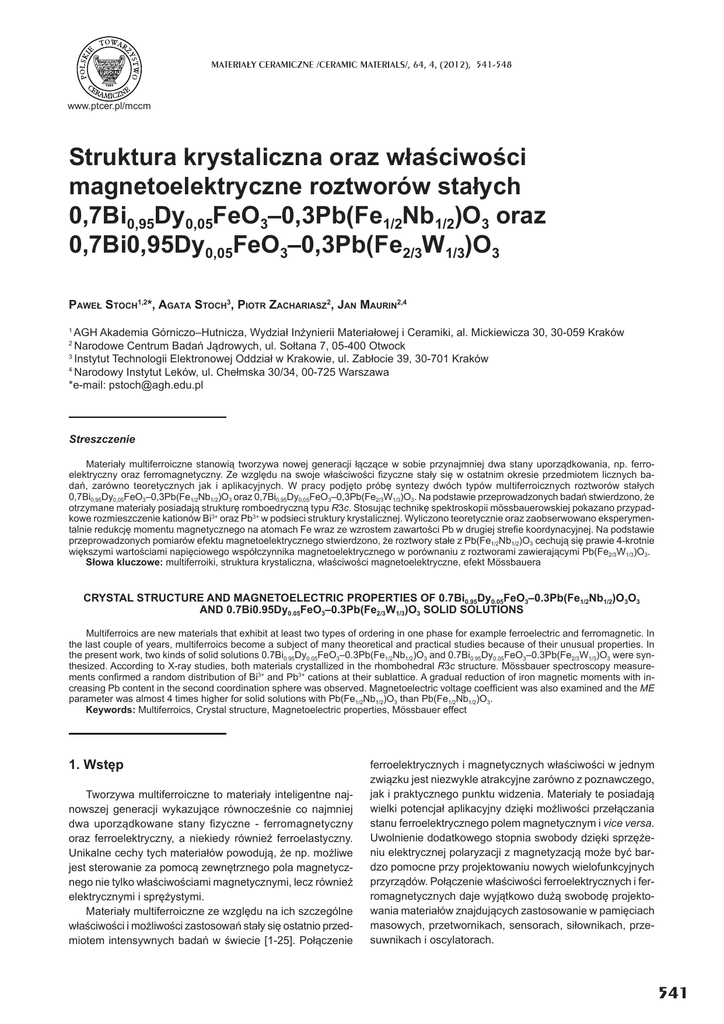 MATERIA£Y CERAMICZNE /CERAMIC MATERIALS/, 64, 4, (2012), 541-548 www.ptcer.pl/mccm Struktura krystaliczna oraz wáaĞciwoĞci magnetoelektryczne roztworów staáych 0,7Bi0,95Dy0,05FeO3–0,3Pb(Fe1/2Nb1/2)O3 oraz 0,7Bi0,95Dy0,05FeO3–0,3Pb(Fe2/3W1/3)O3 PAWEà STOCH1,2*, AGATA STOCH3, PIOTR ZACHARIASZ2, JAN MAURIN2,4 1 AGH Akademia Górniczo–Hutnicza, Wydziaá InĪynierii Materiaáowej i Ceramiki, al. Mickiewicza 30, 30-059 Kraków Narodowe Centrum BadaĔ Jądrowych, ul. Soátana 7, 05-400 Otwock 3 Instytut Technologii Elektronowej Oddziaá w Krakowie, ul. Zabáocie 39, 30-701 Kraków 4 Narodowy Instytut Leków, ul. Cheámska 30/34, 00-725 Warszawa *e-mail: [email protected] 2 Streszczenie Materiaáy multiferroiczne stanowią tworzywa nowej generacji áączące w sobie przynajmniej dwa stany uporządkowania, np. ferroelektryczny oraz ferromagnetyczny. Ze wzglĊdu na swoje wáaĞciwoĞci ¿zyczne staáy siĊ w ostatnim okresie przedmiotem licznych badaĔ, zarówno teoretycznych jak i aplikacyjnych. W pracy podjĊto próbĊ syntezy dwóch typów multiferroicznych roztworów staáych 0,7Bi0,95Dy0,05FeO3–0,3Pb(Fe1/2Nb1/2)O3 oraz 0,7Bi0,95Dy0,05FeO3–0,3Pb(Fe2/3W1/3)O3. Na podstawie przeprowadzonych badaĔ stwierdzono, Īe otrzymane materiaáy posiadają strukturĊ romboedryczną typu R3c. Stosując technikĊ spektroskopii mössbauerowskiej pokazano przypadkowe rozmieszczenie kationów Bi3+ oraz Pb3+ w podsieci struktury krystalicznej. Wyliczono teoretycznie oraz zaobserwowano eksperymentalnie redukcjĊ momentu magnetycznego na atomach Fe wraz ze wzrostem zawartoĞci Pb w drugiej stre¿e koordynacyjnej. Na podstawie przeprowadzonych pomiarów efektu magnetoelektrycznego stwierdzono, Īe roztwory staáe z Pb(Fe1/2Nb1/2)O3 cechują siĊ prawie 4-krotnie wiĊkszymi wartoĞciami napiĊciowego wspóáczynnika magnetoelektrycznego w porównaniu z roztworami zawierającymi Pb(Fe2/3W1/3)O3. Sáowa kluczowe: multiferroiki, struktura krystaliczna, wáaĞciwoĞci magnetoelektryczne, efekt Mössbauera CRYSTAL STRUCTURE AND MAGNETOELECTRIC PROPERTIES OF 0.7Bi0.95Dy0.05FeO3–0.3Pb(Fe1/2Nb1/2)O3O3 AND 0.7Bi0.95Dy0.05FeO3–0.3Pb(Fe2/3W1/3)O3 SOLID SOLUTIONS Multiferroics are new materials that exhibit at least two types of ordering in one phase for example ferroelectric and ferromagnetic. In the last couple of years, multiferroics become a subject of many theoretical and practical studies because of their unusual properties. In the present work, two kinds of solid solutions 0.7Bi0.95Dy0.05FeO3–0.3Pb(Fe1/2Nb1/2)O3 and 0.7Bi0.95Dy0.05FeO3–0.3Pb(Fe2/3W1/3)O3 were synthesized. According to X-ray studies, both materials crystallized in the rhombohedral R3c structure. Mössbauer spectroscopy measurements con¿rmed a random distribution of Bi3+ and Pb3+ cations at their sublattice. A gradual reduction of iron magnetic moments with increasing Pb content in the second coordination sphere was observed. Magnetoelectric voltage coef¿cient was also examined and the ME parameter was almost 4 times higher for solid solutions with Pb(Fe1/2Nb1/2)O3 than Pb(Fe1/2Nb1/2)O3. Keywords: Multiferroics, Crystal structure, Magnetoelectric properties, Mössbauer effect 1. WstĊp Tworzywa multiferroiczne to materiaáy inteligentne najnowszej generacji wykazujące równoczeĞnie co najmniej dwa uporządkowane stany ¿zyczne - ferromagnetyczny oraz ferroelektryczny, a niekiedy równieĪ ferroelastyczny. Unikalne cechy tych materiaáów powodują, Īe np. moĪliwe jest sterowanie za pomocą zewnĊtrznego pola magnetycznego nie tylko wáaĞciwoĞciami magnetycznymi, lecz równieĪ elektrycznymi i sprĊĪystymi. Materiaáy multiferroiczne ze wzglĊdu na ich szczególne wáaĞciwoĞci i moĪliwoĞci zastosowaĔ staáy siĊ ostatnio przedmiotem intensywnych badaĔ w Ğwiecie [1-25]. Poáączenie ferroelektrycznych i magnetycznych wáaĞciwoĞci w jednym związku jest niezwykle atrakcyjne zarówno z poznawczego, jak i praktycznego punktu widzenia. Materiaáy te posiadają wielki potencjaá aplikacyjny dziĊki moĪliwoĞci przeáączania stanu ferroelektrycznego polem magnetycznym i vice versa. Uwolnienie dodatkowego stopnia swobody dziĊki sprzĊĪeniu elektrycznej polaryzacji z magnetyzacją moĪe byü bardzo pomocne przy projektowaniu nowych wielofunkcyjnych przyrządów. Poáączenie wáaĞciwoĞci ferroelektrycznych i ferromagnetycznych daje wyjątkowo duĪą swobodĊ projektowania materiaáów znajdujących zastosowanie w pamiĊciach masowych, przetwornikach, sensorach, siáownikach, przesuwnikach i oscylatorach. 541 P. STOCH, A. STOCH, P. ZACHARIASZ, J. MAURIN Materiaáy multiferroiczne, pomimo Īe w ostatnich latach byáy przedmiotem licznych publikacji, zwáaszcza zagranicznych, pozostawiają nadal szerokie pole do dalszych badaĔ. Dotyczy to zarówno teoretycznego wyjaĞnienia skomplikowanych zjawisk ¿zycznych zachodzących w tych materiaáach, jak i praktycznego doboru skáadów i warunków wytwarzania, zmierzającego do ksztaátowania wáaĞciwoĞci dostosowanych do konkretnych zastosowaĔ. Istnieją trudnoĞci z bezpoĞrednim wykorzystaniem jednofazowych związków multiferroicznych, związane z niewielką ich liczbą, zbyt niskimi temperaturami Curie i Neela oraz ze zbyt sáabym sprzĊĪeniem elektromagnetycznym. SpoĞród znanych jednofazowych multiferroików BiFeO3 jest jednym z najbardziej obiecujących kandydatów ze wzglĊdu na wystĊpowanie wáaĞciwoĞci multiferroicznych w temperaturze pokojowej (przemiana ferroelektryczna nastĊpuje w 1100 K, a przemiana antyferromagnetyczna w 640 K) [5]. Do niekorzystnych cech BiFeO3 naleĪy jednak tendencja do tworzenia siĊ wielofazowego skáadu przy syntezie, niestabilnoĞü struktury i duĪy prąd upáywu. PoprawĊ tych wáaĞciwoĞci moĪna uzyskaü przez podstawianie czĊĞci jonów Bi przez inne jony o tej samej wartoĞciowoĞci, np. La, Pr, Dy, oraz jonów Fe przez np. Sc [5, 6], jak równieĪ poprzez tworzenie roztworów staáych z ferroelektrykami o stabilnej struk