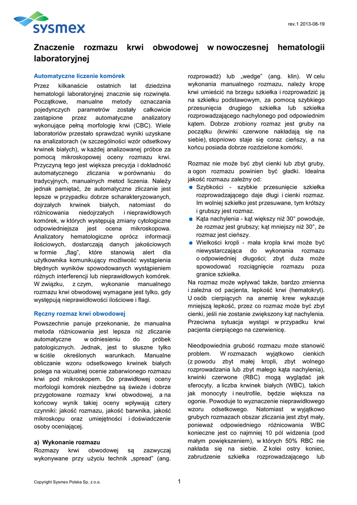 rev.1 2013-08-19 Znaczenie rozmazu laboratoryjnej krwi obwodowej Automatyczne liczenie komórek hematologii rozprowadź) lub „wedge” (ang. klin). W celu wykonania manualnego rozmazu, należy kropę krwi umieścić na brzegu szkiełka i rozprowadzić ją na szkiełku podstawowym, za pomocą szybkiego przesunięcia drugiego szkiełka lub szkiełka rozprowadzającego nachylonego pod odpowiednim kątem. Dobrze zrobiony rozmaz jest gruby na początku (krwinki czerwone nakładają się na siebie), stopniowo staje się coraz cieńszy, a na końcu posiada dobrze rozdzielone komórki. Przez kilkanaście ostatnich lat dziedzina hematologii laboratoryjnej znacznie się rozwinęła. Początkowe, manualne metody oznaczania pojedynczych parametrów zostały całkowicie zastąpione przez automatyczne analizatory wykonujące pełną morfologię krwi (CBC). Wiele laboratoriów przestało sprawdzać wyniki uzyskane na analizatorach (w szczególności wzór odsetkowy krwinek białych), w każdej analizowanej próbce za pomocą mikroskopowej oceny rozmazu krwi. Przyczyną tego jest większa precyzja i dokładność automatycznego zliczania w porównaniu do tradycyjnych, manualnych metod liczenia. Należy jednak pamiętać, że automatyczne zliczanie jest lepsze w przypadku dobrze scharakteryzowanych, dojrzałych krwinek białych, natomiast do różnicowania niedojrzałych i nieprawidłowych komórek, w których występują zmiany cytologiczne odpowiedniejsza jest ocena mikroskopowa. Analizatory hematologiczne oprócz informacji ilościowych, dostarczają danych jakościowych w formie „flag”, które stanowią alert dla użytkownika komunikujący możliwość wystąpienia błędnych wyników spowodowanych wystąpieniem różnych interferencji lub nieprawidłowych komórek. W związku, z czym, wykonanie manualnego rozmazu krwi obwodowej wymagane jest tylko, gdy występują nieprawidłowości ilościowe i flagi. Rozmaz nie może być zbyt cienki lub zbyt gruby, a ogon rozmazu powinien być gładki. Idealna jakość rozmazu zależny od: Szybkości - szybkie przesunięcie szkiełka rozprowadzającego daje długi i cienki rozmaz. Im wolniej szkiełko jest przesuwane, tym krótszy i grubszy jest rozmaz. Kąta nachylenia - kąt większy niż 30° powoduje, że rozmaz jest grubszy; kąt mniejszy niż 30°, że rozmaz jest cieńszy. Wielkości kropli - mała kropla krwi może być niewystarczająca do wykonania rozmazu o odpowiedniej długości; zbyt duża może spowodować rozciągnięcie rozmazu poza granice szkiełka. Na rozmaz może wpływać także, bardzo zmienna i zależna od pacjenta, lepkość krwi (hematokryt). U osób cierpiących na anemię krew wykazuje mniejszą lepkość, przez co rozmaz może być zbyt cienki, jeśli nie zostanie zwiększony kąt nachylenia. Przeciwna sytuacja wystąpi w przypadku krwi pacjenta cierpiącego na czerwienicę. Ręczny rozmaz krwi obwodowej Powszechnie panuje przekonanie, że manualna metoda różnicowania jest lepsza niż zliczanie automatyczne w odniesieniu do próbek patologicznych. Jednak, jest to słuszne tylko w ściśle określonych warunkach. Manualne obliczanie wzoru odsetkowego krwinek białych polega na wizualnej ocenie zabarwionego rozmazu krwi pod mikroskopem. Do prawidłowej oceny morfologii komórek niezbędne są świeże i dobrze przygotowane rozmazy krwi obwodowej, a na końcowy wynik takiej oceny wpływają cztery czynniki: jakość rozmazu, jakość barwnika, jakość mikroskopu oraz umiejętności i doświadczenie osoby oceniającej. Nieodpowiednia grubość rozmazu może stanowić problem. W rozmazach wyjątkowo cienkich (z powodu zbyt małej kropli, zbyt wolnego rozprowadzania lub zbyt małego kąta nachylenia), krwinki czerwone (RBC) mogą wyglądać jak sferocyty, a liczba krwinek białych (WBC), takich jak monocyty i neutrofile, będzie większa na ogonie. Powoduje to wyznaczenie nieprawidłowego wzoru odsetkowego. Natomiast w wyjątkowo grubych rozmazach obszar zliczania jest zbyt mały, ponieważ odpowiedniego różnicowania WBC konieczne jest co najmniej 10 pól widzenia (pod małym powiększeniem), w których 50% RBC nie nakłada się na siebie. Z kolei ostry koniec, zabrudzenie szkiełka rozprowadzającego lub a) Wykonanie rozmazu Rozmazy krwi obwodowej są zazwyczaj wykonywane przy użyciu technik „spread” (ang. Copyright Sysmex Polska Sp. z o.o. w nowoczesnej 1 rev.1 2013-08-23 działa zarówno, jako rozpuszczalnik jak i środek utrwalający. akumulacja WBC (z powodu zbyt wolnego rozprowadzania lub bardzo wysokiej liczby WBC) powodują, że rozmaz kończy się obszernym lub postrzępionym ogonem. Element komórkowy Kolor Jądro chromatyna jąderko fioletowy jasny niebieski Cytoplazma erytrocyt retikulocyt limfocyt monocyt neutrofil eozynofil bazofil ciemny róż szaro-niebieski niebieski szaro-niebieski różowy różowy niebieski Ziarnistości obojętnochłonne (toksyczne) kwasochłonne fioletowy (ciemny niebieski) pomarańczowoczerwony fioletowo-czarny fioletowy a) b) Ryc. 1 a) rozmaz ręczny o słabej jakości b) rozmaz automatyczny o dobrej jakości zasadochłonne płytkowe b) Barwienie rozmazu W hematologii powszechnie stosowane jest barwienie Romanowskiego lub jego pochodne, takie jak Wright, Wright-Giemsa i May-GrunwaldGiemsa. Wtręty Tab. 1 Zabarwienie elementów komórkowych w wyniku barwienia Romanowskiego (Dacie and Lewis, Practical i Haematology ) ii. Czynniki powodujące błędne barwienie Złe barwienie szkiełka może być wywołane przez wiele czynników i objawia się tym, że szkiełko jest zbyt ciemne lub zbyt blade, zbyt niebieskie lub zbyt różowe, ziarnistości są bardzo ciemne lub niewidoczne, tło jest niebieskie lub widoczne są złogi barwnika. Różne struktury komórkowe mają różne powinowactwo do barwników – DNA łączy się natychmiast, wolniej wiąże się RNA, a najwolniej hemoglobina. Dlatego, do jakościowo dobrego wyniku konieczny jest prawidłowy czas barwienia. Niezbędne jest równie