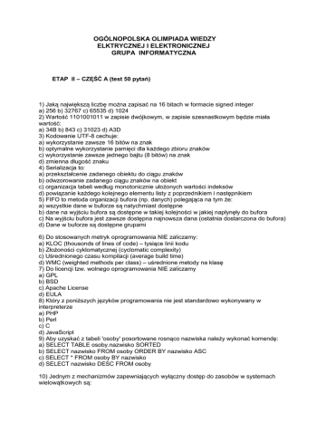 OGÓLNOPOLSKA OLIMPIADA WIEDZY ELKTRYCZNEJ I ELEKTRONICZNEJ GRUPA INFORMATYCZNA ETAP II – CZĘŚĆ A (test 50 pytań) 1) Jaką największą liczbę można zapisać na 16 bitach w formacie signed integer a) 256 b) 32767 c) 65535 d) 1024 2) Wartość 1101001011 w zapisie dwójkowym, w zapisie szesnastkowym będzie miała wartość: a) 34B b) 843 c) 31023 d) A3D 3) Kodowanie UTF-8 cechuje: a) wykorzystanie zawsze 16 bitów na znak b) optymalne wykorzystanie pamięci dla każdego zbioru znaków c) wykorzystanie zawsze jednego bajtu (8 bitów) na znak d) zmienna długość znaku 4) Serializacja to: a) przekształcenie zadanego obiektu do ciągu znaków b) odwzorowanie zadanego ciągu znaków na obiekt c) organizacja tabeli według monotonicznie ułożonych wartości indeksów d) powiązanie każdego kolejnego elementu listy z poprzednikiem i następnikiem 5) FIFO to metoda organizacji bufora (np. danych) polegająca na tym że: a) wszystkie dane w buforze są natychmiast dostępne b) dane na wyjściu bufora są dostępne w takiej kolejności w jakiej napłynęły do bufora c) Na wyjściu bufora jest zawsze dostępna najnowsza dana (ostatnia dostarczona do bufora) d) Dane w buforze są dostępne grupami 6) Do stosowanych metryk oprogramowania NIE zaliczamy: a) KLOC (thousonds of lines of code) – tysiące linii kodu b) Złożoności cyklomatycznej (cyclomatic complexity) c) Uśrednionego czasu kompilacji (average build time) d) WMC (weighted methods per class) – uśrednione metody na klasę 7) Do licencji tzw. wolnego oprogramowania NIE zaliczamy a) GPL b) BSD c) Apache License d) EULA 8) Który z poniższych języków programowania nie jest standardowo wykonywany w interpreterze a) PHP b) Perl c) C d) JavaScript 9) Aby uzyskać z tabeli 'osoby' posortowane rosnąco nazwiska należy wykonać komendę: a) SELECT TABLE osoby.nazwisko SORTED b) SELECT nazwisko FROM osoby ORDER BY nazwisko ASC c) SELECT * FROM osoby BY nazwisko d) SELECT nazwisko DESC FROM osoby 10) Jednym z mechanizmów zapewniających wyłączny dostęp do zasobów w systemach wielowątkowych są: a) semafory b) wskaźniki c) klucze d) klasy 11) Do wzorców projektowych NIE NALEŻY a) fabryka abstrakcyjna (abstract factory) b) singleton c) dekorator d) konstruktor 12) Elementem kluczowym programowania obiektowego NIE JEST a) klasa b) dziedziczenie c) proces d) polimorfizm 13) Objective-C jest językiem używanym przede wszystkim w środowisku a) Mainframe b) OS X / iOS c) AIX d) Windows 14) Językiem programowania szczególnie przystosowanym do tworzenia programów w systemach czasu rzeczywistego jest: a) ADA b) Fortran c) Prolog d) SQL 15) Procesory określane jako 8-bitowe generalnie NIE posiadają: a) 8 bitowej szyny danych b) 8 bitowej szyny adresowej c) 8 bitowych rejestrów d) 8 bitowej arytmetyki 16) W przypadku macierzy RAID-1 składającej się z 10 dysków o pojemności 2TB każdy, sumaryczna pojemność macierzy to: a) 2TB b) 10TB c) 18TB d) 20TB 17) Przy pomocy wskaźnika o długości 32bit można zaadresować: a) 32TB b) 4GB c) 16MB d) 64KB 18) Architekturę CPU i GPU najlepiej można opisać jako: a) CPU: SISD, GPU: SIMD b) CPU: MISD, GPU: MIMD c) CPU: SIMD, GPU: SISD d) CPU: MIMD, GPU: SIMD 19) Standardem komunikacyjnym/interfejsem wykorzystywanym do komunikacji pomiędzy komputerem a urządzeniami zewnętrznymi NIE JEST: a) RS 232 b) PCI c) USB d) PS/2 20) Najczęstszym problemem w architekturach wieloprocesorowych ograniczającym ich wydajność jest: a) Różnice w taktowaniu procesorów b) Zrównoleglenie wykonywania oprogramowania c) Ograniczenie przepustowości magistrali danych d) Ilość niezbędnych do przetworzenia komunikatów systemowych pomiędzy procesorami 21) W przypadku procesorów wielordzeniowych, do współdzielonych (przez różne CPU) elementów architektury NIE NALEŻY: a) L1 Cache b) L2 Cache c) RAM d) FSB 22) Który z poniższych NIE JEST protokołem komunikacyjnym używanym w sieciach komputerowych a) ARP b) TCP c) ICMP d) ASX 23) Początkowe nawiązanie połączenia wg protokołu TCP (ang. handshake) wymaga wymiany następującej ilości komunikatów: a) 2 (SYN, ACK) b) 3 (SYN, SYN-ACK, ACK) c) 4 (SYN, SYN, ACK, SYN-ACK) d) 5 (SYN, ACK, SYN, ACK, CON) 24) Typowa topologia wykorzystywana we współczesnych sieciach lokalnych to: a) magistrala b) pierścień c) siatka d) gwiazda 25) Komunikacja przy użyciu protokołu HTTPS standardowo odbywa się na porcie: a) 80 b) 8080 c) 443 d) 22 26) Adresacją prywatną (preferowaną do stosowania w sieciach lokalnych), do której pakiety nie są routowane w sieci Internet jest m.in. sieć adresów: a) 168.192.x.x b) 10.x.x.x c) 16.0.x.x d) 170.x.x.x 27) Protokołem służącym do automatycznego przydziału adresów IP w sieci lokalnej jest: a) DHCP b) DNS c) WINS d) HTTP 28) Protokół IP v6 wykorzystuje adresację: a) 32-bitową b) 64-bitową c) 128-bitową d) 256-bitową 29) Aktualnie obowiązującym (zatwierdzonym przez W3C) standardem HTML jest: a) 3.2 b) 4.01 c) 5 d) 6 30) W przypadku serwisów internetowych, technologią do tworzenia programów wykonywanych po stronie klienta jest: a) JavaScrpt b) PHP c) ASP d) JSP 31) Specyficznym protokołem do prezentacji treści na urządzeniach mobilnych, obecnie rzadko już używanym, a zaprojektowanym pod kątem ograniczenia ilości przesyłanych danych był: a) WEP b) SSH c) IP d) WAP 32) Ilość (procentowa) osób korzystających z internetu w stosunku do całej populacji globu to obecnie około: a) 10% b) 20% c) 40% d) 60% 33) Protokół HTTP według modelu OSI/ISO należy do warstwy: a) 4 b) 5 c) 6 d) 7 34) Obiekt dokumentu HTML dedykowany do definiowania danych przesyłanych od użytkownika na serwer w ramach zapytania HTTP jest oznaczony tagiem: a) <form> b) <hr> c) <body> d) <img> 35) AdWords, podstawowa i najbardziej powszechna usługa reklamowa oferowana przez Google, bazuje przede wszystkim na metodzie rozliczania reklam: a) CPT (and. Cost per Thousand) – koszt za tysiąc wyświetleń r