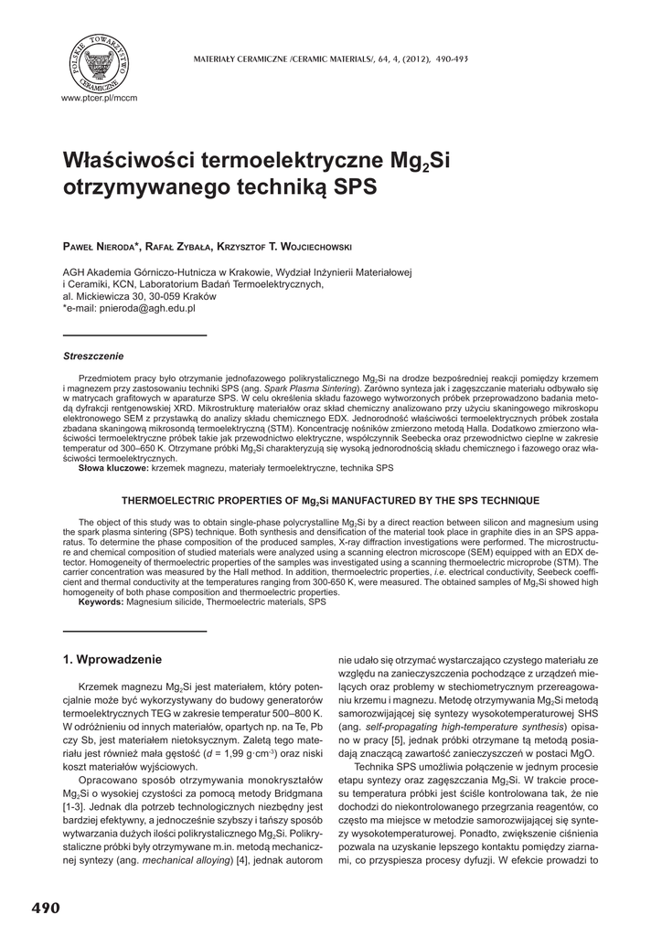 MATERIA£Y CERAMICZNE /CERAMIC MATERIALS/, 64, 4, (2012), 490-493 www.ptcer.pl/mccm WáaĞciwoĞci termoelektryczne Mg2Si otrzymywanego techniką SPS PAWEà NIERODA*, RAFAà ZYBAàA, KRZYSZTOF T. WOJCIECHOWSKI AGH Akademia Górniczo-Hutnicza w Krakowie, Wydziaá InĪynierii Materiaáowej i Ceramiki, KCN, Laboratorium BadaĔ Termoelektrycznych, al. Mickiewicza 30, 30-059 Kraków *e-mail: [email protected] Streszczenie Przedmiotem pracy byáo otrzymanie jednofazowego polikrystalicznego Mg2Si na drodze bezpoĞredniej reakcji pomiĊdzy krzemem i magnezem przy zastosowaniu techniki SPS (ang. Spark Plasma Sintering). Zarówno synteza jak i zagĊszczanie materiaáu odbywaáo siĊ w matrycach gra¿towych w aparaturze SPS. W celu okreĞlenia skáadu fazowego wytworzonych próbek przeprowadzono badania metodą dyfrakcji rentgenowskiej XRD. MikrostrukturĊ materiaáów oraz skáad chemiczny analizowano przy uĪyciu skaningowego mikroskopu elektronowego SEM z przystawką do analizy skáadu chemicznego EDX. JednorodnoĞü wáaĞciwoĞci termoelektrycznych próbek zostaáa zbadana skaningową mikrosondą termoelektryczną (STM). KoncentracjĊ noĞników zmierzono metodą Halla. Dodatkowo zmierzono wáaĞciwoĞci termoelektryczne próbek takie jak przewodnictwo elektryczne, wspóáczynnik Seebecka oraz przewodnictwo cieplne w zakresie temperatur od 300–650 K. Otrzymane próbki Mg2Si charakteryzują siĊ wysoką jednorodnoĞcią skáadu chemicznego i fazowego oraz wáaĞciwoĞci termoelektrycznych. Sáowa kluczowe: krzemek magnezu, materiaáy termoelektryczne, technika SPS THERMOELECTRIC PROPERTIES OF Mg2Si MANUFACTURED BY THE SPS TECHNIQUE The object of this study was to obtain single-phase polycrystalline Mg2Si by a direct reaction between silicon and magnesium using the spark plasma sintering (SPS) technique. Both synthesis and densi¿cation of the material took place in graphite dies in an SPS apparatus. To determine the phase composition of the produced samples, X-ray diffraction investigations were performed. The microstructure and chemical composition of studied materials were analyzed using a scanning electron microscope (SEM) equipped with an EDX detector. Homogeneity of thermoelectric properties of the samples was investigated using a scanning thermoelectric microprobe (STM). The carrier concentration was measured by the Hall method. In addition, thermoelectric properties, i.e. electrical conductivity, Seebeck coef¿cient and thermal conductivity at the temperatures ranging from 300-650 K, were measured. The obtained samples of Mg2Si showed high homogeneity of both phase composition and thermoelectric properties. Keywords: Magnesium silicide, Thermoelectric materials, SPS 1. Wprowadzenie Krzemek magnezu Mg2Si jest materiaáem, który potencjalnie moĪe byü wykorzystywany do budowy generatorów termoelektrycznych TEG w zakresie temperatur 500–800 K. W odróĪnieniu od innych materiaáów, opartych np. na Te, Pb czy Sb, jest materiaáem nietoksycznym. Zaletą tego materiaáu jest równieĪ maáa gĊstoĞü (d = 1,99 g·cm-3) oraz niski koszt materiaáów wyjĞciowych. Opracowano sposób otrzymywania monokrysztaáów Mg2Si o wysokiej czystoĞci za pomocą metody Bridgmana [1-3]. Jednak dla potrzeb technologicznych niezbĊdny jest bardziej efektywny, a jednoczeĞnie szybszy i taĔszy sposób wytwarzania duĪych iloĞci polikrystalicznego Mg2Si. Polikrystaliczne próbki byáy otrzymywane m.in. metodą mechanicznej syntezy (ang. mechanical alloying) [4], jednak autorom 490 nie udaáo siĊ otrzymaü wystarczająco czystego materiaáu ze wzglĊdu na zanieczyszczenia pochodzące z urządzeĔ mielących oraz problemy w stechiometrycznym przereagowaniu krzemu i magnezu. MetodĊ otrzymywania Mg2Si metodą samorozwijającej siĊ syntezy wysokotemperaturowej SHS (ang. self-propagating high-temperature synthesis) opisano w pracy [5], jednak próbki otrzymane tą metodą posiadają znaczącą zawartoĞü zanieczyszczeĔ w postaci MgO. Technika SPS umoĪliwia poáączenie w jednym procesie etapu syntezy oraz zagĊszczania Mg2Si. W trakcie procesu temperatura próbki jest ĞciĞle kontrolowana tak, Īe nie dochodzi do niekontrolowanego przegrzania reagentów, co czĊsto ma miejsce w metodzie samorozwijającej siĊ syntezy wysokotemperaturowej. Ponadto, zwiĊkszenie ciĞnienia pozwala na uzyskanie lepszego kontaktu pomiĊdzy ziarnami, co przyspiesza procesy dyfuzji. W efekcie prowadzi to WàAĝCIWOĝCI TERMOELEKTRYCZNE Mg2Si OTRZYMYWANEGO TECHNIKĄ SPS do skrócenia procesu syntezy oraz lepszej homogenizacji materiaáu. Skrócenie czasu syntezy jest korzystne dla obniĪenia zawartoĞci niepoĪądanych zanieczyszczeĔ MgO. Autorzy prac [6-8] podjĊli próbĊ otrzymania Mg2Si przy zastosowaniu techniki SPS. Jednak zaprezentowane przez nich wyniki dotyczą tylko analizy skáadu fazowego, bez podania charakterystyki wáaĞciwoĞci termoelektrycznych otrzymanych materiaáów. PoniewaĪ w trakcie syntezy nastĊpuje ubytek metalicznego magnezu (prawdopodobnie z powodu jego utleniania lub parowania) Yang [6, 7] uwaĪa, Īe w celu przygotowania jednorodnego materiaáu, konieczne jest uĪycie jego nadmiarowej iloĞci (10% wag.) w stosunku do skáadu stechiometrycznego. Wydaje siĊ jednak, Īe takie podejĞcie nie pozwala na otrzymanie materiaáów o wystarczająco duĪej czystoĞci i niskiej koncentracji noĞników prądu wymaganej dla czystych materiaáów póáprzewodnikowych. Celem naszej pracy jest opracowanie warunków otrzymywania, przy zastosowaniu techniki SPS, czystego polikrystalicznego krzemku magnezu Mg2Si o parametrach umoĪliwiających przeprowadzenie w nastĊpnym etapie kontrolowanej optymalizacji koncentracji noĞników poprzez odpowiednie domieszkowanie. dynie bardzo niewielkie piki pochodzące od zanieczyszczenia w postaci fazy MgO w iloĞci poniĪej 1%. Badania skáadu chemicznego otrzymanego materiaáu Rys. 1b z zastosowaniem mikrosondy EDX potwierdzają jego wysoką jednorodnoĞü. Analiza punkto