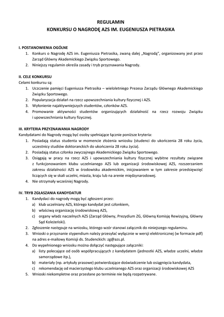 REGULAMIN KONKURSU O NAGRODĘ AZS IM. EUGENIUSZA PIETRASIKA I. POSTANOWIENIA OGÓLNE 1. Konkurs o Nagrodę AZS im. Eugeniusza Pietrasika, zwaną dalej „Nagrodą”, organizowany jest przez Zarząd Główny Akademickiego Związku Sportowego. 2. Niniejszy regulamin określa zasady i tryb przyznawania Nagrody. II. CELE KONKURSU Celami konkursu są: 1. Uczczenie pamięci Eugeniusza Pietrasika – wieloletniego Prezesa Zarządu Głównego Akademickiego Związku Sportowego. 2. Popularyzacja działań na rzecz upowszechniania kultury fizycznej i AZS. 3. Wyłonienie najaktywniejszych studentów, członków AZS. 4. Promowanie aktywności studentów organizujących działalność na rzecz rozwoju Związku i upowszechniania kultury fizycznej. III. KRYTERIA PRZYZNAWANIA NAGRODY Kandydatami do Nagrody mogą być osoby spełniające łącznie poniższe kryteria: 1. Posiadają status studenta w momencie złożenia wniosku (studenci do ukończenia 28 roku życia, uczestnicy studiów doktoranckich do ukończenia 28 roku życia). 2. Posiadają status członka zwyczajnego Akademickiego Związku Sportowego. 3. Osiągają w pracy na rzecz AZS i upowszechniania kultury fizycznej wybitne rezultaty związane z funkcjonowaniem klubu uczelnianego AZS lub organizacji środowiskowej AZS, rozszerzaniem zakresu działalności AZS w środowisku akademickim, inicjowaniem w tym zakresie przedsięwzięć liczących się w skali uczelni, miasta, kraju lub na arenie międzynarodowej. 4. Nie otrzymały wcześniej Nagrody. IV. TRYB ZGŁASZANIA KANDYDATUR 1. Kandydaci do nagrody mogą być zgłoszeni przez: a) klub uczelniany AZS, którego kandydat jest członkiem, b) właściwą organizację środowiskową AZS, c) organy władz naczelnych AZS (Zarząd Główny, Prezydium ZG, Główną Komisję Rewizyjną, Główny Sąd Koleżeński). 2. Zgłoszenie następuje na wniosku, którego wzór stanowi załącznik do niniejszego regulaminu. 3. Wnioski o przyznanie stypendium należy przesyłać wyłącznie w wersji elektronicznej (w formacie pdf) na adres e-mailowy Komisji ds. Studenckich: [email protected]. 4. Do wypełnionego wniosku można dołączyć następujące załączniki: a) listy polecające od osób współpracujących z kandydatem (jednostki AZS, władze uczelni, władze samorządowe itp.), b) materiały (np. artykuły prasowe) potwierdzające doświadczenie lub osiągnięcia kandydata, c) rekomendację od macierzystego klubu uczelnianego AZS oraz organizacji środowiskowej AZS 5. Wnioski niekompletne oraz przesłane po terminie nie będą rozpatrywane. V. PRZEBIEG I HARMONOGRAM KONKURSU 1. Wzór wniosku o przyznanie Nagrody wraz z Regulaminem są dostępne na stronie internetowej www.pietrasik.azs.pl. 2. Termin nadsyłania wniosków mija 30 września. 3. W terminie do dnia 15 października Kapituła wyłoni maksymalnie 3 osoby kandydujące do Nagrody. 4. Wyniki Konkursu zostaną ogłoszone na Gali Sportu Akademickiego podsumowującej miniony rok akademicki. VI. KAPITUŁA KONKURSU 1. Celem zapewnienia prawidłowej organizacji i przebiegu Konkursu zostaje powołana Kapituła Konkursu o Nagrodę AZS im. Eugeniusza Pietrasika. 2. Kapitułę Nagrody stanowi Rada Upowszechniania Kultury Fizycznej ZG AZS. 3. Nagrodę przyznaje Zarząd Główny AZS na wniosek Kapituły. VII. NAGRODA AZS IM. EUGENIUSZA PIETRASIKA 1. Nagroda AZS im. Eugeniusz Pietrasika przyznawana jest w formie nagrody pieniężnej, organizacyjnej oraz promocyjnej. 2. Nagroda Pieniężna – wysokość Nagrody Zarząd Główny AZS określa w drodze uchwały na dany rok kalendarzowy. 3. Nagroda Organizacyjna – laureat ma prawo dołączenia do zespołu organizacyjnego reprezentacji na wybraną zagraniczną imprezę międzynarodową koordynowaną przez Zarząd Główny AZS. Koszty udziału w wyjeździe pokrywa Zarząd Główny AZS. 4. Nagroda Promocyjna – informacja o laureacie zostaje przekazana: a) władzom uczelni – list gratulacyjny Prezesa ZG AZS do rektora uczelni, b) klubowi uczelnianemu – list gratulacyjny Prezesa ZG, c) w mediach wewnętrznych – strona internetowa, Akademicki Przegląd Sportowy, inne nośniki. 5. Osobom nominowanym, które nie otrzymały Nagrody, wręczane są listy gratulacyjne. VIII. POSTANOWIENIA KOŃCOWE Ostateczna interpretacja zapisów Regulaminu należy do Zarządu Głównego AZS.