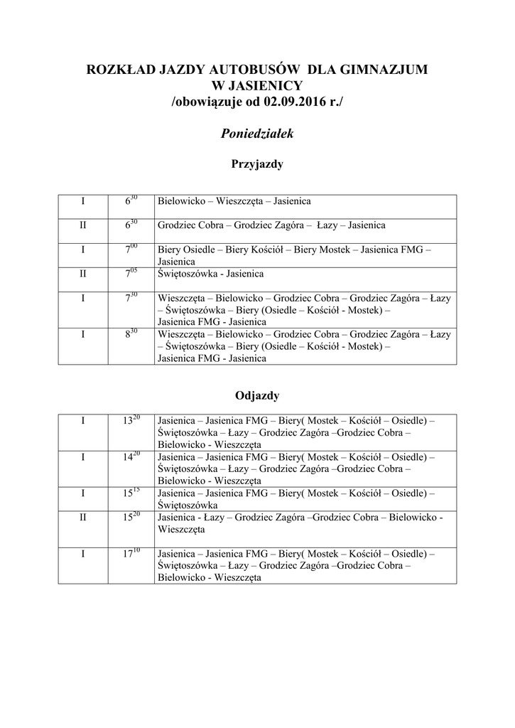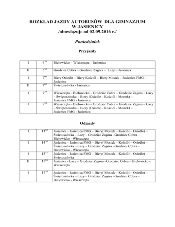 ROZKŁAD JAZDY AUTOBUSÓW DLA GIMNAZJUM W JASIENICY /obowiązuje od 02.09.2016 r./ Poniedziałek Przyjazdy I 630 Bielowicko – Wieszczęta – Jasienica II 630 Grodziec Cobra – Grodziec Zagóra – Łazy – Jasienica I 700 II 705 Biery Osiedle – Biery Kościół – Biery Mostek – Jasienica FMG – Jasienica Świętoszówka - Jasienica I 730 I 830 Wieszczęta – Bielowicko – Grodziec Cobra – Grodziec Zagóra – Łazy – Świętoszówka – Biery (Osiedle – Kościół - Mostek) – Jasienica FMG - Jasienica Wieszczęta – Bielowicko – Grodziec Cobra – Grodziec Zagóra – Łazy – Świętoszówka – Biery (Osiedle – Kościół - Mostek) – Jasienica FMG - Jasienica Odjazdy I 1320 I 1420 I 1515 II 1520 I 1710 Jasienica – Jasienica FMG – Biery( Mostek – Kościół – Osiedle) – Świętoszówka – Łazy – Grodziec Zagóra –Grodziec Cobra – Bielowicko - Wieszczęta Jasienica – Jasienica FMG – Biery( Mostek – Kościół – Osiedle) – Świętoszówka – Łazy – Grodziec Zagóra –Grodziec Cobra – Bielowicko - Wieszczęta Jasienica – Jasienica FMG – Biery( Mostek – Kościół – Osiedle) – Świętoszówka Jasienica - Łazy – Grodziec Zagóra –Grodziec Cobra – Bielowicko Wieszczęta Jasienica – Jasienica FMG – Biery( Mostek – Kościół – Osiedle) – Świętoszówka – Łazy – Grodziec Zagóra –Grodziec Cobra – Bielowicko - Wieszczęta Wtorek Przyjazdy I 630 Bielowicko – Wieszczęta – Jasienica II 630 Grodziec Cobra – Grodziec Zagóra – Łazy – Jasienica I 700 II 705 Biery Osiedle – Biery Kościół – Biery Mostek – Jasienica FMG Jasienica Świętoszówka – Jasienica I 830 Wieszczęta – Bielowicko – Grodziec Cobra – Grodziec Zagóra – Łazy – Świętoszówka – Biery (Osiedle – Kościół - Mostek) – Jasienica FMG - Jasienica Odjazdy I 1320 II 1320 I 1420 I 1515 II 1520 II 1610 II 1710 Jasienica – Jasienica FMG – Biery( Mostek – Kościół – Osiedle) – Świętoszówka Jasienica - Łazy – Grodziec Zagóra –Grodziec Cobra – Bielowicko Wieszczęta Jasienica – Jasienica FMG – Biery( Mostek – Kościół – Osiedle) – Świętoszówka – Łazy – Grodziec Zagóra –Grodziec Cobra – Bielowicko - Wieszczęta Jasienica – Jasienica FMG – Biery( Mostek – Kościół – Osiedle) – Świętoszówka Jasienica - Łazy – Grodziec Zagóra –Grodziec Cobra – Bielowicko Wieszczęta Jasienica – Jasienica FMG – Biery( Mostek – Kościół – Osiedle) – Świętoszówka – Łazy – Grodziec Zagóra –Grodziec Cobra – Bielowicko - Wieszczęta Jasienica – Jasienica FMG – Biery( Mostek – Kościół – Osiedle) – Świętoszówka – Łazy – Grodziec Zagóra –Grodziec Cobra – Bielowicko - Wieszczęta Środa Przyjazdy I 630 Bielowicko - Wieszczęta – Jasienica II 630 Grodziec Cobra – Grodziec Zagóra – Łazy – Jasienica I 700 II 705 Biery Osiedle – Biery Kościół – Biery Mostek – Jasienica FMG Jasienica Świętoszówka – Jasienica I 730 Wieszczęta – Bielowicko – Grodziec Cobra – Grodziec Zagóra – Łazy – Świętoszówka – Biery (Osiedle – Kościół - Mostek) – Jasienica FMG - Jasienica Odjazdy I 1320 II 1320 I 1420 II 1420 I 1515 I 1610 Jasienica – Jasienica FMG – Biery( Mostek – Kościół – Osiedle) – Świętoszówka Jasienica - Łazy – Grodziec Zagóra –Grodziec Cobra – Bielowicko Wieszczęta Jasienica – Jasienica FMG – Biery( Mostek – Kościół – Osiedle) – Świętoszówka Jasienica - Łazy – Grodziec Zagóra –Grodziec Cobra – Bielowicko Wieszczęta Jasienica – Jasienica FMG – Biery( Mostek – Kościół – Osiedle) – Świętoszówka Jasienica – Jasienica FMG – Biery( Mostek – Kościół – Osiedle) – Świętoszówka – Łazy – Grodziec Zagóra –Grodziec Cobra – Bielowicko - Wieszczęta Czwartek Przyjazdy I 630 Bielowicko - Wieszczęta - Jasienica II 630 Grodziec Cobra – Grodziec Zagóra – Łazy - Jasienica I 700 II 705 Biery Osiedle – Biery Kościół – Biery Mostek – Jasienica FMG Jasienica Świętoszówka – Jasienica I 730 II 830 Wieszczęta – Bielowicko – Grodziec Cobra – Grodziec Zagóra – Łazy – Świętoszówka – Biery (Osiedle – Kościół - Mostek) – Jasienica FMG - Jasienica Wieszczęta – Bielowicko – Grodziec Cobra – Grodziec Zagóra – Łazy – Świętoszówka – Biery (Osiedle – Kościół - Mostek) – Jasienica FMG - Jasienica Odjazdy I 1320 I 1420 I 1515 II 1520 I 1710 Jasienica – Jasienica FMG – Biery( Mostek – Kościół – Osiedle) – Świętoszówka – Łazy – Grodziec Zagóra –Grodziec Cobra – Bielowicko - Wieszczęta Jasienica – Jasienica FMG – Biery( Mostek – Kościół – Osiedle) – Świętoszówka – Łazy – Grodziec Zagóra –Grodziec Cobra – Bielowicko - Wieszczęta Jasienica – Jasienica FMG – Biery( Mostek – Kościół – Osiedle) – Świętoszówka Jasienica - Łazy – Grodziec Zagóra –Grodziec Cobra – Bielowicko Wieszczęta Jasienica – Jasienica FMG – Biery( Mostek – Kościół – Osiedle) – Świętoszówka – Łazy – Grodziec Zagóra –Grodziec Cobra – Bielowicko - Wieszczęta Piątek Przyjazdy I 630 Bielowicko- Wieszczęta - Jasienica II 630 Grodziec Cobra – Grodziec Zagóra – Łazy - Jasienica I 700 II 705 Biery Osiedle – Biery Kościół – Biery Mostek – Jasienica FMG Jasienica Świętoszówka – Jasienica I 730 I 830 Wieszczęta – Bielowicko – Grodziec Cobra – Grodziec Zagóra – Łazy – Świętoszówka – Biery (Osiedle – Kościół - Mostek) – Jasienica FMG - Jasienica Wieszczęta – Bielowicko – Grodziec Cobra – Grodziec Zagóra – Łazy – Świętoszówka – Biery (Osiedle – Kościół - Mostek) – Jasienica FMG - Jasienica Odjazdy I 1320 I 1420 II 1420 I 1515 II 1520 II 1710 Jasienica – Jasienica FMG – Biery( Mostek – Kościół – Osiedle) – Świętoszówka –