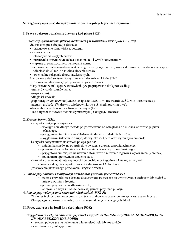 Załącznik Nr 1 Szczegółowy opis prac do wykonania w poszczególnych grupach czynności : I. Prace z zakresu pozyskanie drewna ( kod planu POZ) 1. Całkowity wyrób drewna pilarką mechaniczną w warunkach nizinnych( CWDPN). Zakres tych prac obejmuje głównie: • - przygotowanie stanowiska roboczego, • - ścinka drzew, • - okrzesywanie ściętych drzew, • - przerzynka drewna wynikająca z manipulacji i wyrób sortymentów, • - łupanie drewna zgodnie z wymogami norm, • - sortowanie i składanie drewna stosowego w stosy wymiarowe, wraz z donoszeniem wałków i szczap na odległość do 20 mb. do miejsca złożenia stosów, • - ewentualne ściąganie drzew zawieszonych. Planowany układ sortymentowy zawiera załącznik nr 1A do SIWZ. ( zestawienie planownego pozyskania i zrywki drewna). Masy drewna w m3 ujęte w zestawieniu j/w pogrupowano (kolejno) według: - numerów części zamówienia; -grup czynności; -odległości zrywki; -grup rodzajowych drewna (IGLASTE-iglaste ,LIŚĆ TW- liść.twarde ,LIŚĆ MIĘ- liść.miękkie); -kategorii grubości (W-drewno wielkowymiarowe ,S- średniowymiarowe); -klas grubości w drewnie wielkowymiarowym (1-3); -klas dlugości w drewnie średniowymiarowym(D-długie,K-krótkie); 2. Zrywka drewna(ZM). a) zrywka dłużyc polegająca na: • - wyciągnięciu dłużyc metodą półpodwieszoną na odległość i do miejsca wskazanego przez leśniczego. • - przygotowaniu miejsca na składowanie drewna i założenie legarów, • - mygłowaniu (układanie dłużyc) do wysokości 1,5 m oraz wyrównywaniu czół; b) zrywka sortymentów stosowych polegająca na: • - załadunku stosów na pojazdy do wywożenia drewna z powierzchni cięć, • - przewóz drewna do miejsca składowania wskazanego przez leśniczego . • - przygotowaniu miejsca na ułożenie stosu wraz z założenie legarów i wykonaniem jarzemek, • - rozładunku i ponownym ułożeniu stosu. c) zrywka drewna obejmuje czynności i pracochłonność zgodnie z katalogiem zrywki Planowane odległości zrywki zawiera załącznik nr 1A do SIWZ. ( zestawienie planownego pozyskania i zrywki drewna). 3. Pomoc przy odbiórce i manipulacji drewna oraz pozostałe prace(POZ-P) : • - pomoc przy odbiórce drewna dłużycowego polegająca na wykonywaniu zaciosów lub nacięć w miejscu pomiaru średnic, • - pomoc przy pomiarze długości sztuk, • - obracanie dłużyc i kłód do oceny jej jakości przy manipulacji. 4. Pomoc przy wykonywaniu szacunków brakarskich(POZ-P): W zakres tych prac wchodzi pomiar pierśnic i znakowanie drzew do wycięcia wskazanych przez Zlecającego na powierzchniach przewidzianych do cięć w następnych latach. II. Prace z zakresu hodowli lasu (kod planu POZ). 1. Przygotowanie gleby do odnowień, poprawek i uzupełnień(ODN-GLEB,ODN-ZŁOŻ,ODN-ZRB,ODNIIP,ODN-LUK,ODN-HAL,POPR): • - ręczne, polegające na wykonaniu talerzy,placówek lub kopczyków, • - mechaniczne, polegające na: 1) wyoraniu bruzd pługiem leśnym, w rozstawie 1,30 do 1,50 mb, z ewentualnym spulchnieniem gleby w bruzdach pogłębiaczem leśnym, 2) przygotowaniu gleby frezem aktywnym lub pługofrezarką. 2. Nasadzenia w odnowieniach, poprawkach i uzupełnieniach (ODN-ZŁOŻ,ODN-ZRB,ODN-IIP,ODNLUK,ODN-HAL,POPR): - dokonanie nasadzeń sadzonkami wieloletnimi drzew iglastych i liściastych w jamkę, ewentualnie sadzonkami jednorocznymi So w „szparę” pod kostur. Nasadzenia obejmują dowóz sadzonek ze szkółki na powierzchnię, wykopanie dołu do przechowywania sadzonek, liczenie i ewentualne formowanie strzałek i systemów korzeniowych wraz z dołowaniem sadzonek, oraz donoszeniem do miejsca wysadzenia i wykonanie nasadzeń w więźbie ustalonej przez zlecającego. 3. Pielęgnowanie lasu (PIEL,CW,CP,PIEL-POZ)obejmuje: a) pielęgnowanie gleby (PIEL) polegające na zniszczeniu chwastów poprzez: • - wykaszanie chwastów w uprawach, • - spulchnianie gleby wokół sadzonek, • - ręczne przerzedzanie siewów, b) czyszczenia wczesne (CW) polegające na: • - usuwaniu odrośli drzew i krzewów przy pomocy tasaków, • - usuwaniu nalotów zbędnych drzew i krzewów przy pomocy tasaków, • - usuwaniu drzewek chorych, obumierających, martwych, które bezpośrednio zagrażają wzrostowi sadzonek; c) czyszczenia późne (CP) polegające na: • - regulowaniu składu gatunkowego młodnika poprzez wycięcie lub ogławianie niepotrzebnych domieszek, • - usuwanie drzewek obumierających, wadliwych, • - przerzedzenie nadmiernie zagęszczonych fragmentów młodnika; • - usuniecie drzewek ze szlaków technologicznych; d) inne zabiegi pielęgnacyjne (PIEL-POZ)polegające na: • - poprawianiu formy drzewek poprzez usunięcie zbędnych odgałęzień, zabezpieczeniu preparatem przed infekcją, • - przycięciu sadzonek na bezpieńkę w przypadku niemożliwości wyprowadzenia przewodnika, • - prace pomocnicze przy wyznaczaniu drzew do wycięcia; e) melioracje agrotechniczne (MA-PORZ)polegające na: • - oczyszczeniu powierzchni z krzewów, jeżyn, malin itp. poprzez wycinanie, znoszenie, układanie w stosy niewymiarowe, • - usunięciu odpadów (gałęzi, konarów) lub odrośli z powierzchni przeznaczonej do odnowienia, wraz z ich wyniesieniem poza miejsce nasadzeń, III. Prace z zakresu ochrony ppoż. 1. Utrzymanie pasów przeciwpożarowych(P-PASYS) polegające na: • - utrzymaniu w czarnym ugorze bruzdy szer. 2m poprzez dwukrotne w sezonie zagrożenia pożarowego talerzowanie lub rozoranie pługiem LPZ, • - usuwanie z bruzd wywrotów, złomów, gałęzi. 2. Utrzymanie punktów czerpania wody(UT-WODA) polegające na: • - utrzymaniu oznakowania tych punktów tablicami o treści „Punkt czerpania wody” i „Do punktu czerpania wody”, • - utrzymaniu dróg dojazdowych do punktu tak, by były przejezdne przez cały rok oraz usunięciu gałęzi i krzewów z poboczy tych dróg, • - usunięcie zanieczyszczeń, wybranie i wywiezienie szlamu z dna basenu p. poż. znajdującego się w 