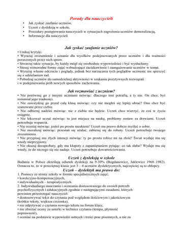 Porady dla nauczycieli • • • • Jak zyskać zaufanie uczniów, Uczeń z dysleksją w szkole, Procedury postępowania nauczycieli w sytuacjach zagrożenia uczniów demoralizacją, Informacje dla nauczycieli Jak zyskać zaufanie uczniów? • Unikaj krytyki. • Wyrażaj zrozumienie i uznanie dla wysiłków podejmowanych przez uczniów i dla ważności poruszonych przez nich spraw. • Stwarzaj takie sytuacje, by każdy mógł się swobodnie wypowiedzieć i być wysłuchany. • Stosuj różnorodne formy zajęć wzbudzające zaciekawienie i zaangażowanie uczniów w temat. • Wyrażaj własne odczucia i poglądy, jednak bez narzucania tych poglądów uczniom; nie spieszyć się z udzielaniem rad. • Pobudzaj uczniów do samodzielnej aktywności w szukaniu pozytywnych rozwiązań i w podejmowaniu prób nowych sposobów zachowania. Jak rozmawiać z uczniem? • Nie porównuj go z innymi uczniami mówiąc: dlaczego inni potrafią, a ty nie. On chce, byś rozumiał jego trudności. • Nie zawstydzaj go przed całą klasą mówiąc: czy nie mogłeś się lepiej ubrać? Ono chce być szanowane przez ciebie. • Nie odbieraj nadziei mówiąc: nic z ciebie nie będzie. Uczeń chce wierzyć, że coś w życiu osiągnie. • Nie lekceważ uczuć mówiąc: tu jest miejsce na naukę, problemy zostaw za drzwiami. Uczeń potrzebuje wsparcia. • Nie oceniaj mówiąc: jesteś po prostu nieukiem! Uczeń ma prawo dobrze myśleć o sobie. • Nie moralizuj mówiąc: przestań się użalać, zabieraj się do roboty. Uczeń potrzebuje twojego zrozumienia. • Nie przypisuj mu złych intencji mówiąc: ty po prostu robisz mi na złość! Świat wydaje mu się wtedy nieprzyjazny. • Nie okazuj dezaprobaty, gdy ma kłopoty z zapamiętaniem pytając: co tak słabo? Wydaje mu się wtedy, że do niczego się nie nadaje. Uczeń potrzebuje dowartościowania. Uczeń z dysleksją w szkole Badania w Polsce określają odsetek dysleksji na 9-10% (Bogdanowicz, Jaklewicz 1968–1982). Oznacza to, że w przeciętnej klasie jest 3 – 4 uczniów dyslektycznych, najczęściej są to chłopcy. Uczeń – dyslektyk ma prawo do: 1. Pomocy ze strony szkoły w formie specjalistycznych zajęć: • korekcyjno-kompensacyjnych, • indywidualnych – terapeutycznych. 2. Indywidualnego nauczania i oceniania dostosowanego do swoich potrzeb psychofizycznych i edukacyjnych zgodnie z następującymi zasadami, których powinien przestrzegać nauczyciel: • dostosowywać tekst do czytania pod względem ilościowym i jakościowym (krótkie teksty, większa czcionka), • nie odpytywać z czytania nowego tekstu na forum klasy, • nie obniżać oceny za usterki w technice czytania (tempo, płynność poprawność), • oceniać na podstawie wypowiedzi ustnych i treści prac pisemnych, a nie za liczbę zrobionych błędów, • wydłużać czas na zadania pisemne, • umożliwiać oddawanie prac pisanych komputerowo, • nie oceniać zeszytów za estetykę, • w przypadku dysgrafików nie oceniać pisma pod względem kaligraficznym, • umożliwiać korzystanie ze słownika, • błędy w pracach pisemnych poprawiać opisowo, • zwolnienia z nauki drugiego języka obcego w przypadku stwierdzonej głębokiej dysleksji, • dostosowania rozwiązań organizacyjnych i technicznych na sprawdzianie kończącym klasę VI, egzaminie gimnazjalnym i maturalnym zgodnie z zaleceniami OKE zawartymi w opinii poradni psychologiczno-pedagogicznej w celu wyrównania szans edukacyjnych. Uczeń ma obowiązek: 1. Pracy samokształceniowej: • czytania co najmniej 15 minut każdego dnia, • utrwalania poprawnej pisowni poprzez ćwiczenia ortograficzne, • wykonywania ćwiczeń grafomotorycznych zalecanych przez terapeutę, • wykonywania ćwiczeń kaligraficznych, • samokontroli wykonywanych ćwiczeń. 2. Uczestnictwa w zajęciach korekcyjno-kompensacyjnych. 3. Realizacji programu nauczania. 4. Systematycznego uczestnictwa i przygotowywania się do zajęć terapeutycznych. Dostosowanie wymagań uczniom ze specjalnymi potrzebami edukacyjnymi. Procedura dostosowania wymagań: • Uczeń lub rodzic dostarcza opinie/orzeczenie do pedagoga szkolnego. • Pedagog dokonuje analizy opinii pod kątem występujących trudności, ich przyczyn oraz zawartych w niej wskazań do pracy. • Pedagog na podstawie opinii/orzeczenia opracowuje szczegółowe wskazówki dotyczące pracy i oceniania ucznia. W razie konieczności konsultuje problem dziecka ze specjalistami z Poradni Psychologiczno-Pedagogicznej. • Każdy wychowawca po otrzymaniu wskazań do pracy z uczniem przekazuje je wszystkim uczącym nauczycielom. • Nauczyciele dostosowują wymagania i zasady oceniania ucznia zgodnie z zaleceniami. W razie wątpliwości konsultują się indywidualnie z psychologiem/pedagogiem szkolnym. • Rodzic ucznia zostaje zapoznany przez wychowawcę z zaleceniami w czasie najbliższych konsultacji. • Pedagog szkolny/terapeuta wspólnie z nauczycielami (zwłaszcza nauczycielem języka polskiego) i rodzicami omawiają zasady współpracy i zakres obowiązków poszczególnych osób. • Jeżeli uczeń nie uczęszcza nigdzie na zajęcia terapeutyczne, proponuje mu się zajęcia na terenie szkoły lub pracę pod kierunkiem nauczyciela polonisty. • Uczeń pracuje w domu i jest rozliczany z wykonywanych zadań przez nauczyciela terapeutę lub polonistę. • Na zakończenie każdego roku szkolnego pedagog szkolny dokonuje oceny skuteczności podjętych działań (analiza postępów w nauce, wywiad z nauczycielami i rodzicami). Dyslektycy mają trudności: • W zakresie języka polskiego (poza typowymi błędami ortograficznymi popełniają inne, tzw. specyficzne dla zaburzeń analizatora wzrokowego lub słuchowego, np.: opuszczają, dodają, podwajają, przestawiają w wyrazach litery i sylaby, łączą wyrazy lub rozdzielają wyrazy na dwa człony, nie umieją przenosić wyrazów, mylą litery odpowiadające podobnym fonetycznie głoskom, nie potrafią pisać zmiękcze