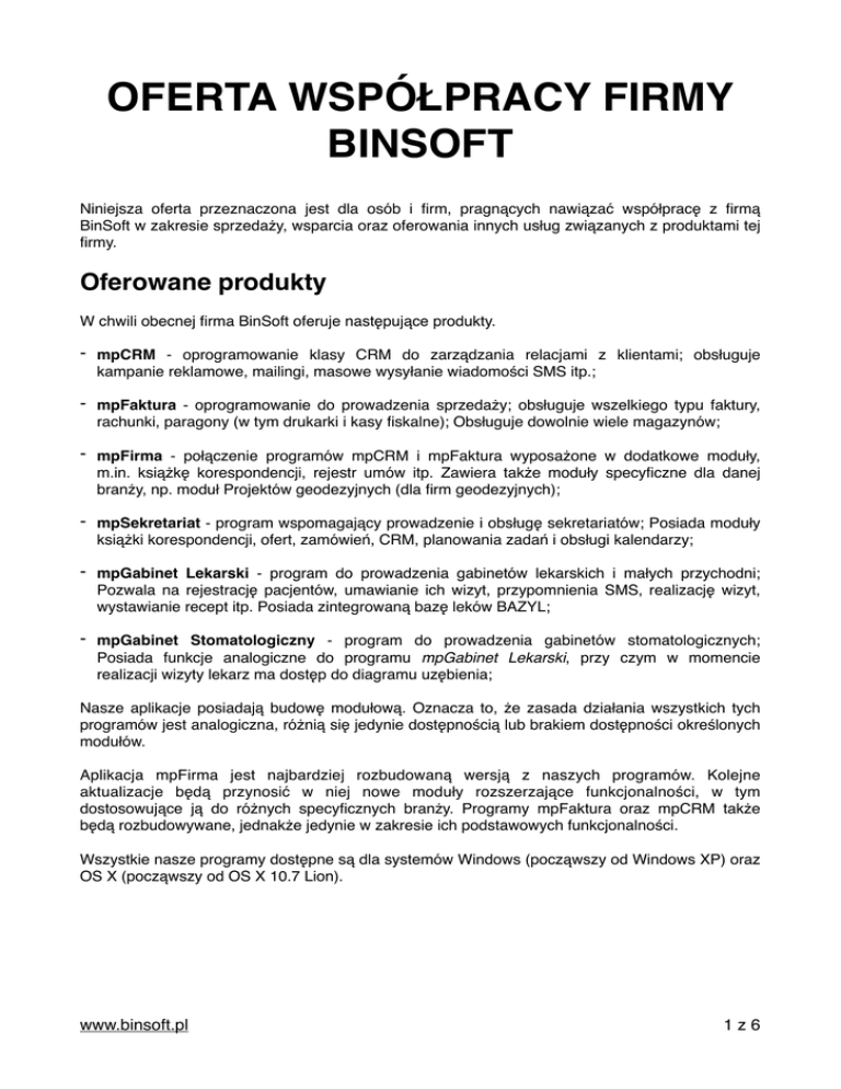 OFERTA WSPÓŁPRACY FIRMY BINSOFT Niniejsza oferta przeznaczona jest dla osób i firm, pragnących nawiązać współpracę z firmą BinSoft w zakresie sprzedaży, wsparcia oraz oferowania innych usług związanych z produktami tej firmy. Oferowane produkty W chwili obecnej firma BinSoft oferuje następujące produkty. - mpCRM - oprogramowanie klasy CRM do zarządzania relacjami z klientami; obsługuje kampanie reklamowe, mailingi, masowe wysyłanie wiadomości SMS itp.; - mpFaktura - oprogramowanie do prowadzenia sprzedaży; obsługuje wszelkiego typu faktury, rachunki, paragony (w tym drukarki i kasy fiskalne); Obsługuje dowolnie wiele magazynów; - mpFirma - połączenie programów mpCRM i mpFaktura wyposażone w dodatkowe moduły, m.in. książkę korespondencji, rejestr umów itp. Zawiera także moduły specyficzne dla danej branży, np. moduł Projektów geodezyjnych (dla firm geodezyjnych); - mpSekretariat - program wspomagający prowadzenie i obsługę sekretariatów; Posiada moduły książki korespondencji, ofert, zamówień, CRM, planowania zadań i obsługi kalendarzy; - mpGabinet Lekarski - program do prowadzenia gabinetów lekarskich i małych przychodni; Pozwala na rejestrację pacjentów, umawianie ich wizyt, przypomnienia SMS, realizację wizyt, wystawianie recept itp. Posiada zintegrowaną bazę leków BAZYL; - mpGabinet Stomatologiczny - program do prowadzenia gabinetów stomatologicznych; Posiada funkcje analogiczne do programu mpGabinet Lekarski, przy czym w momencie realizacji wizyty lekarz ma dostęp do diagramu uzębienia; Nasze aplikacje posiadają budowę modułową. Oznacza to, że zasada działania wszystkich tych programów jest analogiczna, różnią się jedynie dostępnością lub brakiem dostępności określonych modułów. Aplikacja mpFirma jest najbardziej rozbudowaną wersją z naszych programów. Kolejne aktualizacje będą przynosić w niej nowe moduły rozszerzające funkcjonalności, w tym dostosowujące ją do różnych specyficznych branży. Programy mpFaktura oraz mpCRM także będą rozbudowywane, jednakże jedynie w zakresie ich podstawowych funkcjonalności. Wszystkie nasze programy dostępne są dla systemów Windows (począwszy od Windows XP) oraz OS X (począwszy od OS X 10.7 Lion). www.binsoft.pl 1z6 Co nas wyróżnia? - Skalowalność Nasze aplikacje stworzone są w takiej technologii, że możliwe jest ich modyfikowanie oraz rozbudowywanie indywidualnie według potrzeb Klienta. Razem z Partnerem możliwe jest także przygotowywanie specjalnych, branżowych wersji programu dla określonej grupy odbiorców (jeśli np. partner widzi takie zapotrzebowanie). - Multiplatformowość Nasze programy działają nie tylko w środowisku Windows ale również OS X. Jesteśmy jednym z nielicznych producentów tworzących oprogramowanie biznesowe na systemy Apple. Nasze programy obsługują drukarki i kasy fiskalne, czytniki kodów kreskowych itp. - Praca wielu użytkowników Możliwa jest praca pojedynczych użytkowników, jak również wielu użytkowników jednocześnie. Nasze aplikacje są ze sobą kompatybilne, stąd w ramach jednej firmy i jednej bazy danych może pracować wielu użytkowników, w różnych systemach operacyjnych i na różnych programach. - Obsługa wielu silników bazodanowych Nasze programy obsługują wiele silników bazodanowych, m.in: MySQL, PostgreSQL czy MS SQL. Dzięki temu jeśli Partner posiada wiedzę z zakresu tworzenia np. aplikacji webowych, możliwe jest tworzenie różnego rodzaju integracji pomiędzy serwisami WWW i aplikacjami MP; Cennik i licencjonowanie W chwili obecnej ceny programów prezentują się następująco (kwoty końcowe Netto): - mpCRM - 99.00 zł mpFaktura - 99.00 zł mpFirma - 199.00 zł mpSekretariat - 99.00 zł mpGabient Lekarski - 199.00 zł mpGabinet Stomatologiczny - 199.00 zł Podane ceny dotyczą licencji na 1 stanowisko i okres 1 roku (365 dni). Większa liczba licencji obliczana jest jako iloczyn ceny standardowej i liczby licencji pomniejszonej o rabat nadawany w zależności od liczby licencji. - licencji: 1-2, rabat: 0% licencji: 3-4, rabat 15% licencji: 5-6, rabat 20% licencji: 7-9, rabat: 25% licencji: 10-14, rabat: 30% licencji: 15-…, rabat 40% www.binsoft.pl 2z6 Można zakupić licencję na okres dłuższy niż 1 rok. Dłuższa licencja oznacza proporcjonalne naliczenie ceny licencji pomniejszone o rabat nadawany w zależności od długości okresu: - więcej niż 1 rok, rabat: 0% więcej niż 2 lata, rabat: 10% więcej niż 3 lata, rabat: 20% więcej niż 4 lata, rabat: 30% więcej niż 5 lat, rabat: 40% więcej niż 6 lat, rabat: 50% Uwaga! Poprzez stanowisko rozumie się aktywne połączenie z bazą danych. Oznacza to, że mając zakupioną licencję na 1 stanowisko, program może być zainstalowany na dowolnie wielu komputerach, jednakże tylko jedna osoba w tym samym czasie będzie mogła korzystać z programu. Licencja nie dotyczy systemu operacyjnego. Oznacza to, że kupując licencję można dowolnie zmieniać system operacyjny lub mieć zainstalowany program pod oboma wspieranymi systemami. Bazy danych Dane gromadzone w programach serii MP przechowywanie są w tzw. bazach danych. Nasze oprogramowanie obsługuje następujące rodzaje baz: - SQLite, Firebird, MySQL, MariaDB, MS SQL, PostgreSQL, Interbase; Baza SQLite jest wbudowana w aplikację, zatem można z niej korzystać bez konieczności instalacji dodatkowych aplikacji. Podobnie wygląda sytuacja bazy Firebird, jednakże tylko w środowisku Windows. Pozostałe serwery bazodanowe klient musi zainstalować we własnym zakresie (chcąc z nich skorzystać); Baza SQLite to baza lokalna i nie pozwala na pracę przez wielu użytkowników jednocześnie. Pozostałe bazy pozwalają na pracę sieciową. Uwaga! Oprogramowanie MP wspiera mechanizm „tunelowania” do bazy MySQL poprzez HTTP oraz tunelowania do dowolnej bazy danych poprzez protokół SSH. www.binsoft.pl 3z6 Oferta współpracy Nawiązując współpracę z fi