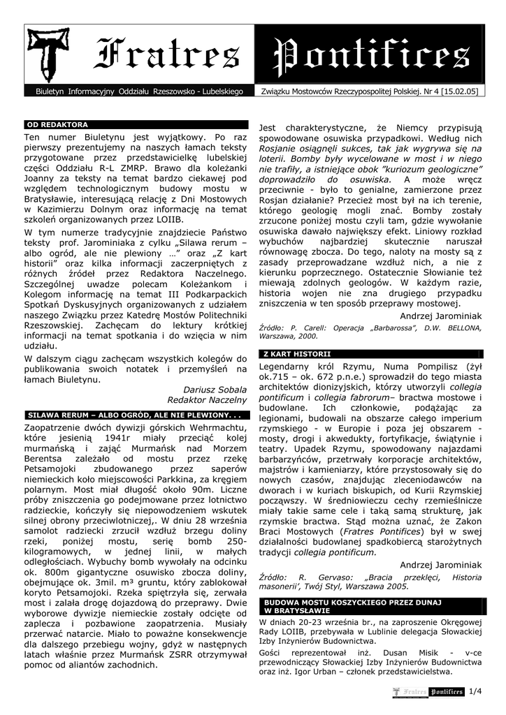 Fratres Pontifices Biuletyn Informacyjny Oddziału Rzeszowsko - Lubelskiego OD REDAKTORA Ten numer Biuletynu jest wyjątkowy. Po raz pierwszy prezentujemy na naszych łamach teksty przygotowane przez przedstawicielkę lubelskiej części Oddziału R-L ZMRP. Brawo dla koleżanki Joanny za teksty na temat bardzo ciekawej pod względem technologicznym budowy mostu w Bratysławie, interesującą relację z Dni Mostowych w Kazimierzu Dolnym oraz informację na temat szkoleń organizowanych przez LOIIB. W tym numerze tradycyjnie znajdziecie Państwo teksty prof. Jarominiaka z cylku „Silawa rerum – albo ogród, ale nie plewiony …” oraz „Z kart historii” oraz kilka informacji zaczerpniętych z różnych źródeł przez Redaktora Naczelnego. Szczególnej uwadze polecam Koleżankom i Kolegom informację na temat III Podkarpackich Spotkań Dyskusyjnych organizowanych z udziałem naszego Związku przez Katedrę Mostów Politechniki Rzeszowskiej. Zachęcam do lektury krótkiej informacji na temat spotkania i do wzięcia w nim udziału. W dalszym ciągu zachęcam wszystkich kolegów do publikowania swoich notatek i przemyśleń na łamach Biuletynu. Dariusz Sobala Redaktor Naczelny SILAWA RERUM – ALBO OGRÓD, ALE NIE PLEWIONY. . . Zaopatrzenie dwóch dywizji górskich Wehrmachtu, które jesienią 1941r miały przeciąć kolej murmańską i zająć Murmańsk nad Morzem Berentsa zależało od mostu przez rzekę Petsamojoki zbudowanego przez saperów niemieckich koło miejscowości Parkkina, za kręgiem polarnym. Most miał długość około 90m. Liczne próby zniszczenia go podejmowane przez lotnictwo radzieckie, kończyły się niepowodzeniem wskutek silnej obrony przeciwlotniczej,. W dniu 28 września samolot radziecki zrzucił wzdłuż brzegu doliny rzeki, poniżej mostu, serię bomb 250kilogramowych, w jednej linii, w małych odległościach. Wybuchy bomb wywołały na odcinku ok. 800m gigantyczne osuwisko zbocza doliny, obejmujące ok. 3mil. m³ gruntu, który zablokował koryto Petsamojoki. Rzeka spiętrzyła się, zerwała most i zalała drogę dojazdową do przeprawy. Dwie wyborowe dywizje niemieckie zostały odcięte od zaplecza i pozbawione zaopatrzenia. Musiały przerwać natarcie. Miało to poważne konsekwencje dla dalszego przebiegu wojny, gdyż w następnych latach właśnie przez Murmańsk ZSRR otrzymywał pomoc od aliantów zachodnich. Związku Mostowców Rzeczypospolitej Polskiej. Nr 4 [15.02.05] Jest charakterystyczne, że Niemcy przypisują spowodowane osuwiska przypadkowi. Według nich Rosjanie osiągnęli sukces, tak jak wygrywa się na loterii. Bomby były wycelowane w most i w niego nie trafiły, a istniejące obok ”kuriozum geologiczne” doprowadziło do osuwiska. A może wręcz przeciwnie - było to genialne, zamierzone przez Rosjan działanie? Przecież most był na ich terenie, którego geologię mogli znać. Bomby zostały zrzucone poniżej mostu czyli tam, gdzie wywołanie osuwiska dawało największy efekt. Liniowy rozkład wybuchów najbardziej skutecznie naruszał równowagę zbocza. Do tego, naloty na mosty są z zasady przeprowadzane wzdłuż nich, a nie z kierunku poprzecznego. Ostatecznie Słowianie też miewają zdolnych geologów. W każdym razie, historia wojen nie zna drugiego przypadku zniszczenia w ten sposób przeprawy mostowej. Andrzej Jarominiak Źródło: P. Carell: Operacja „Barbarossa”, D.W. BELLONA, Warszawa, 2000. Z KART HISTORII Legendarny król Rzymu, Numa Pompilisz (żył ok.715 – ok. 672 p.n.e.) sprowadził do tego miasta architektów dionizyjskich, którzy utworzyli collegia pontificum i collegia fabrorum– bractwa mostowe i budowlane. Ich członkowie, podążając za legionami, budowali na obszarze całego imperium rzymskiego - w Europie i poza jej obszarem mosty, drogi i akwedukty, fortyfikacje, świątynie i teatry. Upadek Rzymu, spowodowany najazdami barbarzyńców, przetrwały korporacje architektów, majstrów i kamieniarzy, które przystosowały się do nowych czasów, znajdując zleceniodawców na dworach i w kuriach biskupich, od Kurii Rzymskiej począwszy. W średniowieczu cechy rzemieślnicze miały takie same cele i taką samą strukturę, jak rzymskie bractwa. Stąd można uznać, że Zakon Braci Mostowych (Fratres Pontifices) był w swej działalności budowlanej spadkobiercą starożytnych tradycji collegia pontificum. Andrzej Jarominiak Źródło: R. Gervaso: „Bracia przeklęci, masonerii’, Twój Styl, Warszawa 2005. Historia BUDOWA MOSTU KOSZYCKIEGO PRZEZ DUNAJ W BRATYSŁAWIE W dniach 20-23 września br., na zaproszenie Okręgowej Rady LOIIB, przebywała w Lublinie delegacja Słowackiej Izby Inżynierów Budownictwa. Gości reprezentował inż. Dusan Misik v-ce przewodniczący Słowackiej Izby Inżynierów Budownictwa oraz inż. Igor Urban – członek przedstawicielstwa. 1/4 Izba Słowacka istnieje od roku 1992, liczy około 5000 członków i ma problemy bardzo podobne do naszej Polskiej Izby Inżynierów Budownictwa. W Lublinie podpisaliśmy porozumienie w sprawie współpracy pomiędzy izbami. Ma ono polegać m.in. na wzajemnej wymianie informacji nt. nowych technologii stosowanych w budownictwie, organizowaniu wycieczek technicznych, przesyłaniu prasy technicznej, zapraszania na konferencje, zjazdy i spotkania techniczne. Podobną operację, z obracaniem przęsła, przeprowadzono w 1998 r w Sewilli. Było to jednak przęsło o długości 130 m. Prace przy moście Koszyckim należy uznać więc za duży sukces inżynierski naszych południowych sąsiadów. Goście opowiadali o inwestycjach realizowanych w ostatnim czasie na Słowacji, a zwłaszcza o montażu przęsła Mostu Koszyckiego przez Dunaj w Bratysławie. Most zlokalizowany jest pomiędzy istniejącymi mostami Pristavnym a Starym i ma połączyć centrum Bratysławy z dzielnicą Petrzalka. Jego budowa planowana była już od 1976 r. Tymczasowa nazwa „Most Koszycki” pochodzi od nazwy ulicy na lewym brzegu, w ciągu której most jest zlokal