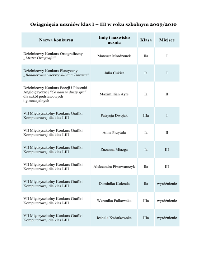 Osiągnięcia uczniów klas I – III w roku szkolnym 2009/2010 Imię i nazwisko ucznia Klasa Miejsce Mateusz Mordzonek IIa I Dzielnicowy Konkurs Plastyczny „Bohaterowie wierszy Juliana Tuwima” Julia Cukier Ia I Dzielnicowy Konkurs Poezji i Piosenki Anglojęzycznej "Co nam w duszy gra" dla szkół podstawowych i gimnazjalnych Maximillian Ayre Ia II VII Międzyszkolny Konkurs Grafiki Komputerowej dla klas I-III Patrycja Dwojak IIIa I VII Międzyszkolny Konkurs Grafiki Komputerowej dla klas I-III Anna Przytuła Ia II VII Międzyszkolny Konkurs Grafiki Komputerowej dla klas I-III Zuzanna Miazga Ia III VII Międzyszkolny Konkurs Grafiki Komputerowej dla klas I-III Aleksandra Piwowarczyk IIa III VII Międzyszkolny Konkurs Grafiki Komputerowej dla klas I-III Dominika Kolenda IIa wyróżnienie VII Międzyszkolny Konkurs Grafiki Komputerowej dla klas I-III Weronika Falkowska IIIa wyróżnienie VII Międzyszkolny Konkurs Grafiki Komputerowej dla klas I-III Izabela Kwiatkowska IIIa wyróżnienie Nazwa konkursu Dzielnicowy Konkurs Ortograficzny „Mistrz Ortografii” Dzielnicowy Konkurs organizowany przez Muzeum Woli – „Mój dzień w dawnej Woli” Anna Przytuła Ia III Międzyszkolny Konkurs Plastyczny „Jesienne fascynacje” Klaudia Wańkowicz Ia wyróżnienie Międzyszkolny Konkurs Plastyczny „Jesienne fascynacje” Natalia Komorowska Ia wyróżnienie Szkolny Konkurs Ortograficzny „Mistrz Ortografii” Mateusz Mordzonek IIa I Szkolny Konkurs Ortograficzny „Mistrz Ortografii” Natalia Dębek IIa II Szkolny Konkurs Ortograficzny „Mistrz Ortografii” Aleksandra Matusiak IIa II Szkolny Konkurs Ortograficzny „Mistrz Ortografii” Maja Dachniewska IIa III Szkolny Konkurs Plastyczny „Barwy jesieni” Sebastian Ignacak Ia I Szkolny Konkurs Plastyczny „Barwy jesieni” Klaudia Wańkowicz Ia II Szkolny Konkurs Plastyczny „Barwy jesieni” Natalia Komorowska Ia II Zuzanna Miazga Ia I Hubert Walkowicz IIa I Szkolny Konkurs Szybkiego Pisania „Mistrz Klawiatury” w kategorii klas I Szkolny Konkurs Szybkiego Pisania „Mistrz Klawiatury” w kategorii klas II Szkolny Konkurs Szybkiego Pisania „Mistrz Klawiatury” w kategorii klas III Kevin Trochimiak IIIb I Osiągnięcia uczniów klas IV – VI w roku szkolnym 2009/2010 Imię i nazwisko ucznia Klasa Miejsce Cezary Kierzyk VIb III Grzegorz Dachniewski Damian Dyło Filip Januszewski IVa Va VIa III Damian Dyło Va Nagroda specjalna Warszawska Olimpiada Języka Angielskiego Witold Chyło VIa VIII Dzielnicowy Konkurs „We like English” Marta Bicka VIa III Dzielnicowy Konkurs „We like English” Filip Januszewski VIa IV Paulina Borowska VIb IV Nazwa konkursu VIII Europejski Przegląd Szkolny „Nowoczesna Szkoła” (prezentacja multimedialna w wersji polskiej i angielskiej) XV Konkurs Edukacyjny „Poznajmy się bliżej” organizowany przez Komendę Rejonowa Policji Warszawa IV XV Konkurs Edukacyjny „Poznajmy się bliżej” organizowany przez Komendę Rejonowa Policji Warszawa IV Dzielnicowy Konkurs Poezji i Piosenki Anglojęzycznej "Co nam w duszy gra" dla szkół podstawowych i gimnazjalnych Piotr Dobrzyński Bartosz Jezierski Sebastian Buczek Kamil Bogumił Maciej Nowaczyk Kamil Chudy IVa IVa Va Vb VIb VIb I Paulina Mroczkowska Katarzyna Sordyl Gabriela Kuczmar Dominika Staniaszek Aleksandra Kwiatkowska Ida Migoń IVa IVa Va Va VIa VIa I Mistrzostwa Woli w Biegach Przełajowych Patryk Kozłowski VIb II Mistrzostwa Woli w Biegach Przełajowych Gabriela Kuczmar Va III Paulina Mroczkowska Weronika Pawelec Julia Jasińska Katarzyna Suszek Weronika Bar Karolina Kasprzyk Dominika Lachowicz Zuzanna Mazurek Klaudia Starosta Patrycja Wrzecion Paulina Borowska IVa Va Vb VIa VIa VIa VIa VIa VIa VIa VIb III Gabriela Zahorowicz Julia Jasińska Weronika Bar Karolina Kasprzyk Dominika Lachowicz Zuzanna Mazurek Patrycja Wrzecion Va Vb VIa VIa VIa VIa VIa III Antonina Jaślan VIa I Mistrzostwa Woli w Pływaniu Mistrzostwa Woli w Pływaniu Mistrzostwa Woli w Mini Koszykówce Mistrzostwa Woli w Mini Piłce Nożnej Szkolny Konkurs Wiedzy o Stanach Zjednoczonych Szkolny Konkurs Wiedzy o Stanach Zjednoczonych Karolina Kasprzyk VIa II Szkolny Konkurs Wiedzy o Stanach Zjednoczonych Klaudia Starosta VIa III Szkolny Konkurs Szybkiego Pisania „Mistrz Klawiatury” w kategorii klas IV Miłosz Majewski IVb I Szkolny Konkurs Szybkiego Pisania „Mistrz Klawiatury” w kategorii klas V Karolina Sobień Vb I Maciej Nowaczyk VIb I Szkolny Konkurs Szybkiego Pisania „Mistrz Klawiatury” w kategorii klas VI