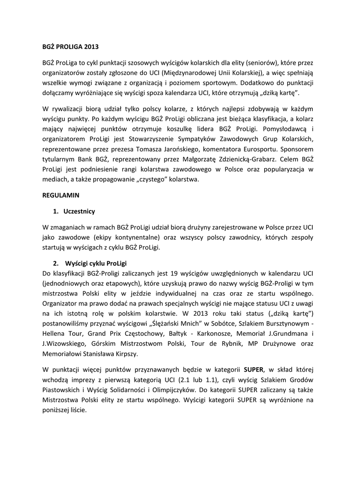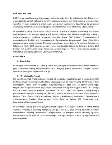 BGŻ PROLIGA 2013 BGŻ ProLiga to cykl punktacji szosowych wyścigów kolarskich dla elity (seniorów), które przez organizatorów zostały zgłoszone do UCI (Międzynarodowej Unii Kolarskiej), a więc spełniają wszelkie wymogi związane z organizacją i poziomem sportowym. Dodatkowo do punktacji dołączamy wyróżniające się wyścigi spoza kalendarza UCI, które otrzymują „dziką kartę”. W rywalizacji biorą udział tylko polscy kolarze, z których najlepsi zdobywają w każdym wyścigu punkty. Po każdym wyścigu BGŻ ProLigi obliczana jest bieżąca klasyfikacja, a kolarz mający najwięcej punktów otrzymuje koszulkę lidera BGŻ ProLigi. Pomysłodawcą i organizatorem ProLigi jest Stowarzyszenie Sympatyków Zawodowych Grup Kolarskich, reprezentowane przez prezesa Tomasza Jarońskiego, komentatora Eurosportu. Sponsorem tytularnym Bank BGŻ, reprezentowany przez Małgorzatę Zdzienicką-Grabarz. Celem BGŻ ProLigi jest podniesienie rangi kolarstwa zawodowego w Polsce oraz popularyzacja w mediach, a także propagowanie „czystego” kolarstwa. REGULAMIN 1. Uczestnicy W zmaganiach w ramach BGŻ ProLigi udział biorą drużyny zarejestrowane w Polsce przez UCI jako zawodowe (ekipy kontynentalne) oraz wszyscy polscy zawodnicy, których zespoły startują w wyścigach z cyklu BGŻ ProLigi. 2. Wyścigi cyklu ProLigi Do klasyfikacji BGŻ-Proligi zaliczanych jest 19 wyścigów uwzględnionych w kalendarzu UCI (jednodniowych oraz etapowych), które uzyskują prawo do nazwy wyścig BGŻ-Proligi w tym mistrzostwa Polski elity w jeździe indywidualnej na czas oraz ze startu wspólnego. Organizator ma prawo dodać na prawach specjalnych wyścigi nie mające statusu UCI z uwagi na ich istotną rolę w polskim kolarstwie. W 2013 roku taki status („dziką kartę”) postanowiliśmy przyznać wyścigowi „Ślężański Mnich” w Sobótce, Szlakiem Bursztynowym Hellena Tour, Grand Prix Częstochowy, Bałtyk - Karkonosze, Memoriał J.Grundmana i J.Wizowskiego, Górskim Mistrzostwom Polski, Tour de Rybnik, MP Drużynowe oraz Memoriałowi Stanisława Kirpszy. W punktacji więcej punktów przyznawanych będzie w kategorii SUPER, w skład której wchodzą imprezy z pierwszą kategorią UCI (2.1 lub 1.1), czyli wyścig Szlakiem Grodów Piastowskich i Wyścig Solidarności i Olimpijczyków. Do kategorii SUPER zaliczany są także Mistrzostwa Polski elity ze startu wspólnego. Wyścigi kategorii SUPER są wyróżnione na poniższej liście. Wyścigi kolarskiej BGŻ ProLigi elita w 2013 r. 1. Ślężański Mnich 2. Szlakiem Bursztynowym Hellena Tour 3. Memoriał Andrzeja Trochanowskiego 4. Szlakiem Grodów Piastowskich 5. Grand Prix Częstochowy 6. Bałtyk-Karkonosze Tour 7. Memoriał im. J.Grundmana i J.Wizowskiego 8. Małopolski Wyścig Górski 9. Mistrzostwa Polski – jazda na czas, 10. Mistrzostwa Polski – start wspólny 11. Wyścig Olimpijczyków i Solidarności 12. Wyścig Dookoła Mazowsza 13. Memoriał Henryka Łasaka 14. Puchar Uzdrowisk Karpackich 15. Puchar MON 16. Górskie Mistrzostwa Polski 17. Tour de Rybnik 18. MP Drużynowe 19. Memoriał im. Stanisława Kirpszy Sobótka trasa Baboszewo trasa, Częstochowa trasa, Grębocice trasa Sobótka Sobótka trasa trasa Sucha Bes. Iwonicz Zdrój Płock Jelenia Góra Rybnik Grudziądz Sokółka 7.04 13-15.04 1.05 3-5.05 SUPER 12.05 20-25.05 08-09.06 13-15.06 20.06 23.06 SUPER 26-30.06 SUPER 23-27.07 10.08 11.08 17.08 25.08 1.09 13-15.09 5.10 3. Zasady punktacji Wyścigi etapowe SUPER: klasyfikacja łączna: 1. miejsce-100 pkt.; 2-80; 3-70; 4-60; 5-50; 640; 7-35; 8-30; 9-25; 10-20; 11-18; 12-16; 13-14; 14-12; 15-10; 16-8; 17-6; 18-4; 19-2; 20-1. pierwsza trójka na mecie etapu: 25 pkt. 15 - 5. Pozostałe wyścigi etapowe: klasyfikacja łączna: 1. miejsce-50 pkt.; 2-40; 3-35; 4-30; 5-25;620; 7-15; 8-10; 9-5; 10-1; pierwsza trójka na mecie etapu: 5 pkt. - 3 - 1. Mistrzostwa Polski ze startu wspólnego SUPER: 1. miejsce-80 pkt.; 2-60; 3-50; 4-40; 5-30; 620; 7-15; 8-10; 9-5;10-3; Pozostałe wyścigi jednodniowe i MP na czas: 1. miejsce-40 pkt.; 2-30; 3-25; 4-20; 5-15; 6-11; 7-7; 8-5; 9-3; 10-1; Drużynowe Mistrzostwa Polski na czas (punkty dla każdego uczestnika drużyny, pod warunkiem, że został sklasyfikowany): 1 – 10 pkt.; 2-7; 3-5, 4-3; 5-2; 6-1. 4. Klasyfikacja indywidualna: Zawodnik mający po zakończeniu każdego z wyścigów na koncie najwięcej punktów zgromadzonych w dotychczasowych startach zostaje liderem BGŻ-Proligi i otrzymuje koszulkę należną liderowi. Po ostatnim wyścigu zawodnik, który zgromadzi największą liczbę punktów zostaje zwycięzca klasyfikacji indywidualnej Pro Ligi. W razie równej liczby punktów decyduje większa liczba zwycięstw, a dalej większa liczba lepszych miejsc w klasyfikacjach generalnych poszczególnych wyścigów - kolejno 2,3,4 itd. W klasyfikacji indywidualnej uwzględniani są wszyscy kolarze, którzy zdobyli punkty w wyścigu BGŻ ProLigi lub podczas Mistrzostw Polski elity w jeździe na czas, ze startu wspólnego oraz drużynowych. Prowadzona będzie także klasyfikacja „orlików” (zawodników do 23 lat), którzy będą klasyfikowanie na podstawie punktów zdobytych w rywalizacji wyścigów BGŻ-ProLigi. 5. Do BGŻ ProLigi nie wchodzi ze względów oczywistych Tour de Pologne, będący w klasyfikacji nadrzędnej - światowym WorldTour. 6. Punktacja i aktualne klasyfikacje będą publikowane po każdym wyścigu na stronie internetowej ProLigi www.bgzproliga.pl 7. Dla trzech najlepszych zawodników w klasyfikacji generalnej BGŻ ProLigi przewidziane są następujące nagrody: - 1. miejsce - 15 000 pln (piętnaście tysięcy złotych) brutto - 2. miejsce - 10 000 pln (dziesięć tysięcy złotych) brutto - 3. miejsce - 5 000 pln (pięć tysięcy złotych) brutto 8. Dla trzech najlepszych „orlików” (zawodników do 23 lat) na zakończenie rywalizacji przewidziane są następujące nagrody: 1. miejsce - 3000 pln (trzy tysięce złotych) brutto - 2. miejsce - 2000 pln (dwa tys