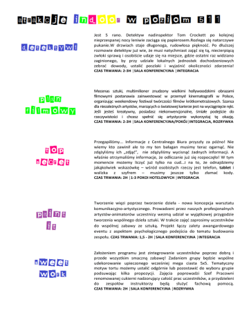 Jest 5 rano. Detektyw nadinspektor Tom Crockett po kolejnej nieprzespanej nocy leniwie zaciąga się papierosem.Rozlega się natarczywe pukanie.W drzwiach staje długonoga, rudowłosa piękność. Po dłuższej rozmowie detektyw już wie, że musi natychmiast zająć się tą, niecierpiącą zwłoki sprawą i osobiście udaje się na miejsce, gdzie ostatni raz widziano zaginionego, by przy udziale lokalnych jednostek dochodzeniowych zebrać dowody, ustalić poszlaki i wyjaśnić okoliczności zdarzenia! CZAS TRWANIA: 2-3H │SALA KONFERENCYJNA │INTEGRACJA Mecenas sztuki, multimilioner znudzony wielkimi hollywoodzkimi obrazami filmowymi postanawia zainwestować w przemysł kinematografii w Polsce, organizując weekendowy festiwal twórczości filmów krótkometrażowych. Szansa dla niezależnych artystów, marzących o światowej karierze jest na wyciągnięcie ręki. Jeśli jesteś kreatywny, posiadasz niekonwencjonalne, śmiałe podejście do rzeczywistości i chcesz spełnić się artystycznie wykorzystaj tę okazję. CZAS TRWANIA: 2-3H │SALA KONFERENCYJNA/POKÓJ│INTEGRACJA, ROZRYWKA Przegapiliśmy... Informacje z Centralnego Biura przyszły za późno! Nie wiemy kto zawinił ale to my ten bałagan musimy teraz ogarnąć. Nie zdążyliśmy ich „zdjąć”, nie zdążyliśmy wycisnąć żadnych informacji. A właśnie otrzymaliśmy informacje, że odliczanie już się rozpoczęło! W tym momencie możemy liczyć już tylko na cud...i na to, że odnajdziemy jakąkolwiek wskazówkę – wśród osobistych rzeczy jest telefon, tablet i walizka z szyfrem – musimy jeszcze tylko złamać kody. CZAS TRWANIA: 2H │1-3 POKOI HOTELOWYCH │INTEGRACJA Tworzenie więzi poprzez tworzenie dzieła - nowa koncepcja warsztatu komunikacyjno-artystycznego. Prowadzeni przez naszych profesjonalnych artystów-animatorów uczestnicy wezmą udział w wyjątkowej przygodzie tworzenia wspólnego dzieła sztuki. W trakcie zajęć zaprosimy uczestników do wspólnej zabawy ze sztuką. Projekt łączy zalety awangardowego eventu z aspektem psychologicznego podejścia do tematu budowania zespołu. CZAS TRWANIA: 1,5 - 2H │SALA KONFERENCYJNA │INTEGRACJA Założeniem programu jest zintegrowanie uczestników poprzez dobrą i przede wszystkim smaczną zabawę! Zadaniem grupy będzie wspólne udekorowanie upieczonego wcześniej mega ciasta 5x5. Tematyczny motyw tortu możemy ustalić odgórnie lub pozostawić do wyboru grupie podsuwając kilka propozycji. Zajęcia poprowadzi Szef Pracowni renomowanej cukierni nadzorujący całość prac uczestników, a przydzieleni do zespołów instruktorzy będą służyć fachową pomocą. CZAS TRWANIA: 2H │SALA KONFERENCYJNA │ROZRYWKA Podczas naszych „wspólnych”, firmowych wakacji sprawimy sobie w pełni profesjonalną i atrakcyjną sesję fotograficzną. Uczestnicy zabawy zostaną zaproszeni do specjalnie przygotowanego i wyposażonego studia fotograficznego, gdzie czekać będą wykwalifikowani fotograficy. Aby sesja była jednocześnie zabawą, nasi goście „wybiorą się” w podróż do ciekawych zakątków świata. CZAS TRWANIA: 2-3H │SALA KONFERENCYJNA/POKÓJ │INTEGRACJA Proponujemy grupie ciekawą integrację w rytm najbardziej znanych utworów z list przebojów. Każdy z zespołów będzie miał przydzielonego opiekuna - profesjonalnego operatora, który przekaże rady praktyczne, udzieli wskazówek i niezbędnego wsparcia artystom. Zespoły stworzą własny teledysk od podstaw, zaczynając od scenariusza, poprzez wybór wokali, tancerzy, muzyków, dobór kostiumów i rekwizytów, aż do REWELACYJNEGO WYKONANIA. Do dyspozycji grup oddamy obszerną garderobę z kostiumami, perukami, dodatkami i różnymi gadżetami. CZAS TRWANIA: 2-3H │SALA KONFERENCYJNA/POKÓJ │INTEGRACJA Zabawa dla przedsiębiorczych. Uczestnicy zostaną podzieleni na wielkie korporacje, których celem będzie osiągniecie milionowego przychodu i stworzenie tętniącego życiem City! Każda z korporacji sama wybierze sobie inwestować i pomnażać swój majątek, musi również wyznaczyć spośród swoich szeregów tych, którzy będą odpowiedzialni za poszczególne płaszczyzny jej funkcjonowania. Część będzie inwestowała na giełdzie, część zejdzie do podziemia a dla jeszcze innych fortuna okaże się łaskawa. CZAS TRWANIA: 2H │SALA KONFERENCYJNA │INTEGRACJA Każdy z nas po zobaczeniu relacji na żywo z Domino Day, chciałby kiedyś spróbować własnych sił w ustawianiu pełnych barw konstrukcji z kolorowych prostokątów. Przed uczestnikami naszej zabawy postawimy firmowy projekt Domino. Tysiące klocków, setki kombinacji, mega precyzja i kreatywność. Uczestnicy projektu pogrupowani w teamy "dominomaniaków" postarają się zrealizować poszczególne elementy, które złożą się na całość wspólnego dzieła. CZAS TRWANIA: 2-3H │SALA KONFERENCYJNA │ROZRYWKA Cudownie pachnąca kawa, filigranowe filiżanki i mnóstwo ciekawych na temat czarnego złota, z którego przygotowuje się najpopularniejszy napój świata. To właśnie wieczór z baristą połączony z pokazem latte art - sztuką robienia rysunków ze specjalnie przygotowanego mleka na powierzchni espresso. Uczestnicy będą mieli okazje poznać tajniki różnych technik parzenia kawy oraz form ozdabiania gotowego napoju. CZAS TRWANIAPOKAZU 5-7MIN │CZAS TRWANIA WARSZATÓW: KONFERENCYJNA / RESTAURACYJNA │WARSZTATY 2H │SALA Zapierające dech w piersiach sztuczki barmańskie, żonglerka butelkami, latające szklanki, shakery, a w efekcie końcowym wyśmienite koktajle przygotowane w efektownym i wykraczającym poza wyobraźnie stylu flair! Pokazy odbywają się przy rytmicznej muzyce dopasowanej do rodzaju charakteru imprezy. Barmani przeprowadzą dla uczestników krótki kurs barmański – zaprezentowane zostaną barmańskie sztuczki, niestandardowe sposoby podawania drinków, tajniki pracy za barem połączone z prezentacją na temat wybranych drinków i alkoholi. CZAS TRWANIAPOKAZU 