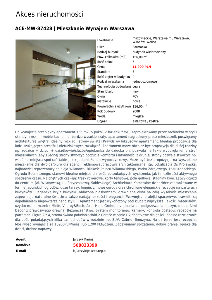 Akces nieruchomości ACE-MW-87428 | Mieszkanie Wynajem Warszawa Lokalizacja mazowieckie, Warszawa m., Warszawa, Wilanów, Wolica Ulica Sarmacka Rodzaj budynku budynek wielorodzinny Pow. całkowita [m2] 156,00 m2 Ilość pokoi 5 Cena 11 900 PLN Standard 5 Ilość pięter w budynku 4 Rodzaj mieszkania Jednopoziomowe Technologia budowlana cegła Stan lokalu inny Okna PCV Instalacje nowe Powierzchnia użytkowa 156,00 m2 Rok budowy 2008 Woda miejska Dojazd asfaltowa / kostka Do wynajęcia przepiękny apartament 156 m2, 5 pokoi, 2 łazienki z WC, zaprojektowany przez architekta w stylu skandynawskim, meble kuchenne, bardzo wysokie szafy, apartament nagrodzony przez miesięcznik poświęcony architekturze wnętrz, idealny rozkład i strony świata! Prawdziwy luksusowy apartament. Idealna propozycja dla ludzi szukających prestiżu i nietuzinkowych rozwiązań. Apartament może również być propozycja dla dużej rodziny np. rodzice + dzieci + dziadkowie/służba/opiekunka do dziecka pn. pozwala na takie wyodrębnienie stref mieszkalnych, aby z jednej strony stworzyć poczucie komfortu i intymności z drugiej strony pozwala stworzyć np. wspólne miejsca spotkań takie jak : jadalnia/salon wypoczynkowy. Może być też propozycją na wyszukane mieszkanie dla dwojga/biuro dla agencji reklamowej/pracowni architektonicznej itp. Lokalizacja Oś Królewska, najbardziej reprezentacyjna aleja Wilanowa. Bliskość Pałacu Wilanowskiego, Parku Zdrojowego, Lasu Kabackiego, Ogrodu Botanicznego, stanowi idealne miejsce dla osób poszukujących wyciszenia, jak i możliwości aktywnego spędzenia czasu. Na chętnych czekają: trasy rowerowe, korty tenisowe, pola golfowe, stadniny koni. Łatwy dojazd do centrum (Al. Wilanowską, ul. Przyczółkową, Sobieskiego) Architektura Kameralne dziedzińce zaaranżowane w formie japońskich ogrodów, duże tarasy, loggie, zimowe ogrody oraz chronione eleganckie recepcje na parterach budynków. Elegancka bryła budynku obłożona piaskowcem, drewniane okna na całą wysokość mieszkania zapewniają naturalne światło a także nadają lekkości i elegancji. Wewnętrzne alejki spacerowe, trawniki są dopełnieniem niepowtarzalnego stylu. . Apartament jest wykończony pod klucz z najwyższej jakości materiałów, użytko m. in. marek : Miele, Vileroy&Boch, Axor Hans Grohe, urządzenia do podgrzewania naczyń, meble Almi Decor z prawdziwego drewna. Bezpieczeństwo: System monitoringu, kamery, kontrola dostępu, recepcje na parterach. Piętro 2 z 4, strona świata połudn/zachód 2 Garaże w cenie+ 2 dodatkowe dla gości, idealne rozwiązanie dla osób poiadających kilka samochodów w rodzinie np. SUV, Cabrio, limuzyna. Na parterze jest recepcja. Możliwość wynajęcia za 10900PLN/mies. lub 1200 PLN/dzień. Zapewniamy sprzątanie, dobiór prania, opiekę dla dzieci, drobne naprawy. Agent Jurczyk Karina Komórka 508823390 E-mail [email protected]