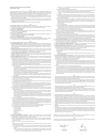 Szczególne warunki ubezpieczeń komunikacyjnych Program Volvo – Allianz § 1. W programie pakietowych ubezpieczeń komunikacyjnych Volvo, zwanym dalej Programem Volvo – Allianz, określonym w niniejszych szczególnych warunkach ubezpieczenia, zwanych dalej warunkami, Towarzystwo Ubezpieczeń i Reasekuracji Allianz Polska Spółka Akcyjna, zwane dalej Allianz, zawiera za pośrednictwem autoryzowanych dealerów Volvo Auto Polska Sp. z o.o. umowy ubezpieczenia pojazdów: 1) fabrycznie nowych i używanych marki Volvo do dziesiątego roku ich eksploatacji włącznie, liczonego od dnia pierwszej rejestracji, o ile zostały one sprzedane jako pojazdy fabrycznie nowe w sieci autoryzowanych dealerów Volvo na terenie Polski, 2) używanych marki Volvo do końca dziesiątego roku ich eksploatacji włącznie liczonego od daty pierwszej rejestracji, sprowadzonych do Polski pod warunkiem, iż pierwsza rejestracja pojazdu nastąpiła na terenie jednego z krajów europejskich , – z uwzględnieniem postanowień § 3 pkt 9) lit. a) i § 4 niniejszych warunków. § 2. Program Volvo – Allianz obejmuje następujące rodzaje ubezpieczeń: 1) obowiązkowe ubezpieczenie odpowiedzialności cywilnej posiadaczy pojazdów mechanicznych za szkody powstałe w związku z ruchem tych pojazdów, zwane dalej ubezpieczeniem OC, 2) ubezpieczenie Assistance do OC, 3) ubezpieczenie Zielonej Karty, 4) ubezpieczenie Autocasco pojazdów mechanicznych od uszkodzeń, zniszczeń i kradzieży – pełny zakres, zwane dalej ubezpieczeniem Autocasco, 5) ubezpieczenie Car Assistance, 6) ubezpieczenie następstw nieszczęśliwych wypadków kierowców i pasażerów pojazdów w związku z ruchem tych pojazdów, zwane dalej ubezpieczeniem NNW, 7) ubezpieczenie Informacja Prawna, 8) ubezpieczenie Ochrony Prawnej – w zależności od decyzji ubezpieczającego; 9) ubezpieczenie straty finansowej poniesionej z powodu kradzieży lub całkowitego zniszczenia pojazdu, zwane dalej ubezpieczeniem Straty Finansowej – w zależności od decyzji Ubezpieczającego. § 3. Program Volvo – Allianz obejmuje następujące rodzaje ubezpieczeń: 1) w zakresie ubezpieczenia OC – ogólne warunki obowiązkowego ubezpieczenia odpowiedzialności cywilnej posiadaczy pojazdów mechanicznych za szkody powstałe w związku z ruchem tych pojazdów, określone w Ustawie z dn. 22.05.2003 r. o ubezpieczeniach obowiązkowych, Ubezpieczeniowym Funduszu Gwarancyjnym i Polskim Biurze Ubezpieczycieli Komunikacyjnych (Dz. U. z 2003 r. Nr 124, poz. 1152 ,z późn. zm.); 2) w zakresie ubezpieczenia Assistance do OC – ogólne warunki ubezpieczenia Assistance do OC przyjęte uchwałą Zarządu TUiR Allianz Polska S.A. nr 71/2012 z dnia 15 czerwca 2012 r., zwane dalej w skrócie o.w.u. Assistance do OC, z uwzględnieniem następujących zmian (warunki szczególne): – ochrona ubezpieczeniowa udzielana jest w wariancie Mini Car Assistance. 3) w zakresie ubezpieczenia Zielonej Karty – ogólne warunki ubezpieczenia odpowiedzialności cywilnej posiadaczy pojazdów mechanicznych w ruchu zagranicznym przyjęte uchwałą Zarządu TUiR Allianz Polska S.A. nr 44/2012 z dnia 15 marca 2012 r.; 4) w zakresie ubezpieczenia Autocasco – ogólne warunki ubezpieczenia Autocasco przyjęte uchwałą Zarządu TUiR Allianz Polska S.A. nr 91/2013 z r., zwane dalej w skrócie o.w.u. autocasco, z uwzględnieniem następujących zmian (warunki szczególne): a) w przypadku pojazdów sprzedawanych dla korpusu dyplomatycznego dopuszcza się możliwość ustalenia sumy ubezpieczenia dla pojazdów fabrycznie nowych zgodnie z wartością potwierdzoną fakturą nabycia, która stanowi również sumę ubezpieczenia na drugi, trzeci rok eksploatacji pojazdu; b) suma ubezpieczenia pojazdu ustalona w umowie ubezpieczenia nie zmniejsza się w czasie trwania ubezpieczenia o kwotę wypłaconego odszkodowania (odszkodowań); c) przy zaistnieniu szkody całkowitej i kradzieżowej za wartość pojazdu dla celów ustalenia odszkodowania przyjmuje się: – sumę ubezpieczenia – w przypadku pojazdu fabrycznie nowego oraz w drugim, trzecim, czwartym i piątym roku eksploatacji, licząc od daty pierwszej rejestracji, w okresie 12 miesięcy od dnia zawarcia umowy ubezpieczenia; – wartość rynkową pojazdu w dniu zaistnienia zdarzenia objętego ochroną ubezpieczeniową, nie więcej jednak niż sumę ubezpieczenia określoną w umowie ubezpieczenia – w przypadku pojazdu od szóstego roku do dziesiątego roku eksploatacji włącznie, – sumę ubezpieczenia – dla pojazdu od szóstego roku eksploatacji, w okresie 12 miesięcy od dnia zawarcia umowy ubezpieczenia, pod warunkiem opłacenia dodatkowej składki określonej w taryfie składek;. d) w przypadku szkody częściowej pojazdu (niebędącej szkodą całkowitą w rozumieniu o.w.u. autocasco) likwidacja szkody następuje wyłącznie według wariantu serwisowego odpowiednio zgodnie z §3 ust.2 pkt 1) i §8 ust.3 o.w.u. autocasco; e) w §3 ust.9 o.w.u. autocasco otrzymuje brzmienie: „9. Za opłatą dodatkowej składki zakres ochrony ubezpieczeniowej może zostać rozszerzony o szkody wskazane w § 4 ust. 1 pkt 7) lit. a-c, pkt 17)”; f) zakres ubezpieczenia Autocasco zostaje rozszerzony o ubezpieczenie szyb, określone w §10 ust. 1 o.w.u. autocasco, bez konieczności opłaty dodatkowej składki ubezpieczeniowej. Klauzula ubezpieczenie szyb nie ma zastosowania w przypadku rozszerzenia zakresu ubezpieczenia o ubezpieczenie utraty zniżek za bezszkodowy przebieg ubezpieczenia, o którym mowa w lit. g); g) za opłatą dodatkowej składki, określonej w taryfie, istnieje możliwość rozszerzenia zakresu ubezpieczenia Autocasco, zawartego na okres jednego roku o ubezpieczenie utraty zniżek za bezszkodowy przebieg ubezpieczenia: – jeżeli w okresie ubezpieczenia Autocasco dojdzie do nie więcej niż dwóch szkód z tytułu Autocasco wówczas szkody te nie będą brane pod uwagę przez Allianz przy ustalaniu składki za bezszkodowy przebieg ubezpiec