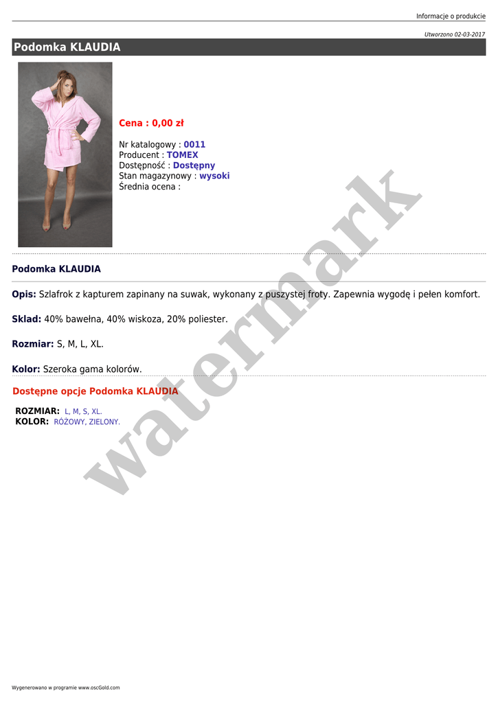 Informacje o produkcie Utworzono 02-03-2017 Podomka KLAUDIA Cena : 0,00 zł Podomka KLAUDIA er m ar k Nr katalogowy : 0011 Producent : TOMEX Dostępność : Dostępny Stan magazynowy : wysoki Średnia ocena : Opis: Szlafrok z kapturem zapinany na suwak, wykonany z puszystej froty. Zapewnia wygodę i pełen komfort. Sklad: 40% bawełna, 40% wiskoza, 20% poliester. Rozmiar: S, M, L, XL. Kolor: Szeroka gama kolorów. at Dostępne opcje Podomka KLAUDIA w ROZMIAR: L, M, S, XL. KOLOR: RÓŻOWY, ZIELONY. Wygenerowano w programie www.oscGold.com