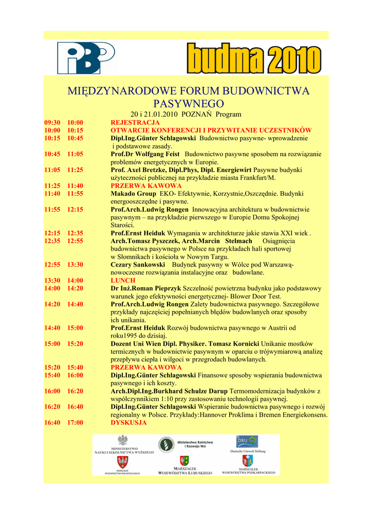MIĘDZYNARODOWE FORUM BUDOWNICTWA PASYWNEGO 20 i 21.01.2010 POZNAŃ Program 09:30 10:00 10:15 10:00 10:15 10:45 10:45 11:05 11:05 11:25 11:25 11:40 11:40 11:55 11:55 12:15 12:15 12:35 12:35 12:55 12:55 13:30 13:30 14:00 14:00 14:20 14:20 14:40 14:40 15:00 15:00 15:20 15:20 15:40 15:40 16:00 16:00 16:20 16:20 16:40 16:40 17:00 REJESTRACJA OTWARCIE KONFERENCJI I PRZYWITANIE UCZESTNIKÓW Dipl.Ing.Günter Schlagowski Budownictwo pasywne- wprowadzenie i podstawowe zasady. Prof.Dr Wolfgang Feist Budownictwo pasywne sposobem na rozwiązanie problemów energetycznych w Europie. Prof. Axel Bretzke, Dipl.Phys, Dipl. Energiewirt Pasywne budynki użyteczności publicznej na przykładzie miasta Frankfurt/M. PRZERWA KAWOWA Makado Group EKO- Efektywnie, Korzystnie,Oszczędnie. Budynki energooszczędne i pasywne. Prof.Arch.Ludwig Rongen Innowacyjna architektura w budownictwie pasywnym – na przykładzie pierwszego w Europie Domu Spokojnej Starości. Prof.Ernst Heiduk Wymagania w architekturze jakie stawia XXI wiek . Arch.Tomasz Pyszczek, Arch.Marcin Stelmach Osiągnięcia budownictwa pasywnego w Polsce na przykładach hali sportowej w Słomnikach i kościoła w Nowym Targu. Cezary Sankowski Budynek pasywny w Wólce pod Warszawąnowoczesne rozwiązania instalacyjne oraz budowlane. LUNCH Dr Inż.Roman Pieprzyk Szczelność powietrzna budynku jako podstawowy warunek jego efektywności energetycznej- Blower Door Test. Prof.Arch.Ludwig Rongen Zalety budownictwa pasywnego. Szczegółowe przykłady najczęściej popełnianych błędów budowlanych oraz sposoby ich unikania. Prof.Ernst Heiduk Rozwój budownictwa pasywnego w Austrii od roku1995 do dzisiaj. Dozent Uni Wien Dipl. Physiker. Tomasz Kornicki Unikanie mostków termicznych w budownictwie pasywnym w oparciu o trójwymiarową analizę przepływu ciepła i wilgoci w przegrodach budowlanych. PRZERWA KAWOWA Dipl.Ing.Günter Schlagowski Finansowe sposoby wspierania budownictwa pasywnego i ich koszty. Arch.Dipl.Ing.Burkhard Schulze Darup Termomodernizacja budynków z współczynnikiem 1:10 przy zastosowaniu technologii pasywnej. Dipl.Ing.Günter Schlagowski Wspieranie budownictwa pasywnego i rozwój regionalny w Polsce. Przykłady:Hannover Proklima i Bremen Energiekonsens. DYSKUSJA