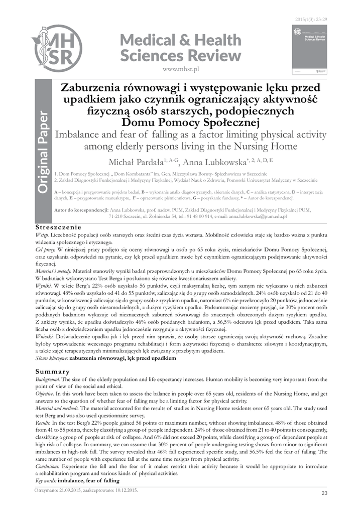 2015;1(3): 23-29 e-ISSN 2450-1670 Volume 1 Issue 3 Medical & Health Sciences Review Original Paper www.mhsr.pl www.mhsr.pl Zaburzenia równowagi i występowanie lęku przed upadkiem jako czynnik ograniczający aktywność fizyczną osób starszych, podopiecznych Domu Pomocy Społecznej Imbalance and fear of falling as a factor limiting physical activity among elderly persons living in the Nursing Home Michał Pardała1; A-G, Anna Lubkowska*, 2; A, D, E 1. Dom Pomocy Społecznej ,, Dom Kombatanta’’ im. Gen. Mieczysława Boruty- Spiechowicza w Szczecinie 2. Zakład Diagnostyki Funkcjonalnej i Medycyny Fizykalnej, Wydział Nauk o Zdrowiu, Pomorski Uniwersytet Medyczny w Szczecinie A – koncepcja i przygotowanie projektu badań, B – wykonanie analiz diagnostycznych, zbieranie danych, C – analiza statystyczna, D – interpretacja danych, E – przygotowanie manuskryptu, F – opracowanie piśmiennictwa, G – pozyskanie funduszy, * – Autor do korespondencji. Autor do korespondencji: Anna Lubkowska, prof. nadzw. PUM, Zakład Diagnostyki Funkcjonalnej i Medycyny Fizykalnej PUM, 71-210 Szczecin, ul. Żołnierska 54, tel.: 91 48 00 914, e-mail: [email protected] Str eszczenie Wstęp. Liczebność populacji osób starszych oraz średni czas życia wzrasta. Mobilność człowieka staje się bardzo ważna z punktu widzenia społecznego i etycznego. Cel pracy. W niniejszej pracy podjęto się oceny równowagi u osób po 65 roku życia, mieszkańców Domu Pomocy Społecznej, oraz uzyskania odpowiedzi na pytanie, czy lęk przed upadkiem może być czynnikiem ograniczającym podejmowanie aktywności fizycznej. Materiał i metody. Materiał stanowiły wyniki badań przeprowadzonych u mieszkańców Domu Pomocy Społecznej po 65 roku życia. W badaniach wykorzystano Test Berga i posłużono się również kwestionariuszem ankiety. Wyniki. W teście Berg’a 22% osób uzyskało 56 punktów, czyli maksymalną liczbę, tym samym nie wykazano u nich zaburzeń równowagi. 48% osób uzyskało od 41 do 55 punktów, zaliczając się do grupy osób samodzielnych. 24% osób uzyskało od 21 do 40 punktów, w konsekwencji zaliczając się do grupy osób z ryzykiem upadku, natomiast 6% nie przekroczyło 20 punktów, jednocześnie zaliczając się do grupy osób niesamodzielnych, z dużym ryzykiem upadku. Podsumowując możemy przyjąć, że 30% procent osób poddanych badaniom wykazuje od nieznacznych zaburzeń równowagi do znacznych obarczonych dużym ryzykiem upadku. Z ankiety wynika, że upadku doświadczyło 46% osób poddanych badaniom, a 56,5% odczuwa lęk przed upadkiem. Taka sama liczba osób z doświadczeniem upadku jednocześnie rezygnuje z aktywności fizycznej. Wnioski. Doświadczenie upadku jak i lęk przed nim sprawia, że osoby starsze ograniczają swoją aktywność ruchową. Zasadne byłoby wprowadzenie wczesnego programu rehabilitacji i form aktywności fizycznej o charakterze siłowym i koordynacyjnym, a także zajęć terapeutycznych minimalizujących lęk związany z przebytym upadkiem. Słowa kluczowe: zaburzenia równowagi, lęk przed upadkiem Summar y Background. The size of the elderly population and life expectancy increases. Human mobility is becoming very important from the point of view of the social and ethical. Objective. In this work have been taken to assess the balance in people over 65 years old, residents of the Nursing Home, and get answers to the question of whether fear of falling may be a limiting factor for physical activity. Material and methods. The material accounted for the results of studies in Nursing Home residents over 65 years old. The study used test Berg and was also used questionnaire survey. Results. In the test Berg’s 22% people gained 56 points or maximum number, without showing imbalances. 48% of those obtained from 41 to 55 points, thereby classifying a group of people independent. 24% of those obtained from 21 to 40 points in consequently, classifying a group of people at risk of collapse. And 6% did not exceed 20 points, while classifying a group of dependent people at high risk of collapse. In summary, we can assume that 30% percent of people undergoing testing shows from minor to significant imbalances in high-risk fall. The survey revealed that 46% fall experienced specific study, and 56.5% feel the fear of falling. The same number of people with experience fall at the same time resigns from physical activity. Conclusions. Experience the fall and the fear of it makes restrict their activity because it would be appropriate to introduce a rehabilitation program and various kinds of physical activities. Key words: imbalance, fear of falling Otrzymano: 21.09.2015, zaakceptowano: 10.12.2015. 23 Michał Pardała i wsp., Zaburzenia równowagi i występowanie lęku przed upadkiem jako czynnik ograniczający aktywność fizyczną osób starszych...i i występowanie lęku Wstęp Populacja ludzi starszych wzrasta, wraz z nią średni czas życia, natomiast potrzeba zapewnienia mobilności człowieka staje się bardzo ważna z punktu widzenia społecznego jak i również etycznego. Badania epidemiologiczne wykazuja, że upadki u osób starszych są częste oraz, że wśród osób starszych podatność na upadki zwiększa się wraz z wiekiem. Zaburzenia równowagi są jedną z przyczyn upadków. Według raportu Światowej Organizacji Zdrowia z 2004 roku zaburzenia równowagi i związane z nimi upadki dotyczą około 30 % osób po 65 roku życia, a po 75 roku życia odsetek ten jest znacząco wyższy [1]. Z badań wynika również, że do incydentów dochodzi najczęściej podczas aktywności ruchowej. Około 60% upadków osób starszych, następuje w momencie chodu, 40% ma miejsce podczas: wstawania, siadania czy schylania się i wykonywania skrętu tułowia [2]. Trudno jednak przystać na chęć ograniczenia aktywności ruchowej w obawie przed upadkiem. Do najczęstszych następstw upadków należą przede wszystkim złamania szyjki kości udowej, złaman