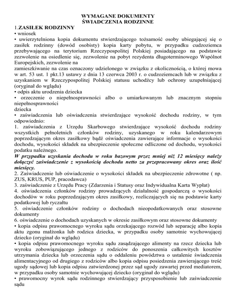 WYMAGANE DOKUMENTY ŚWIADCZENIA RODZINNE 1.ZASIŁEK RODZINNY • wniosek • uwierzytelniona kopia dokumentu stwierdzającego tożsamość osoby ubiegającej się o zasiłek rodzinny (dowód osobisty) kopia karty pobytu, w przypadku cudzoziemca przebywającego na terytorium Rzeczypospolitej Polskiej posiadającego na podstawie zezwolenie na osiedlenie się, zezwolenie na pobyt rezydenta długoterminowego Wspólnot Europejskich, zezwolenie na zamieszkiwanie na czas oznaczony udzielonego w związku z okolicznością, o której mowa w art. 53 ust. 1 pkt.13 ustawy z dnia 13 czerwca 2003 r. o cudzoziemcach lub w związku z uzyskaniem w Rzeczypospolitej Polskiej statusu uchodźcy lub ochrony uzupełniającej (oryginał do wglądu) • odpis aktu urodzenia dziecka • orzeczenie o niepełnosprawności albo o umiarkowanym lub znacznym stopniu niepełnosprawności dziecka • zaświadczenia lub oświadczenia stwierdzające wysokość dochodu rodziny, w tym odpowiednio: 1. zaświadczenia z Urzędu Skarbowego stwierdzające wysokość dochodu rodziny wszystkich pełnoletnich członków rodziny, uzyskanego w roku kalendarzowym poprzedzającym okres zasiłkowy bądź oświadczenia zawierające informacje o wysokości dochodu, wysokości składek na ubezpieczenie społeczne odliczone od dochodu, wysokości podatku należnego. W przypadku uzyskania dochodu w roku bazowym przez mniej niż 12 miesięcy należy dołączyć zaświadczenie z wysokością dochodu netto za przepracowany okres oraz ilość miesięcy. 2. Zaświadczenie lub oświadczenie o wysokości składek na ubezpieczenie zdrowotne ( np. ZUS, KRUS, PUP, pracodawca) 3. zaświadczenie z Urzędu Pracy (Zdarzenia i Statusy oraz Indywidualna Karta Wypłat) 4. oświadczenia członków rodziny prowadzących działalność gospodarczą o wysokości dochodów w roku poprzedzającym okres zasiłkowy, rozliczających się na podstawie karty podatkowej lub ryczałtu 5. oświadczenie członków rodziny o dochodach nieopodatkowanych oraz stosowne dokumenty 6. oświadczenie o dochodach uzyskanych w okresie zasiłkowym oraz stosowne dokumenty • kopia odpisu prawomocnego wyroku sądu orzekającego rozwód lub separację albo kopia aktu zgonu małżonka lub rodzica dziecka, w przypadku osoby samotnie wychowującej dziecko (oryginał do wglądu) • kopia odpisu prawomocnego wyroku sądu zasądzającego alimenty na rzecz dziecka lub wyroku zobowiązującego jednego z rodziców do ponoszenia całkowitych kosztów utrzymania dziecka lub orzeczenia sądu o oddaleniu powództwa o ustalenie świadczenia alimentacyjnego od drugiego z rodziców albo kopia odpisu posiedzenia zawierającego treść ugody sądowej lub kopia odpisu zatwierdzonej przez sąd ugody zawartej przed mediatorem, w przypadku osoby samotnie wychowującej dziecko (oryginał do wglądu) • prawomocny wyrok sądu rodzinnego stwierdzający przysposobienie lub zaświadczenie sądu rodzinnego lub ośrodka adopcyjnego o prowadzonym postępowaniu sądowym w sprawie o przysposobienie dziecka • zaświadczenie ze szkoły, w przypadku, gdy dziecko ukończyło 18 rok życia bądź oświadczenie • informacja sądu o toczącym się postępowaniu w sprawie o przysposobienie dziecka • dokument z numerem rachunku bankowego • kopię aktów zgonu rodziców lub kopię odpisów wyroków zasądzających alimenty w przypadku osoby uczącej się 2. DODATEK Z TYTUŁU URODZENIA DZIECKA przysługuje, po przedstawieniu zaświadczenia lekarskiego lub zaświadczenia wystawionego przez położną, potwierdzającego pozostawanie kobiety w czasie ciąży pod opieką medyczną nie później niż przed 10 tygodniem ciąży do porodu.* (przepisy ustawy z dnia 25 marca 2011 r. o ograniczaniu barier administracyjnych dla obywateli i przedsiębiorców nie przewidują możliwości zastąpienia w/w zaświadczenia oświadczeniem). Wzór powyższego zaświadczenia określony jest we wchodzącym w życie 1 stycznia 2012 r. rozporządzeniu Ministra Zdrowia z dnia 14 września 2010 r. w sprawie formy opieki medycznej nad kobietą w ciąży, uprawniającej do dodatku z tytułu urodzenia dziecka oraz wzoru zaświadczenia potwierdzającego pozostawanie pod tą opieką (Dz. U. z 2010 r., Nr 183, poz. 1234). *) przepisu ust 6 nie stosuje się do osób będących prawnymi lub faktycznymi opiekunami dziecka . 3. DODATEK Z TYTUŁU OPIEKI NAD DZIECKIEM W OKRESIE KORZYSTANIA Z URLOPU WYCHOWAWCZEGO • zaświadczenie z ZUS o zgłoszeniu do ubezpieczeń społecznych albo oświadczenie (w przypadku oświadczenia należy dołączyć imienny raport miesięczny osoby ubezpieczonej potwierdzający odprowadzanie składek na ubezpieczenie społeczne z miesiąca poprzedzającego miesiąc złożenia wniosku) • zaświadczenie od pracodawcy o udzieleniu urlopu (na jaki okres), jakie dziecko wraz z okresem pozostawania w stosunku pracy (od kiedy do kiedy) albo stosowne oświadczenie wnioskodawcy 4. DODATEK Z TYTUŁU SAMOTNEGO WYCHOWYWANIA DZIECKA • dokument stwierdzający stan cywilny osoby ubiegającej się • odpis aktu zgonu rodzica dziecka lub aktualny odpis zupełny aktu urodzenia dziecka lub orzeczenie sądu o oddaleniu powództwa o ustalenie świadczenia alimentacyjnego od drugiego z rodziców 5. DODATEK Z TYTUŁU KSZTAŁCENIA I REHABILITACJI DZIECKA NIEPEŁNOSPRAWNEGO • kopia orzeczenia o niepełnosprawności albo o umiarkowanym lub znacznym stopniu niepełnosprawności dziecka (oryginał do wglądu) 6. DODATEK Z TYTUŁU ROZPOCZĘCIA ROKU SZKOLNEGO • zaświadczenie ze szkoły ( data wrześniowa), w przypadku, gdy dziecko ukończyło 16 rok życia bądź stosowne oświadczenie 7. DODATEK Z TYTUŁU PODJĘCIA (LUB DOJAZDÓW) PRZEZ DZIECKO NAUKI POZA MIEJSCEM ZAMIESZKANIA • zaświadczenie ze szkoły oraz zaświadczenie potwierdzające miejsce zamieszkania albo stosowne oświadczenie ( bursa, internat itp.) w miejscowości, w której znajduje się szkoła jak również zaświadczenie albo oświadczenie o tymczasowym zameldowaniu 8. SKŁAD RO