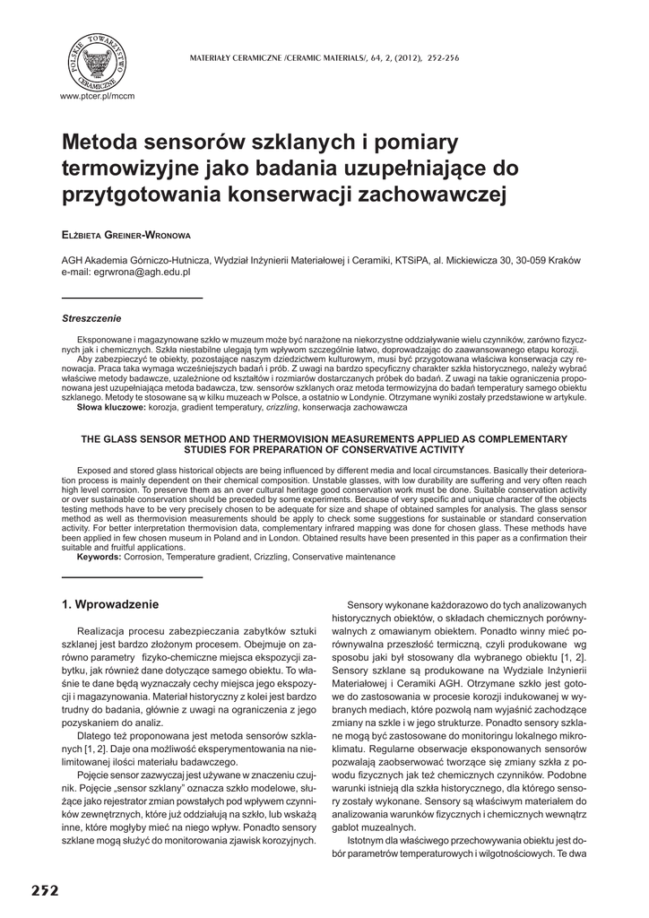 MATERIA£Y CERAMICZNE /CERAMIC MATERIALS/, 64, 2, (2012), 252-256 www.ptcer.pl/mccm Metoda sensorów szklanych i pomiary termowizyjne jako badania uzupeániające do przytgotowania konserwacji zachowawczej ELĩBIETA GREINER-WRONOWA AGH Akademia Górniczo-Hutnicza, Wydziaá InĪynierii Materiaáowej i Ceramiki, KTSiPA, al. Mickiewicza 30, 30-059 Kraków e-mail: [email protected] Streszczenie Eksponowane i magazynowane szkáo w muzeum moĪe byü naraĪone na niekorzystne oddziaáywanie wielu czynników, zarówno ¿zycznych jak i chemicznych. Szkáa niestabilne ulegają tym wpáywom szczególnie áatwo, doprowadzając do zaawansowanego etapu korozji. Aby zabezpieczyü te obiekty, pozostające naszym dziedzictwem kulturowym, musi byü przygotowana wáaĞciwa konserwacja czy renowacja. Praca taka wymaga wczeĞniejszych badaĔ i prób. Z uwagi na bardzo specy¿czny charakter szkáa historycznego, naleĪy wybraü wáaĞciwe metody badawcze, uzaleĪnione od ksztaátów i rozmiarów dostarczanych próbek do badaĔ. Z uwagi na takie ograniczenia proponowana jest uzupeániająca metoda badawcza, tzw. sensorów szklanych oraz metoda termowizyjna do badaĔ temperatury samego obiektu szklanego. Metody te stosowane są w kilku muzeach w Polsce, a ostatnio w Londynie. Otrzymane wyniki zostaáy przedstawione w artykule. Sáowa kluczowe: korozja, gradient temperatury, crizzling, konserwacja zachowawcza THE GLASS SENSOR METHOD AND THERMOVISION MEASUREMENTS APPLIED AS COMPLEMENTARY STUDIES FOR PREPARATION OF CONSERVATIVE ACTIVITY Exposed and stored glass historical objects are being inÀuenced by different media and local circumstances. Basically their deterioration process is mainly dependent on their chemical composition. Unstable glasses, with low durability are suffering and very often reach high level corrosion. To preserve them as an over cultural heritage good conservation work must be done. Suitable conservation activity or over sustainable conservation should be preceded by some experiments. Because of very speci¿c and unique character of the objects testing methods have to be very precisely chosen to be adequate for size and shape of obtained samples for analysis. The glass sensor method as well as thermovision measurements should be apply to check some suggestions for sustainable or standard conservation activity. For better interpretation thermovision data, complementary infrared mapping was done for chosen glass. These methods have been applied in few chosen museum in Poland and in London. Obtained results have been presented in this paper as a con¿rmation their suitable and fruitful applications. Keywords: Corrosion, Temperature gradient, Crizzling, Conservative maintenance 1. Wprowadzenie Realizacja procesu zabezpieczania zabytków sztuki szklanej jest bardzo záoĪonym procesem. Obejmuje on zarówno parametry ¿zyko-chemiczne miejsca ekspozycji zabytku, jak równieĪ dane dotyczące samego obiektu. To wáaĞnie te dane bĊdą wyznaczaáy cechy miejsca jego ekspozycji i magazynowania. Materiaá historyczny z kolei jest bardzo trudny do badania, gáównie z uwagi na ograniczenia z jego pozyskaniem do analiz. Dlatego teĪ proponowana jest metoda sensorów szklanych [1, 2]. Daje ona moĪliwoĞü eksperymentowania na nielimitowanej iloĞci materiaáu badawczego. PojĊcie sensor zazwyczaj jest uĪywane w znaczeniu czujnik. PojĊcie „sensor szklany” oznacza szkáo modelowe, sáuĪące jako rejestrator zmian powstaáych pod wpáywem czynników zewnĊtrznych, które juĪ oddziaáują na szkáo, lub wskaĪą inne, które mogáyby mieü na niego wpáyw. Ponadto sensory szklane mogą sáuĪyü do monitorowania zjawisk korozyjnych. 252 Sensory wykonane kaĪdorazowo do tych analizowanych historycznych obiektów, o skáadach chemicznych porównywalnych z omawianym obiektem. Ponadto winny mieü porównywalna przeszáoĞü termiczną, czyli produkowane wg sposobu jaki byá stosowany dla wybranego obiektu [1, 2]. Sensory szklane są produkowane na Wydziale InĪynierii Materiaáowej i Ceramiki AGH. Otrzymane szkáo jest gotowe do zastosowania w procesie korozji indukowanej w wybranych mediach, które pozwolą nam wyjaĞniü zachodzące zmiany na szkle i w jego strukturze. Ponadto sensory szklane mogą byü zastosowane do monitoringu lokalnego mikroklimatu. Regularne obserwacje eksponowanych sensorów pozwalają zaobserwowaü tworzące siĊ zmiany szkáa z powodu ¿zycznych jak teĪ chemicznych czynników. Podobne warunki istnieją dla szkáa historycznego, dla którego sensory zostaáy wykonane. Sensory są wáaĞciwym materiaáem do analizowania warunków ¿zycznych i chemicznych wewnątrz gablot muzealnych. Istotnym dla wáaĞciwego przechowywania obiektu jest dobór parametrów temperaturowych i wilgotnoĞciowych. Te dwa METODA SENSORÓW SZKLANYCH I POMIARY TERMOWIZYJNE JAKO BADANIA UZUPEàNIAJĄCE DO PRZYTGOTOWANIA KONSERWACJI ZACHOWAWCZEJ parametry rejestrowane są we wszystkich muzeach, celem kontroli warunków i moĪliwoĞci natychmiastowej interwencji w przypadku nieprzewidzianych zmian. NaleĪy tu podkreĞliü, Īe temperatura jest bardzo waĪnym czynnikiem w pracy konserwatorskiej. Jej zmiany mogą spowodowaü zróĪnicowane zmiany w materiale wskutek powstawania naprĊĪeĔ rozciągających pomiĊdzy strukturą powierzchni a strukturą podpowierzchniową. Zmiany temperatury mogą wywoáaü liczne zmiany mechaniczne, mieü wpáyw na rozwój procesu wietrzenia, co w konsekwencji prowadzi do przyspieszenia zmĊczenia materiaáu, jeĞli jest bardzo podatny na destrukcjĊ. RóĪnica temperatury wywoáuje przepáyw ciepáa pomiĊdzy dwoma ciaáami, to znaczy od cieplejszego do cháodniejszego. Temperatura jest miarą stanu cieplnego ciaáa (szkáa) i wpáywa na zdolnoĞü danego szkáa do reakcji z innymi otaczającymi mediami. Dlatego teĪ pomiar tego parametru, jak teĪ dáugoterminowe jego monitorowanie jest bardzo waĪnym elementem przy analizie procesu korozji. Z uwagi na regularnie powstające
