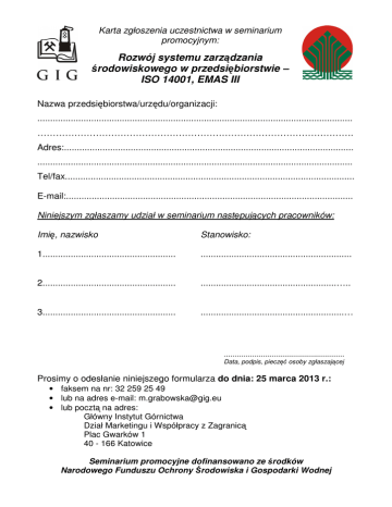 Karta zgłoszenia uczestnictwa w seminarium promocyjnym: Rozwój systemu zarządzania środowiskowego w przedsiębiorstwie – ISO 14001, EMAS III Nazwa przedsiębiorstwa/urzędu/organizacji: ........................................................................................................................... …………………………………………………………………………………………. Adres:................................................................................................................. ........................................................................................................................... Tel/fax................................................................................................................. E-mail:................................................................................................................ Niniejszym zgłaszamy udział w seminarium następujących pracowników: Imię, nazwisko Stanowisko: 1.................................................... ........................................................... 2.................................................... .....................................................….. 3.................................................... ........................................................… ....................................................... Data, podpis, pieczęć osoby zgłaszającej Prosimy o odesłanie niniejszego formularza do dnia: 25 marca 2013 r.: • faksem na nr: 32 259 25 49 • lub na adres e-mail: [email protected] • lub pocztą na adres: Główny Instytut Górnictwa Dział Marketingu i Współpracy z Zagranicą Plac Gwarków 1 40 - 166 Katowice Seminarium promocyjne dofinansowano ze środków Narodowego Funduszu Ochrony Środowiska i Gospodarki Wodnej