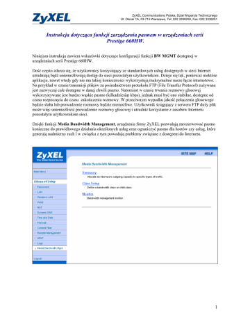 ZyXEL Communications Polska, Dział Wsparcia Technicznego Ul. Okrzei 1A, 03-715 Warszawa, Tel: 022 3338250, Fax: 022 3338251 Instrukcja dotycząca funkcji zarządzania pasmem w urządzeniach serii Prestige 660HW. Niniejsza instrukcja zawiera wskazówki dotyczące konfiguracji funkcji BW MGMT dostępnej w urządzeniach serii Prestige 660HW. Dość często zdarza się, Ŝe uŜytkownicy korzystający ze standardowych usług dostępnych w sieci Internet utrudniają bądź uniemoŜliwiają dostęp do sieci pozostałym uŜytkownikom. Dzieje się tak, poniewaŜ niektóre aplikacje, nawet wtedy gdy nie ma takiej konieczności wykorzystują maksymalnie nasze łącze internetowe. Na przykład w czasie transmisji plików za pośrednictwem protokołu FTP (File Transfer Protocol) zuŜywane jest zazwyczaj całe dostępne w danej chwili pasmo. Natomiast w czasie trwania rozmowy głosowej wykorzystywane jest bardzo wąskie pasmo (kilkadziesiąt kbps), jednak musi być ono stabilne, dostępne od czasu rozpoczęcia do czasu zakończenia rozmowy. W przeciwnym wypadku jakość połączenia głosowego będzie słaba lub prowadzenie rozmowy będzie niemoŜliwe. UŜytkownik ściągający z serwera FTP duŜy plik moŜe więc uniemoŜliwić prowadzenie rozmowy głosowej i utrudnić korzystanie z zasobów Internetu pozostałym uŜytkownikom sieci. Dzięki funkcji Media Bandwidth Management, urządzenia firmy ZyXEL pozwalają zarezerwować pasmo konieczne do prawidłowego działania określonych usług oraz ograniczyć pasmo dla hostów czy usług, które generują nadmierny ruch i w związku z tym powodują problemy związane z dostępem do Internetu. 1 ZyXEL Communications Polska, Dział Wsparcia Technicznego Ul. Okrzei 1A, 03-715 Warszawa, Tel: 022 3338250, Fax: 022 3338251 Parametry funkcji BW MGMT, które naleŜy zdefiniować w zakładce Summary zostały opisane poniŜej. Active: Zaznaczamy tę opcję aby aktywować mechanizm BW MGMT na danym interfejsie. JeŜeli chcemy zarządzać ruchem o kierunku WAN LAN to powinniśmy aktywować mechanizmy BW MGMT na interfejsie LAN. Reguły dla ruchu wychodzącego LAN WAN definiujemy natomiast na interfejsie WAN. Speed: W polu tym określamy wartośći stanowiące budŜet, z którego będziemy korzystać w trakcie definiowania klas BW MGMT dla danego interfejsu. W większości przypadków wartości te powinny być zgodne z parametrami naszego łącza internetowego. Scheduler: MoŜemy wybrać jedną z dwóch dostępnych opcji: Priority-Based - ruch o najwyŜszym priorytecie będzie obsługiwany w pierwszej kolejności. Fairness-Based – pasmo jest przydzielane na podstawie obliczonego współczynnika. ZałóŜmy, Ŝe mamy dwie klasy: A która potrzebuje 300kbps i B która potrzebuje 600kbps. Współczynnik dla A i B wynosi 1:2. Jeśli do dyspozycji mamy tylko 450kbps to klasa A otrzyma 150kbps, a B 300kbps. Maximize Bandwidth Usage: Zaznacz tę opcję jeśli chcesz aby uŜytkownicy przypisani do zdefiniowanych klas, mający większe niŜ zdefiniowane przez nas zapotrzebowanie na pasmo, mogli skorzystać z pasma nie przydzielonego aktualnie do Ŝadnej z klas. Nie zaznaczaj tej opcji jeśli chcesz zarezerwować pasmo dla ruchu, który nie pasuje do utworzonych klas lub jeśli chcesz ograniczyć pasmo dla tego interfejsu. 2 ZyXEL Communications Polska, Dział Wsparcia Technicznego Ul. Okrzei 1A, 03-715 Warszawa, Tel: 022 3338250, Fax: 022 3338251 Przykład 1: Nakładanie ograniczeń na ruchu wychodzący (LAN WAN). ZałoŜenia: - posiadamy łącze internetowe o parametrach 2M/512kbps, - w sieci LAN znajdują się: serwer FTP oraz Media server, Naszym zadaniem jest nałoŜenie odpowiednich ograniczeń na ruch wychodzący, skierowany z sieci LAN do Internetu, poniewaŜ mógłby on zuŜyć całe dostępne pasmo i tym samym zablokować dostęp do Internetu uŜytkownikom sieci lokalnej obsługiwanej przez urządzenie Prestige 660HW. - ruch wychodzący generowany przez serwer FTP ograniczymy do 100kbps, - wychodzący ruch UDP generowany przez Media server ograniczymy do 300kbps, Upstream 512kbps Downstream 2Mbps INTERNET Prestige 6 00 series LAN PWR /SYS 1 2 3 4 WLAN DSL/PPP LAN 300kbps 100kbps Media Server FTP Server 100kbps FTP 300kbps Media 3 ZyXEL Communications Polska, Dział Wsparcia Technicznego Ul. Okrzei 1A, 03-715 Warszawa, Tel: 022 3338250, Fax: 022 3338251 Krok 1: Aby nałoŜyć ograniczenia na ruch wychodzący aktywujemy więc BW MGMT na interfejsie WAN i zgodnie z parametrami naszego łącza internetowego do interfejsu WAN przypisujemy prędkość 512kbps. Krok 2: Przechodzimy do zakładki Class Setup, a następnie na interfejsie WAN definiujemy podklasy naszej klasy głównej. Class Name: Nadajemy nazwę, która będzie identyfikowała naszą podklasę. Bandwidth Budget: Zgodnie z naszymi załoŜeniami dla wychodzącego ruchu FTP przydzielamy pasmo 100kbps. Borrow bandwidth from parent class: Opcję tę pozostawiamy nie zaznaczoną, poniewaŜ nie chemy aby wychodzący ruch FTP zuŜywał więcej niŜ 100kbps dostępnego pasma. Enable Bandwidth Filter: Aktywujemy regułę filtra. Service: Z rozwijanej listy wybieramy usługę FTP. Destination IP Address/Mask: Pozostawiamy wartośći 0.0.0.0, oznacza to Ŝe filtr dotyczy wszystkich hostów korzystających z naszego serwera FTP. Source IP Address/Mask: podajemy odpowiednio adres IP serwera FTP, którego dotyczy nasz filtr oraz maskę 32bitową. Taka maska wskazuje, Ŝe nasza reguła dotyczy tylko tego konkretnego hosta. 4 ZyXEL Communications Polska, Dział Wsparcia Technicznego Ul. Okrzei 1A, 03-715 Warszawa, Tel: 022 3338250, Fax: 022 3338251 Krok 3: Definiujemy kolejną podklasę klasy głównej, tym razem będzie ona dotyczyła wychodzącego ruchu strumieniowego generowanego przez Media serwer. Class Name: Nadajemy nazwę, która będzie identyfikowała naszą podklasę. Bandwidth Budget: Zgodnie z załoŜeniami przydzielamy pasmo 300kbps i pozostawiamy nie zaznaczoną opcję poŜyczania pasma. Enable Bandwidth Filt