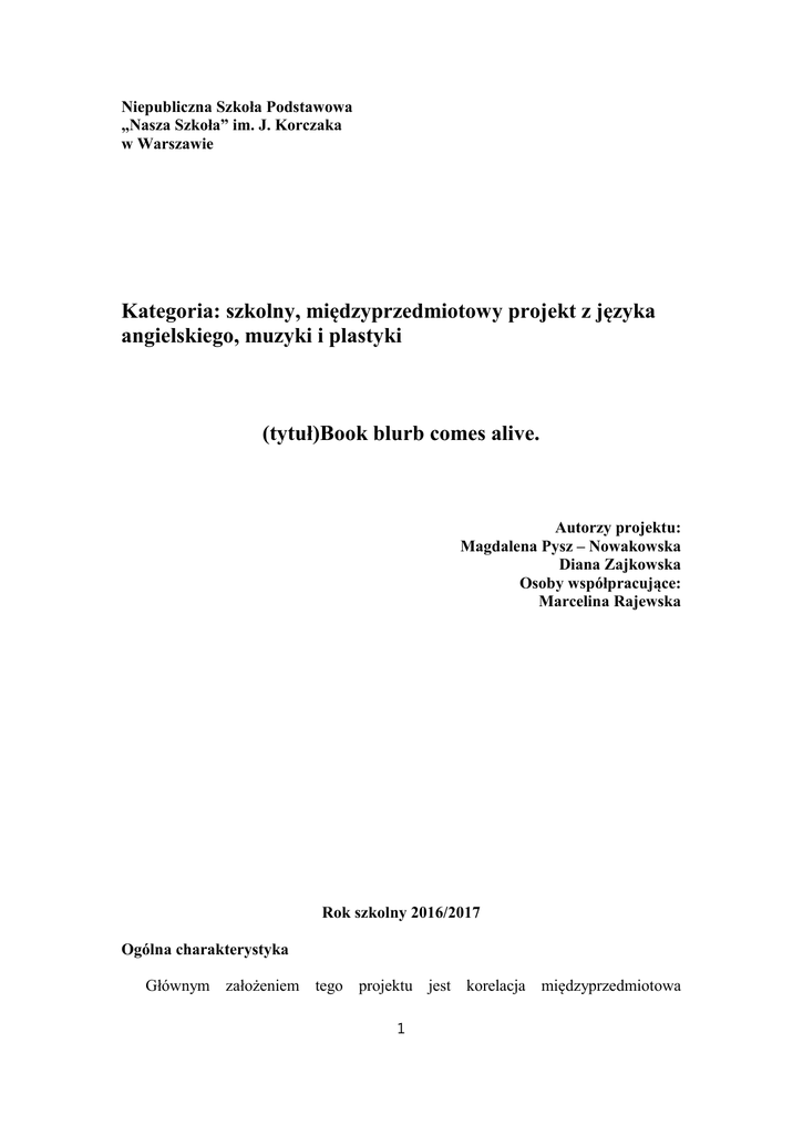 Niepubliczna Szkoła Podstawowa „Nasza Szkoła” im. J. Korczaka w Warszawie Kategoria: szkolny, międzyprzedmiotowy projekt z języka angielskiego, muzyki i plastyki (tytuł)Book blurb comes alive. Autorzy projektu: Magdalena Pysz – Nowakowska Diana Zajkowska Osoby współpracujące: Marcelina Rajewska Rok szkolny 2016/2017 Ogólna charakterystyka Głównym założeniem tego projektu jest korelacja międzyprzedmiotowa 1 prowadząca do wzrostu umiejętności językowych w zakresie języka angielskiego, rozwijania umiejętności artystycznych, kreatywności, kształcenia postaw twórczych oraz propagowanie czytelnictwa wśród uczniów szkoły. Ważnym aspektem jest także wychowywanie do odpowiedzialności za podejmowane działania podczas pracy w grupie, nabywanie umiejętności dokonywania samooceny własnej pracy. Projekt adresowany jest do uczniów klas 4-6. Uczniowie na lekcjach języka angielskiego będą czytali we fragmentach wybrane wspólnie z nauczycielem książki. Kolejnym etapem będzie opracowanie scenariusza „zwiastuna” poznanej pozycji, który może mieć różną formą artystyczną (teledysk, drama, komiks itp.). Podsumowaniem projektu będą prezentacje „zwiastunów” przygotowanych przez klasy biorące udział w projekcie. Zwycięzcę wyłoni głosowanie wśród uczniów. Cel ogólny : Rozwijanie umiejętności międzyprzedmiotowej. językowych i artystycznych w korelacji Cele szczegółowe język angielski Uczeń : rozumie wypowiedzi ze słuchu rozumie wypowiedzi pisemne tworzy wypowiedzi ustne przetwarza tekst stosuje strategie komunikacyjne posiada świadomość językową Cele szczegółowe plastyka Uczeń: podejmuje działalność twórczą, posługując się różnymi środkami wyrazu plastycznego, realizuje projekty służące kształtowaniu wizerunku oraz upowszechnianiu kultury w społeczności szkolnej, korzysta z przekazów medialnych oraz stosuje ich wytwory w swojej działalności twórczej. Cele szczegółowe muzyka Uczeń: 2 tworzy wypowiedzi muzyczne – wykonuje utwory muzyczne i tańce, improwizuje i komponuje proste struktury dźwiękowe i układy taneczno-ruchowe, wykorzystuje w śpiewie oraz w grze na instrumentach znajomość pojęć i terminów muzycznych określających podstawowe elementy muzyki, odtwarza ruchem i gestodźwiękami proste rytmy i schematy rytmiczne tworzy proste struktury rytmiczne, sygnały dźwiękowe, swobodne akompaniamenty, prosty dwugłos (burdon, nagłos), ilustracje dźwiękowe do scen sytuacyjnych, tekstów literackich i obrazów Sposoby realizacji : - praca indywidualna, - praca zespołowa w grupach - czytanie utworów literackich w języku angielskim, - spotkania, - konkurs, - inscenizacje, - happening, - wystawy, - prace plastyczne, Czas realizacji Realizacja projektu w szkole odbędzie się od września 2016r. do końca marca 2017r. Podsumowanie projektu odbędzie się 31.03.2017r. Osoby odpowiedzialne za realizację i przewidywane terminy przedsięwzięć. L.p. 1. Przedsięwzięcia Zapoznanie uczniów z projektem, zawarcie kontraktu (załącznik nr 1) Wybór książek, które będą czytane na lekcjach języka angielskiego Czytanie we fragmentach wybranych lektur 2. 3 Osoby odpowiedzialne Magdalena Pysz – Nowakowska Marcelina Rajewska Diana Zajkowska Magdalena Pysz – Nowakowska Marcelina Rajewska Przewidywany termin wrzesień 2016r. Do połowy grudnia 2016r. 3. Opracowanie scenariuszy „zwiastunów” przydział zadań, wyznaczenie terminów realizacji, osób odpowiedzialnych ustalenie terminów konsultacji Realizacja planowanych zadań 4. 5. Podsumowanie projektu – prezentacje „zwiastunów” przez poszczególne klasy uczestniczące w projekcie Ewaluacja projektu – samoocena uczniów biorących w nim udział (załącznik nr 2) 6. Magdalena Pysz – Nowakowska Marcelina Rajewska Diana Zajkowska Magdalena Pysz – Nowakowska Marcelina Rajewska Diana Zajkowska Magdalena Pysz – Nowakowska Marcelina Rajewska Diana Zajkowska Magdalena Pysz – Nowakowska Marcelina Rajewska Diana Zajkowska Do połowy stycznia 2017r. Do 17.03.2017r. 31.03.2017r. Pierwszy tydzień po zakończeniu projektu Przewidywane rezultaty Uczeń: - formułuje wypowiedzi ustne i pisemne w języku angielskim, - przekazuje ustnie informacje uzyskane z tekstu słuchanego i czytanego, - współdziała w grupie w lekcyjnym i pozalekcyjnym językowym projekcie, - wykorzystuje różne techniki samodzielnej pracy nad językiem, - działa twórczo, poszukuje oryginalnych rozwiązań, - potrafi wykorzystać wiedzę i umiejętności z muzyki i plastyki w przekazie informacji związanych z literaturą, - potrafi współdziałać w grupie, wykonywać przydzielone zadania, - dokonuje samooceny własnej pracy. Literatura Dryden G., Vos J., „Rewolucja w uczeniu”, Wydawnictwo Moderski i S-ka, Poznań 2000. Gołębniak B.D., „Uczenie metodą projektów”, WSiP, Warszawa 2002. 4 Królikowski J., „Nauczanie metodą projektów”, Wydawnictwo Dr Josef Raabe, Warszawa 2000. Królikowski J., „Projekt edukacyjny”, CODN, Warszawa 2000. Taraszkiewicz M., „Jak uczyć jeszcze lepiej! Szkoła pełna ludzi”, Wydawnictwo Szkolne Romy Koper ARKA sp. z o.o., Poznań 2001. Załączniki Nr 1 KONTRAKT MIĘDZY UCZNIAMI KLASY A OPIEKUNEM PROJEKTU DATA ZAWARCIA KONTRAKTU………………………………………………… I. TEMAT PROJEKTU:………………………………………………………………………… ………………………………………………………………………… II. PRZYDZIAŁ ZADAŃ PROJEKTOWYCH: LP. ZADANIE OSOBA/Y TERMIN ODPOWIEDZIALNA/E WYKONANIA 1 2 3 4 5 6 7 8 9 10 11 5 IV. TERMINY I FORMY KONSULTACJI Z OPIEKUNEM PROJEKTU I NAUCZYCIELAMI WSPOMAGAJĄCYMI: V. KONSEKWENCJE ZA NIEDOTRZYMANIE USTALONYCH TERMINÓW I ZASAD: Podpisy członków grupy projektowej: opiekunów ………………………………………………………………… ……………………………………………