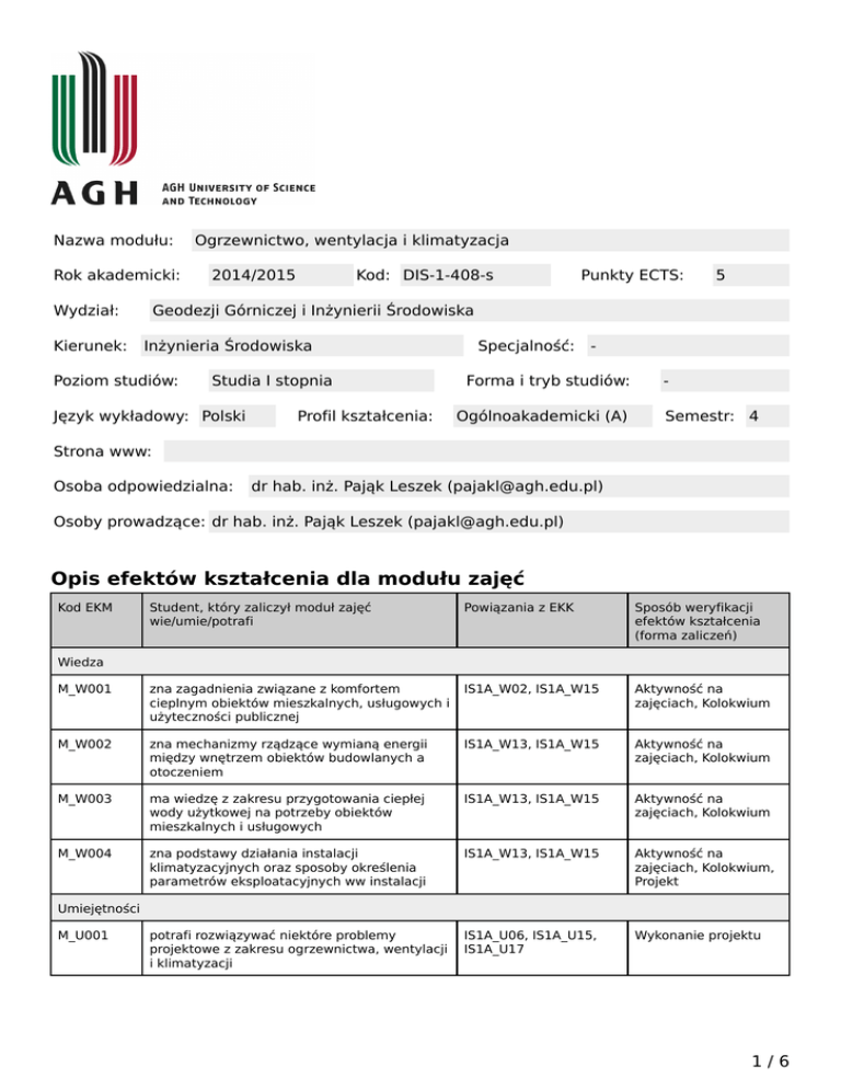 Nazwa modułu: Rok akademicki: Wydział: Kierunek: Ogrzewnictwo, wentylacja i klimatyzacja 2014/2015 Kod: DIS-1-408-s Punkty ECTS: 5 Geodezji Górniczej i Inżynierii Środowiska Inżynieria Środowiska Poziom studiów: Studia I stopnia Język wykładowy: Polski Profil kształcenia: Specjalność: - Forma i tryb studiów: Ogólnoakademicki (A) Semestr: 4 Strona www: Osoba odpowiedzialna: dr hab. inż. Pająk Leszek ([email protected]) Osoby prowadzące: dr hab. inż. Pająk Leszek ([email protected]) Opis efektów kształcenia dla modułu zajęć Kod EKM Student, który zaliczył moduł zajęć wie/umie/potrafi Powiązania z EKK Sposób weryfikacji efektów kształcenia (forma zaliczeń) M_W001 zna zagadnienia związane z komfortem cieplnym obiektów mieszkalnych, usługowych i użyteczności publicznej IS1A_W02, IS1A_W15 Aktywność na zajęciach, Kolokwium M_W002 zna mechanizmy rządzące wymianą energii między wnętrzem obiektów budowlanych a otoczeniem IS1A_W13, IS1A_W15 Aktywność na zajęciach, Kolokwium M_W003 ma wiedzę z zakresu przygotowania ciepłej wody użytkowej na potrzeby obiektów mieszkalnych i usługowych IS1A_W13, IS1A_W15 Aktywność na zajęciach, Kolokwium M_W004 zna podstawy działania instalacji klimatyzacyjnych oraz sposoby określenia parametrów eksploatacyjnych ww instalacji IS1A_W13, IS1A_W15 Aktywność na zajęciach, Kolokwium, Projekt potrafi rozwiązywać niektóre problemy projektowe z zakresu ogrzewnictwa, wentylacji i klimatyzacji IS1A_U06, IS1A_U15, IS1A_U17 Wykonanie projektu Wiedza Umiejętności M_U001 1/6 Karta modułu - Ogrzewnictwo, wentylacja i klimatyzacja M_U002 potrafi określić przybliżone zapotrzebowania na moc i energię instalacji ogrzewania, przygotowania ciepłej wody użytkowej, klimatyzacji i zapotrzebowania na powietrze świeże obiektów mieszkalno-usługowych IS1A_U01, IS1A_U03, IS1A_U17, IS1A_U25 Wykonanie projektu M_U003 potrafi zaproponować modyfikacje instalacji klimatyzacyjnej zmierzające do poprawy jej efektywności i potrafi obliczyć efekty proponowanych rozwiązań IS1A_U15, IS1A_U27 Aktywność na zajęciach, Projekt M_U004 potrafi określić główne parametry projektowe instalacji ogrzewania, wentylacji i klimatyzacji, w zakresie zapotrzebowania na strumień czynnika roboczego i jego parametry IS1A_U17 Wykonanie projektu IS1A_K01, IS1A_K02 Aktywność na zajęciach Kompetencje społeczne M_K001 ma świadomość efektów swojej pracy na: opinię o nowych technologiach, komfort użytkowania, środowisko, bezpieczeństwo energetyczne Matryca efektów kształcenia w odniesieniu do form zajęć Konwersatori um Zajęcia seminaryjne Zajęcia praktyczne Zajęcia terenowe Zajęcia warsztatowe zna zagadnienia związane z komfortem cieplnym obiektów mieszkalnych, usługowych i użyteczności publicznej + - - - - - - - - - - M_W002 zna mechanizmy rządzące wymianą energii między wnętrzem obiektów budowlanych a otoczeniem + - - - - - - - - - - M_W003 ma wiedzę z zakresu przygotowania ciepłej wody użytkowej na potrzeby obiektów mieszkalnych i usługowych + - - - - - - - - - - M_W004 zna podstawy działania instalacji klimatyzacyjnych oraz sposoby określenia parametrów eksploatacyjnych ww instalacji + - - - - - - - - - - potrafi rozwiązywać niektóre problemy projektowe z zakresu ogrzewnictwa, wentylacji i klimatyzacji - - - + - - - - - - - E-learning Ćwiczenia projektowe M_W001 Inne Ćwiczenia laboratoryjne Forma zajęć Ćwiczenia audytoryjne Student, który zaliczył moduł zajęć wie/umie/potrafi Wykład Kod EKM Wiedza Umiejętności M_U001 2/6 Karta modułu - Ogrzewnictwo, wentylacja i klimatyzacja M_U002 potrafi określić przybliżone zapotrzebowania na moc i energię instalacji ogrzewania, przygotowania ciepłej wody użytkowej, klimatyzacji i zapotrzebowania na powietrze świeże obiektów mieszkalno-usługowych - - - + - - - - - - - M_U003 potrafi zaproponować modyfikacje instalacji klimatyzacyjnej zmierzające do poprawy jej efektywności i potrafi obliczyć efekty proponowanych rozwiązań - - - + - - - - - - - M_U004 potrafi określić główne parametry projektowe instalacji ogrzewania, wentylacji i klimatyzacji, w zakresie zapotrzebowania na strumień czynnika roboczego i jego parametry - - - + - - - - - - - + - - + - - - - - - - Kompetencje społeczne M_K001 ma świadomość efektów swojej pracy na: opinię o nowych technologiach, komfort użytkowania, środowisko, bezpieczeństwo energetyczne Treść modułu zajęć (program wykładów i pozostałych zajęć) Wykład Komfort cieplny Podstawy z zakresu higieny jako czynniki kreujące kryteria, którym sprostać muszą instalacje ogrzewania, wentylacji i klimatyzacji (komfort cieplny, jakość powietrza, oddziaływanie budynku na zdrowie człowieka). Fizyka budowli - wprowadzenie 1. Bilans cieplny budynku, elementy składowe bilansu: zyski i straty energii. Bilans zapotrzebowania na powietrze świeże. 2. Charakterystyka elementów składowych budynku, wprowadzenie definicji i pojęć opisujących budynek (charakterystyka cieplna i wentylacyjna). Charakterystyka odbiorcy (grzewcza, wentylacyjna i klimatyzacyjna) 1. Krzywa uporządkowana zapotrzebowania na moc, średnioroczny i sezonowy współczynnik wykorzystania mocy zainstalowanej. 2. Obliczeniowe ustalanie charakterystyki budynku (cieplnej i wentylacyjnej) przy różnych poziomach szczegółowości – wykorzystując dane: wskaźnikowe, uszczegółowione, dokładne. Wprowadzenie do metodyki stosowanej dla certyfikacji energetycznej budynków, wykorzystanie statystycznych danych pogodowych, strefy występowania temperatur obliczeniowych. 3. Wpływ parametrów opisujących atmosferę na potrzeby cieplne, klimatyzacyjne i wentylacyjne. Źródła ogólnie dostępnych danych pogodowych. Źródła i dystrybucja ciepła, chłodu 3/6 Karta modułu - Ogrzewnictwo, wentylacja i klimatyzacja 1. Wymagania stawiane elementom składowym systemu energetycznego: źródło energii – system dystrybucji n