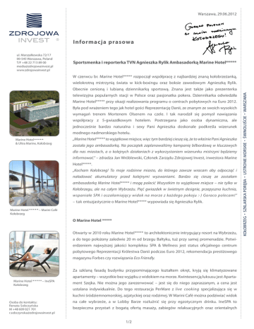 Warszawa, 29.06.2012 Informacja prasowa ul. Marszałkowska 72/17 00-545 Warszawa, Poland T/F +48 22 713 89 00 [email protected] www.zdrojowainvest.pl Sportsmenka i reporterka TVN Agnieszka Rylik Ambasadorką Marine Hotel***** W czerwcu br. Marine Hotel***** rozpoczął współpracę z najbardziej znaną kołobrzeżanką, wielokrotną mistrzynią świata w kick-boxingu oraz boksie zawodowym Agnieszką Rylik. współpracy z 5-gwiazdkowym hotelem. Postrzegana jako osoba dynamiczna, ale jednocześnie bardzo naturalna i sexy Pani Agnieszka doskonale podkreśla wizerunek modnego nadmorskiego hotelu. Marine Hotel & Ultra Marine, Kołobrzeg „Marine Hotel***** to wyjątkowe miejsce, więc tym bardziej cieszę się, że to właśnie Pani Agnieszka została jego ambasadorką. Na początek zaplanowaliśmy kampanię bilbordową w kluczowych dla nas miastach, a o kolejnych działaniach z wykorzystaniem wizerunku mistrzyni będziemy informować.” – zdradza Jan Wróblewski, Członek Zarządu Zdrojowej Invest, inwestora Marine Hotel*****. „Kocham Kołobrzeg! To moje rodzinne miasto, do którego zawsze wracam aby odpocząć i naładować akumulatory przed kolejnymi wyzwaniami. Bardzo się cieszę ze zostałam ambasadorką Marine Hotel***** i mogę polecić Wszystkim to wyjątkowe miejsce – nie tylko w Kołobrzegu, ale na całym Wybrzeżu. Pięć gwiazdek w świetnym designie, przepyszna kuchnia, wspaniałe SPA i oszałamiający widok na morze z każdego pokoju :-) Goraco polecam!” – tak entuzjastycznie o Marine Hotel***** wypowiada się Agnieszka Rylik. Marine Hotel Kołobrzeg − Marini Café O Marine Hotel ***** Otwarty w 2010 roku Marine Hotel***** to architektonicznie intrygujący resort na Wybrzeżu, a do tego położony zaledwie 20 m od brzegu Bałtyku, tuż przy samej promenadzie. Potwierdzeniem najwyższej jakości kompleksu SPA & Wellness jest status oficjalnego centrum pobytowego Reprezentacji Królestwa Danii podczas Euro 2012, rekomendacja prestiżowego magazynu Forbes czy rozwiązania Eco Friendly. Za szklaną fasadą budynku przypominającego kształtem okręt, kryją się klimatyzowane apartamenty – wszystkie bez wyjątku z widokiem na morze. Kwintesencją luksusu jest ApartaMarine Hotel Kołobrzeg − IneSPA ment Szejka. Nie można jego zarezerwować – jest się do niego zapraszanym, a cena jest ustalana indywidualnie. Do tego restauracja PerMare z live cooking specjalizująca się w kuchni śródziemnomorskiej, azjatyckiej oraz rodzimej. W Marini Café można podziwiać widok Osoba do kontaktu: Renata Sobczyńska M +48 609 021 701 [email protected] na całe wybrzeże, a w Lobby Barze rozluźnić się przy egzotycznym drinku. IneSPA to bezpieczna przystań z bogatą ofertą masaży, zabiegów relaksacyjnych oraz orientalnych 1/2 ŚWINOUJŚCIE wymagań trenem Mortenem Olsenem na czele. I tak narodził się pomysł nawiązania USTRONIE MORSKIE Była pod wrażeniem tego jak hotel gości Reprezentację Danii, ze znanym ze swoich wysokich SZKLARSKA PORĘBA Marine Hotel***** przy okazji realizowania programu o centrach pobytowych na Euro 2012. KOŁOBRZEG telewizyjna popularnych stacji w Polsce oraz pasjonatka pokera. Dziennikarka odwiedziła WARSZAWA Obecnie cenioną i lubianą dziennikarką sportową. Znana jest także jako prezenterka rytuałów. Do dyspozycji Gości są baseny, świat saun i łaźni, prysznic wrażeń, siłownia czy Ricochet. Niekwestionowanymi atrakcjami – basen pływacki z muzyką podwodną i całoroczne zewnętrzne jacuzzi zewnętrzne oraz grota śnieżna. Natomiast designerski klub MarinGo! z kręgielnią zapewni całonocną rozrywkę. Dla dzieci przygotowano wiele atrakcji, m.in. pokój zabaw oraz „małpi gaj” oraz liczne udogodnienia, stąd tytuł Hotel Przyjazny Rodzinie za 2011 rok. Jedno z największych Centrów konferencyjno-bankietowych na Wybrzeżu, mogącą zapewnić ul. Marszałkowska 72/17 00-545 Warszawa, Poland T/F +48 22 713 89 00 [email protected] www.zdrojowainvest.pl komfort nawet 450 osobom sprawia, że to miejsce idealne także na turystykę biznesową. Naszym głównym produktem są obiekty apartamentowo-hotelowe i usługowe z opcjonalnym systemem zarządzania wynajmem, czyli apartamenty na sprzedaż z gwarancją zysku dla Kupującego i możliwością korzystania z apartamentu na własne potrzeby. Wszystkie inwestycje mają charakter premium, a realizowane są w najpiękniejszych polskich miejscowościach wypoczynkowych i tylko w topowych lokalizacjach. Sand Hotel , Kołobrzeg Zdrojowa Invest odnosi liczne sukcesy. M.in. w 2012 roku znalazła się w zestawieniu największych polskich podmiotów gospodarczych „Rzeczpospolitej” – Lista 2000. Natomiast kołobrzeski Marine Hotel*****, którego jest inwestorem, był centrum pobytowym Reprezentacji Królestwa Danii podczas Euro 2012. Zdrojowa Invest jest grupą odpowiedzialną społecznie, troszczącą się o rozwój sztuki i środowisko w ramach, odpowiednio, programu Zdrojowa Art i Zdrojowa Eco Friendly. Więcej informacji na: www.zdrojowainvest.pl Ściągnij logotypy i zdjęcia naszych inwestycji w wysokiej rozdzielczości z: www.zdrojowainvest.pl zakładka: Biuro Prasowe >> Pobierz multimedia KOŁOBRZEG Cristal Resort Szklarska Poręba ŚWINOUJŚCIE apartamentów wakacyjnych i sieć condo hoteli, których jest również pionierem w Polsce. USTRONIE MORSKIE inwestycyjno-deweloperski i hotelarski w segmencie second home. Największy deweloper SZKLARSKA PORĘBA Zdrojowa Invest to dynamicznie rozwijający się rodzinny, kołobrzeski holding WARSZAWA O deweloperze Baltic Park Molo, Świnoujście Osoba do kontaktu: Renata Sobczyńska M +48 609 021 701 [email protected] 2/2 Copyright © Zdrojowa Invest Sp. z o.o.