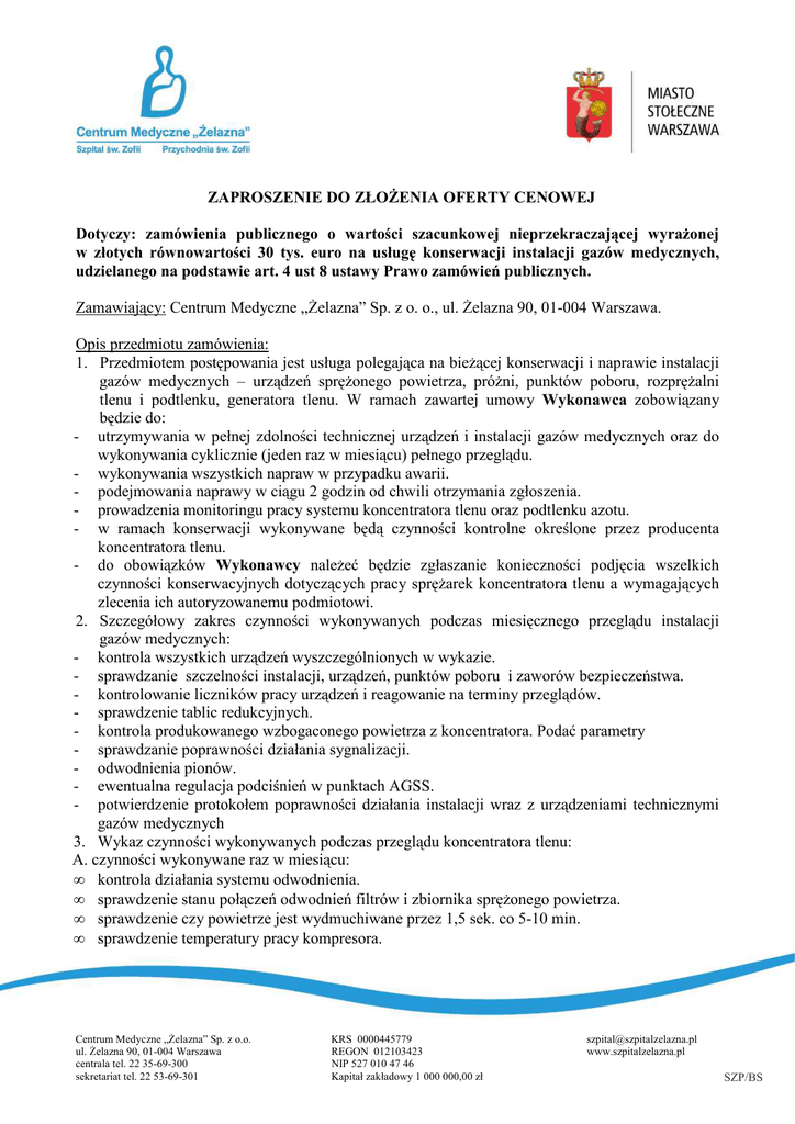 ZAPROSZENIE DO ZŁOŻENIA OFERTY CENOWEJ Dotyczy: zamówienia publicznego o wartości szacunkowej nieprzekraczającej wyrażonej w złotych równowartości 30 tys. euro na usługę konserwacji instalacji gazów medycznych, udzielanego na podstawie art. 4 ust 8 ustawy Prawo zamówień publicznych. Zamawiający: Centrum Medyczne „Żelazna” Sp. z o. o., ul. Żelazna 90, 01-004 Warszawa. Opis przedmiotu zamówienia: 1. Przedmiotem postępowania jest usługa polegająca na bieżącej konserwacji i naprawie instalacji gazów medycznych – urządzeń sprężonego powietrza, próżni, punktów poboru, rozprężalni tlenu i podtlenku, generatora tlenu. W ramach zawartej umowy Wykonawca zobowiązany będzie do: - utrzymywania w pełnej zdolności technicznej urządzeń i instalacji gazów medycznych oraz do wykonywania cyklicznie (jeden raz w miesiącu) pełnego przeglądu. - wykonywania wszystkich napraw w przypadku awarii. - podejmowania naprawy w ciągu 2 godzin od chwili otrzymania zgłoszenia. - prowadzenia monitoringu pracy systemu koncentratora tlenu oraz podtlenku azotu. - w ramach konserwacji wykonywane będą czynności kontrolne określone przez producenta koncentratora tlenu. - do obowiązków Wykonawcy należeć będzie zgłaszanie konieczności podjęcia wszelkich czynności konserwacyjnych dotyczących pracy sprężarek koncentratora tlenu a wymagających zlecenia ich autoryzowanemu podmiotowi. 2. Szczegółowy zakres czynności wykonywanych podczas miesięcznego przeglądu instalacji gazów medycznych: - kontrola wszystkich urządzeń wyszczególnionych w wykazie. - sprawdzanie szczelności instalacji, urządzeń, punktów poboru i zaworów bezpieczeństwa. - kontrolowanie liczników pracy urządzeń i reagowanie na terminy przeglądów. - sprawdzenie tablic redukcyjnych. - kontrola produkowanego wzbogaconego powietrza z koncentratora. Podać parametry - sprawdzanie poprawności działania sygnalizacji. - odwodnienia pionów. - ewentualna regulacja podciśnień w punktach AGSS. - potwierdzenie protokołem poprawności działania instalacji wraz z urządzeniami technicznymi gazów medycznych 3. Wykaz czynności wykonywanych podczas przeglądu koncentratora tlenu: A. czynności wykonywane raz w miesiącu: • kontrola działania systemu odwodnienia. • sprawdzenie stanu połączeń odwodnień filtrów i zbiornika sprężonego powietrza. • sprawdzenie czy powietrze jest wydmuchiwane przez 1,5 sek. co 5-10 min. • sprawdzenie temperatury pracy kompresora. Centrum Medyczne „Żelazna” Sp. z o.o. ul. Żelazna 90, 01-004 Warszawa centrala tel. 22 35-69-300 sekretariat tel. 22 53-69-301 KRS 0000445779 REGON 012103423 NIP 527 010 47 46 Kapitał zakładowy 1 000 000,00 zł [email protected] www.szpitalzelazna.pl SZP/BS • • • sprawdzenie ciśnienia powietrza zasilającego koncentrator , powinno wynosić 2,5 bara. sprawdzenie wskaźnika zanieczyszczenia kolumny węglowej, powinien być koloru białego. sprawdzenie poprawności działania sygnalizatora, poprzez naciśnięcie przycisku TEST na sygnalizatorze generatora tlenu zamontowanym w dyspozytorni. • sprawdzenie stanu rezerwy butlowej. • umycie podłogi, utrzymanie wymaganej czystości we wszystkich pomieszczeniach technicznych do gazów medycznych. • zgłoszenie Zleceniodawcy zauważonych nieprawidłowości i przystąpienie do ich usunięcia (zgodnie z postanowieniami umowy). • dokonanie wpisu do dziennika tlenowni wszystkich wykonanych czynności kontrolnych oraz zauważonych nieprawidłowości. • sprawdzenie poprawności załączania rezerwy butlowej, poprzez zamknięcie zaworu doprowadzającego powietrze do koncentratora bądź odłączenie zasilania elektrycznego do koncentratora. Jeśli system przełączania zadziałał, instalacja powinna być zasilana z rezerwy butlowej, a sygnalizacja awaryjna włączyć się. • ponowne przełączenie na zasilanie instalacji z koncentratora, poprzez doprowadzenie powietrza do koncentratora lub załączenie zasilania i sprawdzenie czy nastąpiło skuteczne przełączenie koncentratora do sieci, a sygnalizacja awaryjna zadziałała. • osłuchanie szczelności połączeń mechanicznych. B. Wymiana elementów filtrujących • wkład filtra wstępnego - co 3 miesiące lub 2000 roboczogodzin pracy sprężarki. • wkład filtra dokładnego - co 6 miesięcy lub 4000 roboczogodzin pracy sprężarki. 4. Wykonawca musi posiadać wszelkie wymagane prawem uprawnienia do wykonywania czynności w celu realizacji niniejszej Umowy 5. Usługi objęte Umową Wykonawca wykona przy użyciu własnych narzędzi i materiałów. Termin wykonania zamówienia oraz sposób płatności. 1. Termin realizacji zamówienia: przez 12 miesięcy od daty podpisania umowy. 2. Należność za wykonanie przedmiotu Umowy będzie regulowana w terminie 30 dni licząc od daty dostarczenia przez Wykonawcę prawidłowo wystawionej faktury wraz z załączonym raportem. Opis sposobu obliczenia ceny 1. Oferta musi zawierać: - wartość netto całego zamówienia (liczbowo i słownie) - wartość podatku Vat ( liczbowo i słownie) - wartość brutto całego zamówienia ( liczbowo i słownie) 2. Cenę podaną w ofercie (brutto w PLN) należy określić z dokładnością do dwóch miejsc po przecinku. 3. Jeżeli w postępowaniu zostanie złożona oferta, której wybór prowadziłby do powstania obowiązku podatkowego Zamawiającego zgodnie z przepisami o podatku od towarów Centrum Medyczne „Żelazna” Sp. z o.o. ul. Żelazna 90, 01-004 Warszawa centrala tel. 22 35-69-300 sekretariat tel. 22 53-69-301 KRS 0000445779 REGON 012103423 NIP 527 010 47 46 Kapitał zakładowy 1 000 000,00 zł [email protected] www.szpitalzelazna.pl SZP/BS i usług w zakresie dotyczącym wewnątrzwspólnotowego nabycia towarów, Zamawiający w celu oceny takiej oferty doliczy do przedstawionej w niej ceny podatek od towarów i usług, który miałby obowiązek wpłacić zgodnie z obowiązującymi przepisami. 4. Cena podana w ofercie jest