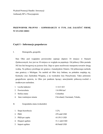 Wydział Promocji Handlu i Inwestycji Ambasady RP w Waszyngtonie PRZEWODNIK PRAWNO – GOPDODARCZY O TYM, JAK ZAŁOŻYĆ FIRMĘ W STANIE OHIO Część I – Informacje gospodarcze I. Demografia, geografia Stan Ohio pod względem powierzchni zajmuje dopiero 34 miejsce w Stanach Zjednoczonych, lecz jest na 10 miejscu ze względu na populacje. Od północy Ohio posiada 502 km lini brzegowej na jeziorze Erie. Daje to spore możliwości transportu towarów drogą wodną. Na północy przebiega też granica z kanadyjskim Ontario. Od północnego-zachodu stan graniczy z Michigan. Na zachód od Ohio leży Indiana, na południu znajdują się, Kentucky oraz Zachodnia Wirginia, a na wschodzie leży Pensylwania. Takie położenie geograficzne sprawia, że Ohio jest punktem łączący amerykański północny-wschód z środkowym-zachodem. 1. Liczba ludności 11 613 423 2. Powierzchnia 116 096 km² 3. Stolica stanu Columbus 4. Cleveland, Cincinnati, Toledo, Inne ważniejsze miasta II. Gospodarka stanu (wskaźniki) 1. Stopa bezrobocia 5.2% 2. PKB 478 mld USD 3. PKB per capita 41159.3 USD 4. Eksport ogółem 51.1 mld USD 5. Import ogółem 68.9mld USD Wymiana handlowa z Polską Dane z raportu International Trade Administration Bilans handlowy między Polską a Teksasem w 2015 wynosił 142.9 mln USD. Bilans jest dodatni, ponieważ wartość sprzedanych towarów przez Polskę do Teksasu była wyższa, niż wartość zakupionych towarów przez Polskę z Teksasu. Eksport towarów z Polski do Ohio w 2015 roku wynosił 310.9 mln USD. Najważniejsze grupy towarowe eksportu z Polski do Ohio: Sprzęt transportowy – 159 mln USD Produkty metalowe – 46.3 mln USD Maszyny (z wyjątkiem elektrycznych) – 34.6 mln USD Produkty chemiczne– 14.5 mln USD Pozostałe – 56.5 mln USD. W 2015 do Polski wyeksportowano z Illinois towary o łącznej wartości 168 mln USD. Najważniejsze grupy zakupionych przez Polskę towarów z Ohio: Maszyny (z wyjątkiem elektrycznych) – 59.7 mln USD Sprzęt transportowy – 54.1 mln USD Produkty metalowe – 9 mln USD Napoje i wyroby tytoniowe – 8.2 mln USD Pozostałe – 36.95 mln USD. Najważniejsze branże Rolnictwo (uprawy): soja, pomidory, kukurydza Rolnictwo (hodowla): bydło, trzoda chlewna, drób Przemysł: motoryzacja, przemysł stalowy, plastik i zaawansowane materiały, sprzęt elektryczny, przetwórstwo żywności 2 III. Ważniejsze firmy w Ohio Amerykańskie: Procter & Gamble, Smuckers, DayGlo, Abercrombie & Fitch, Nestle, Wendy’s, Victoria Secret, Western & Southern Financial Group, Trans States Airlines, Goodyear, Holiser Co., GE Aviation, Macy’s Inc. AmTrust Bank IV. Aktywność małych firm i starup-ów w Ohio. Współczynnik Kauffmana (2015) Pod względem aktywności małych firm (zatrudniających mniej niż 50 pracowników), Ohio znajduje się na 17 miejscu wśród 25 największych stanów USA. Jest to ta sama pozycja, którą stan zajmował w 2014 roku. W Ohio 5.2% społeczeństwa prowadzi własny biznes jako główne źródło zarobków. Na 100 000 mieszkańców działa 976.9 małych firm. Ohio zajęło w 2015 roku 37 miejsce wśród 50 stanów USA pod względem aktywności startupów. Jest to spadek o jedną lokatę (36 miejsce w 2014). Każdego miesiąca w stanie Ohio, 0.21% dorosłej populacji zostaje niezależnymi przedsiębiorcami. W tym 89% nie jest bezrobotna przed podjęciem własnej działalności. Jest to 4 najwyższy wynik w stanach. Na 100 000 mieszkańców Ohio powstaje prawie 90 start-upów. Część druga Kwartalnik Area Development Magazine wybrał Ohio dziewiątym najlepszym stanem do prowadzenia biznesu w 2015 roku. Utrzymał tę pozycję, na którą udało mu się wskoczyć w 2014 roku. Stan Ohio oferuje świetne środowisko biznesowe dzięki zmniejszającym się podatkom oraz idealnej lokalizacji. AD Magazine wskazał na wiele czynników, które dały Ohio tak wysoką pozycje w ich rankingu: Infrastruktura, dzięki swojemu położeniu przez stan przewożone jest wiele towarów, drogą lądową, jak i wodną; Łatwy dostęp do szerokiego wyboru wyspecjalizowanych pracowników; Najwyższe ulgi i obniżki podatków od 2013 roku. W szczególności wspierające małe biznesy i przedsiębiorców; Ponad 250 000 stanowisk pracy stworzonych podczas administracji Pana John’a Kabsch’a; Gospodarka odbiła się od ciężkiego stanu podczas Wielkiej Recesji; 3 Wiele Amerykańskich spółek spoza stanu Ohio decyduje się na „onshoring” części funkcji właśnie tutaj (w szczególności call-centers); Główne porty na jeziorze Erie oraz dobrze zintegrowana infrastruktura na rzece Ohio, pozwalają na przewóz ponad 103 milionów ton ładunku każdego roku. Daje to stanowi Ohio 8 miejsce pod tym względem; Ohio posiada 10 intermodalnych obiektów łączących drogi, pociągi, porty i lotniska; Ohio otrzymało “Golden Shovel” award w 2016 roku od Area Development. Nadawana jest ona stanom, którym udało się przyciągnąć wartościowe inwestycje. Dzięki tym inwestycjom stworzyli wiele miejsc pracy na obszarach stanów. Przykładowe zachęty / granty: Granty Stan i rząd federalny nie fundują żadnych grantów dla start-upów na terenie Ohio. Jednakże na stronie www.grants.gov można znaleźć wszelkie rządowe granty dla już istniejących biznesów. W lokalnych bibliotekach można również znaleźć „The Grants Guide”, która przedstawia pomocne informacje o grantach w sektorze prywatnym. Pożyczki W Ohio działa wiele programów pożyczkowych pomagających start-upom i wschodzącym firmom. Informacje o nich można znaleźć na stronie www.business.ohio.gov/starting oraz w lokalnym Small Business Development Center (SBDC). Część trzecia – zagadnienia prawno – podatkowe Założenie firmy w stanie Ohio, polega na podjęciu 4 głównych kroków: 1. Zarejestruj swój biznes u Sekretarza Stanu Ohio a. Wyszukaj nazwę, którą chcesz nadać swojej firmie w bazie danych Sekretarza Stanu Ohio: http://www5.sos.state.oh.us/ords/f?p=1