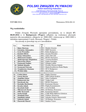 POLSKI ZWIĄZEK PŁYWACKI Polish Swimming Federation 01-813 Warszawa ul. Marymoncka 34 Skr. Poczt. 37 +48 22 8353589,+48 22 8342556, fax +48 22 8353983 [email protected] NIP:118-01-72-707 REGON 000866389 Konto: PKO BP II O/M Warszawa 90 1020 1026 0000 1502 0015 2132 PZP/181/2016 Warszawa 2016-04-14 Wg rozdzielnika Polski Związek Pływacki uprzejmie powiadamia, że w dniach 0708.05.2016 r. w Budapeszcie (Węgry) odbędzie się wielomecz pływacki juniorów dla zawodników, chłopców ur. 2000-2001 i dziewcząt ur. 2002-2003 z udziałem reprezentacji Czech, Słowacji, Węgier i Polski. Na zawody te powołuje się n/w zawodników: Lp. 1. 2. 3. 4. 5. 6. 7. 8. 9. 10. 11. 12. 13. 14. 15. 16. 17. 18. 19. 20. 21. 22. 23. 24. 25. 26. 27. 28. Nazwisko i imię Rok ur. Klub Buko Martyna Górnicka Aleksandra Groń Weronika Kaniak Oliwia Knop Aleksandra Mielczarek Sandra Modrzejewska Magdalena Murawska Maria Pastuszuk Paulina Skibiak Klaudia Szymczak Patrycja Trambowicz Zuzanna Wróbel Julia 2002 2002 2003 2002 2003 2002 2002 2003 2003 2002 2002 2002 2003 Medyk Giżycko MKP Szczecin Rekin Bydgoszcz Juvenia Wrocław UKS-190 Łódź BUKS Warszawa Victoria Racibórz Piątka Ostrołęka Olimpia Lublin Dwójka Morena Gdańsk Manta Kochłowice Ruda Śląska SP 63 Bydgoszcz Iskra Konin Cieśla Oskar Goraj Marcin Jemielita Oskar Kałusowski Jan Karolczak Jan Koziejko Bartłomiej Kraska Jakub Krzykała Emil Młynarczyk Karol Oller Krzysztof Sacha Kamil Siemiński Piotr Smoliński Jakub Sobiecki Jakub Żurawski Marcel 2001 2001 2001 2000 2001 2000 2000 2001 2000 2000 2001 2000 2000 2001 2001 Piątka Chorzów SMS Galicja Kraków Orka Ciechanów Trójka Łódź BUKS Warszawa Kormoran Olsztyn Piątka Konstantynów Avia Świdnik G8 Bielany Warszawa Kormoran Olsztyn CSiR MOS Dąbrowa Górnicza Żoliborz Warszawa Jedynka Ożarów Mazowiecki G8 Bielany Warszawa Sambor Tczew 1 Prosimy także o oddelegowanie n/w osób: 1. 2. 3. 4. 5. 6. 7. Brus Robert Chylak Dorota Gieczewski Piotr Krużołek Piotr Majerski Michał Pliszka Sławomir Rakowski Bartosz PZP BUKS Warszawa Medyk Giżycko Victoria SMS Racibórz SMS Galicja Kraków Olimpia Lublin PZP Kierownik Trener Trener Trener Trener Trener Fizjoterapeuta Zbiórka powołanych 5 maja 2016 w hotelu Ibis Budget Stare Miasto ul. Pawia 11, 31-154 Kraków do godziny 19.00. Prosimy o potwierdzenie potrzeby noclegów z 8/9 maja w Krakowie (planowany przyjazd około 20.00-21.00) do trenera Piotra Woźnickiego na adres mailowy [email protected] do dnia 20 kwietnia 2016 roku. W sprawie zgłoszenia startów poza konkursem lub ewentualnych korekt w zgłoszeniu do konkurencji prosimy o kontakt z trenerem Piotrem Woźnickim /do dnia 24 kwietnia 2016 roku / na adres mailowy [email protected]. Powołani zostaną wyposażeni w sprzęt firmy ARENA według następujących zasad: - uczestnicy wielomeczu w Limassol (Cypr) – koszulki (2 sztuki), kostium startowy, - pozostali: dres, koszulki (2 sztuki), szorty, klapki (zawodnicy ponadto czepki, slipy/kostiumy, okulary). Pozostały sprzęt indywidualny do zawodów należy zabrać ze sobą. Prosimy o bezzwłoczne podanie rozmiarów: koszulki i dresy (XL, L, M, S), klapki, kostiumy startowe Arena wg rozmiarów „INT” kostium Arena Carbon Air na adres [email protected]. Zawodnicy niepełnoletni muszą posiadać pisemne zgody rodziców na wyjazd, a ci którzy nie będą odbierani przez swoich rodziców ponadto muszą posiadać pisemne upoważnienia opiekunów prawnych do odbioru przez wskazane osoby trzecie. Osoby wyjeżdżające z PZP po raz pierwszy proszone są o bezzwłoczne podanie (emailem na adres [email protected] faxem lub telefonicznie) dat urodzenia, adresu zamieszkania i nr paszportu do ubezpieczenia. Kosztów przyjazdu do Krakowa i powrotu do miejsc zamieszkania nie pokrywa PZP. Pozostałe koszty pokrywa PZP. PREZES Andrzej Kowalski Otrzymują: 1. Zainteresowane Kluby/SMS 2. a/a 2 Program zawodów: I BLOK SOBOTA 7 MAJA godz. 10.00 1 2 3 4 5 6 7 8 9 10 11 12 13 14 Konkurencja 50 dowolnym M 50 dowolnym K 200 motylkowym M 200 motylkowym K 100 grzbietowym M 100 grzbietowym K 1500 dowolnym M 400 dowolnym K 100 klasycznym M 100 klasycznym K 200 zmiennym M 200 zmiennym K 4x100 dowolnym M 4x100 dowolnym K 15 16 17 18 19 20 21 22 23 24 25 26 Konkurencja 200 dowolnym M 200 dowolnym K 50 klasycznym M 50 klasycznym K 200 grzbietowym M 200 grzbietowym K 50 motylkowym M 50 motylkowym K 400 zmiennym M 400 zmiennym K 4x200 dowolnym M 4x200 dowolnym K 27 28 29 30 31 32 33 34 35 36 37 38 Konkurencja 100 dowolnym M 100 dowolnym K 50 grzbietowym M 50 grzbietowym K 200 klasycznym M 200 klasycznym K 100 motylkowym M 100 motylkowym K 400 dowolnym M 800 dowolnym K 4x100 zmiennym M 4x100 zmiennym K Nazwisko imię - starszy Smoliński Jakub Mielczarek Sandra Oller Krzystof Trambowicz Zuzanna Smoliński Jakub Modrzejewska Magdalena Koziejko Bartłomiej Trambowicz Zuzanna Siemiński Piotr Kaniak Oliwia Kałusowski Jan Buka Martyna 2 osoby 2 osoby Nazwisko imię - młodszy Karolczak Jan Murawska Maria Cieśla Oskar Groń Weronika Goraj Marcin Knop Aleksandra Karolczak Jan Knop Aleksandra Sobiecki Jakub Pastuszuk Paulina Sacha Kamil Wróbel Julia 2 osoby 2 osoby II BLOK SOBOTA 7 MAJA godz. 17.00 Nazwisko imię - starszy Mynarczyk Karol Skibiak Klaudia Siemiński Piotr Kaniak Oliwia Młynarczyk Karol Górnicka Aleksandra Smoliński Jakub Trambowicz Zuzanna Kałusowski Jan Buko Maryna 2 osoby 2 osoby Nazwisko imię -mlodszy Krzykała Emil Wróbel Julia Sobiecki Jakub Pastuszuk Paulina Karolczak jan Knop Aleksandra Goraj Marcin Wróbel Julia Sacha Kamil Knop Aleksandra 2 osoby 2 osoby III BLOK NIEDZIELA 8 MAJA godz. 10.00 Nazwisko imię Kraska Jakub Szymczak Patrycja Smoliński Jakub Modrzejewska Magdalena Siemiński Piotr Kaniak Oliwia Smoliński Jakub Trambowicz Zuzanna Koziejko Bartłomiej Skibiak Klaudia 2 osoby 2 osoby Nazwisko imię Jemielita Oskar Murawska Maria Karolczak Jan Knop Aleksandra Żurawski Marcel Pastuszuk Paulina Goraj Marcin Wróbel Julia Karocz