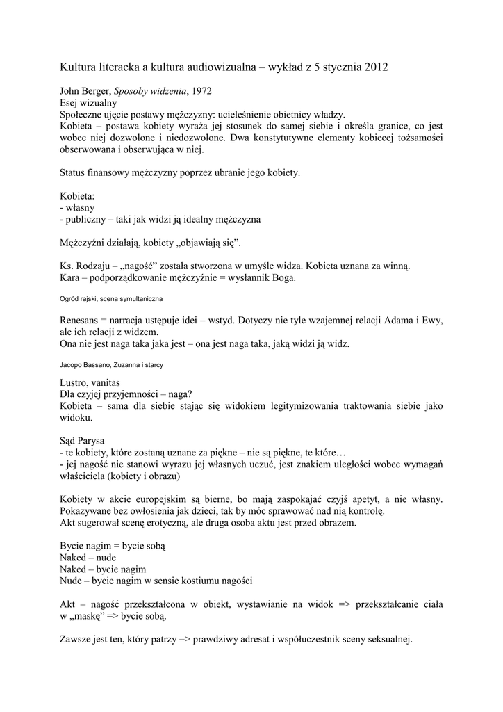 Kultura literacka a kultura audiowizualna – wykład z 5 stycznia 2012 John Berger, Sposoby widzenia, 1972 Esej wizualny Społeczne ujęcie postawy mężczyzny: ucieleśnienie obietnicy władzy. Kobieta – postawa kobiety wyraża jej stosunek do samej siebie i określa granice, co jest wobec niej dozwolone i niedozwolone. Dwa konstytutywne elementy kobiecej tożsamości obserwowana i obserwująca w niej. Status finansowy mężczyzny poprzez ubranie jego kobiety. Kobieta: - własny - publiczny – taki jak widzi ją idealny mężczyzna Mężczyźni działają, kobiety „objawiają się”. Ks. Rodzaju – „nagość” została stworzona w umyśle widza. Kobieta uznana za winną. Kara – podporządkowanie mężczyźnie = wysłannik Boga. Ogród rajski, scena symultaniczna Renesans = narracja ustępuje idei – wstyd. Dotyczy nie tyle wzajemnej relacji Adama i Ewy, ale ich relacji z widzem. Ona nie jest naga taka jaka jest – ona jest naga taka, jaką widzi ją widz. Jacopo Bassano, Zuzanna i starcy Lustro, vanitas Dla czyjej przyjemności – naga? Kobieta – sama dla siebie stając się widokiem legitymizowania traktowania siebie jako widoku. Sąd Parysa - te kobiety, które zostaną uznane za piękne – nie są piękne, te które… - jej nagość nie stanowi wyrazu jej własnych uczuć, jest znakiem uległości wobec wymagań właściciela (kobiety i obrazu) Kobiety w akcie europejskim są bierne, bo mają zaspokajać czyjś apetyt, a nie własny. Pokazywane bez owłosienia jak dzieci, tak by móc sprawować nad nią kontrolę. Akt sugerował scenę erotyczną, ale druga osoba aktu jest przed obrazem. Bycie nagim = bycie sobą Naked – nude Naked – bycie nagim Nude – bycie nagim w sensie kostiumu nagości Akt – nagość przekształcona w obiekt, wystawianie na widok => przekształcanie ciała w „maskę” => bycie sobą. Zawsze jest ten, który patrzy => prawdziwy adresat i współuczestnik sceny seksualnej. Alegoria czasu i piękna. Własność: - frontalizm Wyjątki – gdy przedstawiana kobieta jest ukazana w tak wyjątkowy sposób, że nie dopuszcza się do „zawłaszczania” i przejęcie jej wizerunku przez widza. Malarz i modelka – nierozłączni. Jej rola i intencje zawarte w ekspresji postaci. Peter Paul Rubens, Portret Heleny w futrze, XVI w. Rembrandt, Danae, XVII w. Akt europejski traktowany jako wyraz humanistycznego ducha Europy, nieodłącznie związanego z indywidualizmem. Tycjan, Wenus z Urbino, 1538 Édouard Manet, Olimpia, 1863 – intertekstualny, odnosi się do Tycjana; modelka jest prostytutką, obraz wywołał skandal. Wzrok modelki – nie jestem kimś, kto jest ci dany do zabawy, lecz ja tu rozdaję karty. Katrzyna Kozyra, Olimpia, 1996 Yasumasa Morimura, Olimpia / portret, 1998 OBRAZ Czym jest obraz? Najprościej rzecz ujmując obraz to jeden spośród tych dobrze znanych przedmiotów, które widzimy zawieszone na ścianach, wklejone do albumu lub zdobiące strony ilustrowanych książek. W najszerszym sensie obraz to jest sytuacja, w której pojawia się image. Image – coś, co jest wyobrażone. Obraz jest zdarzeniowy. John Berger, Sposoby widzenia Obraz 1. Zawsze jest wytworem człowieka (a krajobraz?) 2. Obraz to widok, który został odtworzony lub zreprodukowany 3. Każdy obraz ucieleśnia jakiś sposób widzenia 4. Nasza percepcja / ocena obrazu zależy od naszego własnego sposobu widzenia. Funkcje obrazu - obrazy w celu wyczarowania wyglądu tego, co nieobecne -> REPREZENTACJA - żaden inny rodzaj zabytków czy tekstów z przeszłości nie daje tak bezpośredniego świadectwa o świecie, który otaczał ludzi Znaczenie obrazu - w epoce reprodukcji znaczenie obrazów nie jest do nich przywiązane na stał. Jego cechą jest transponowalność, co oznacza, że staje się informacją pewnego typu i jak w przypadku każdej informacji – albo się z niej korzysta, albo się je ignoruje. - korzystanie = modyfikacja. 2 Obrazy poprzez reprodukcję otaczają nas jak język. Od XIX w. wzmagają się wszelkie typy komunikacji. XX w. – otoczenie ludzkich głosów. Większość ludzi nie może zaznać tego, co można by nazwać absolutną ciszą. Reprezentacja - podobieństwo - imitacja Reprezentacja – obecny, współczesny Representatio a) evidentia – enargeia (gr.) = representatio (Kwintylian) – uwidaczniać b) zapłata w gotówce = ekwiwalent Charles Sanders Pierce Rzecz – jej obraz – jej obraz mentalny Obiekt (reprezentant) – znak – interpretant Znak: - indeksy - ikony - symbole Joseph Kosuth, One and Three Chairs, 1965 Obraz: PICTURE czy IMAGE? W.T.J. Mitchell 1. Różnica między wielomateriałowym obiektem (rama pigmentu etc.) / wirtualnym fenomenem – wyglądem, który jest dostępny widzowi 2. Różnica między celowym aktem reprezentacji (to depict to picture) a mniej woluntarystycznym aktem automatycznym (to image) 3. Różnice między konkretnym aktem, wizualnej reprezentacji (np. przedstawianie malarskie – w opozycji do rzeźbiarskiego) a całą szeroką dziedziną zjawisk ikoniczności, podobieństwa, którą wyznacza słowo image. Image = Wyobrażenie? Wizerunek? Widzenie? Wygląd? Przedstawienie? Picture – image Tableu – image Bild – Vorstellung Nie ma obrazu, którego końcowym odbiorem nie jest ciało człowieka. Obraz jest antropologiczny. Żyjemy z obrazami i rozumiemy świat przez obrazy (Heidegger). 3 Image likeness resemblance aimlitude Graphic Optical Perceptual Mental Verbal historia sztuki architektury fizyka optyka fizjologia neurologia filozofia (epistemologia) psychologia poetyka retoryka 2005, What do Picture Want? Obraz (picture) = image + object + medium Image – podobieństwo, figura, motyw, forma przejawiająca się w jakimś medium. Obiekt / przedmiot – materialny nośnik, na którym pojawia się image. Medium – zespół praktyk pozwalających na zespolenie image’u i obiektu w obrazie. Wszechobecność obrazów – W.T.J. Mitchell - obrazy, posągi, diagramy, sny, halucynacje, 