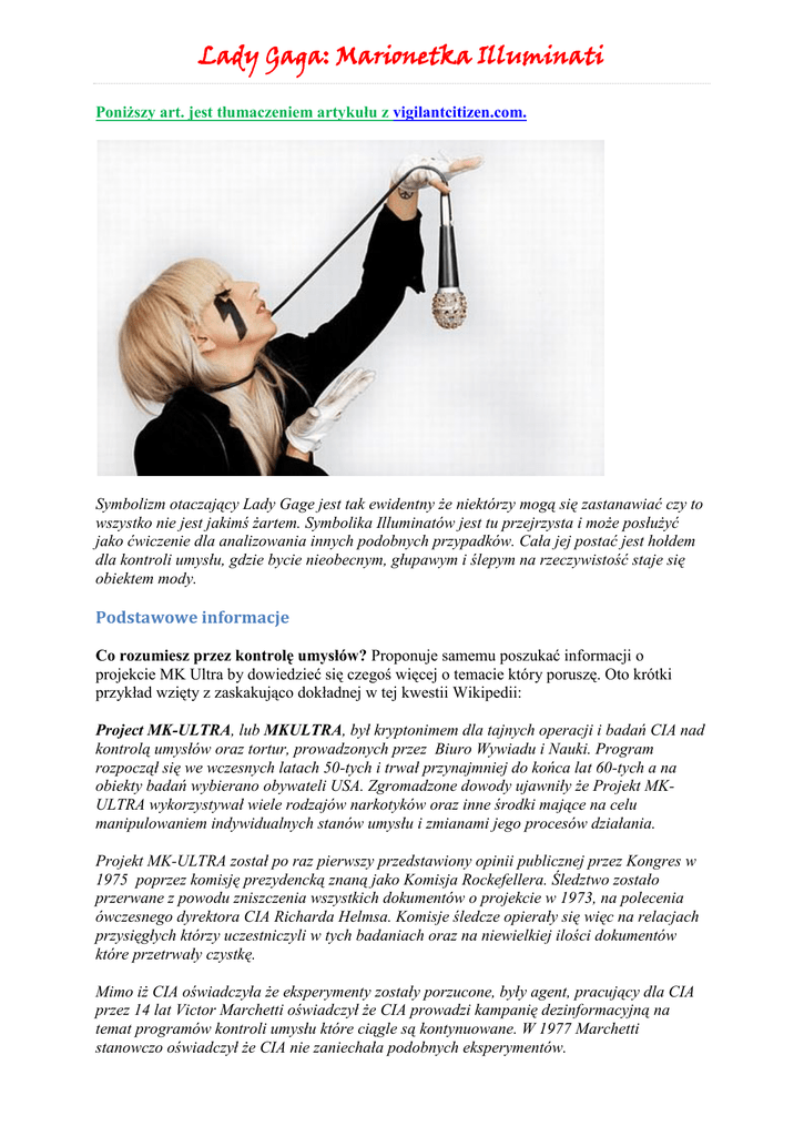 Lady Gaga: Marionetka Illuminati Poniższy art. jest tłumaczeniem artykułu z vigilantcitizen.com. Symbolizm otaczający Lady Gage jest tak ewidentny że niektórzy mogą się zastanawiać czy to wszystko nie jest jakimś żartem. Symbolika Illuminatów jest tu przejrzysta i może posłużyć jako ćwiczenie dla analizowania innych podobnych przypadków. Cała jej postać jest hołdem dla kontroli umysłu, gdzie bycie nieobecnym, głupawym i ślepym na rzeczywistość staje się obiektem mody. Podstawowe informacje Co rozumiesz przez kontrolę umysłów? Proponuje samemu poszukać informacji o projekcie MK Ultra by dowiedzieć się czegoś więcej o temacie który poruszę. Oto krótki przykład wzięty z zaskakująco dokładnej w tej kwestii Wikipedii: Project MK-ULTRA, lub MKULTRA, był kryptonimem dla tajnych operacji i badań CIA nad kontrolą umysłów oraz tortur, prowadzonych przez Biuro Wywiadu i Nauki. Program rozpoczął się we wczesnych latach 50-tych i trwał przynajmniej do końca lat 60-tych a na obiekty badań wybierano obywateli USA. Zgromadzone dowody ujawniły że Projekt MKULTRA wykorzystywał wiele rodzajów narkotyków oraz inne środki mające na celu manipulowaniem indywidualnych stanów umysłu i zmianami jego procesów działania. Projekt MK-ULTRA został po raz pierwszy przedstawiony opinii publicznej przez Kongres w 1975 poprzez komisję prezydencką znaną jako Komisja Rockefellera. Śledztwo zostało przerwane z powodu zniszczenia wszystkich dokumentów o projekcie w 1973, na polecenia ówczesnego dyrektora CIA Richarda Helmsa. Komisje śledcze opierały się więc na relacjach przysięgłych którzy uczestniczyli w tych badaniach oraz na niewielkiej ilości dokumentów które przetrwały czystkę. Mimo iż CIA oświadczyła że eksperymenty zostały porzucone, były agent, pracujący dla CIA przez 14 lat Victor Marchetti oświadczył że CIA prowadzi kampanię dezinformacyjną na temat programów kontroli umysłu które ciągle są kontynuowane. W 1977 Marchetti stanowczo oświadczył że CIA nie zaniechała podobnych eksperymentów. Kontynuacja tego programu nazywana jest nieoficjalnie Projektem Monarch. Jest to technika kontroli która wystawia obiekt na traumę tak bolesną i gwałtowną że jego umysł doznaje swoistego oddzielenia od rzeczywistości. Tak spreparowana psychika otrzymuje nową osobowość, która zostaje następnie nagięta i wyuczona nowych cech przez kontrolerów. Kiedy osoba poddawana jest elektrowstrząsom, odnotowuje się u niej poczucie lekkości głowy; jest to uczucie jakby unoszenia się, latania niczym motyl. Jest tu również element symboliczny, odwołujący się do transformacji i metamorfozy. Od brzydkiej gąsienicy poprzez kokon (nieaktywność, apatia) aż do pięknego motyla, końcowego tworu całego procesu. Podczas procesu reedukacji osoby takie są wystawiane na liczne symbole takie jak: drzewa, pajęczyny, maski, motyle itd. Są im także pokazywane filmy które mają zaimplementować im odpowiednie symbole (triggery), takie jak Czarodziej z Oz czy filmy Disneya. Ten sam proces który dokonuje się podczas prania mózgu i reedukacji, jest stosowany na szeroką skalę przez mass media. Zaczyna się od dzieciństwa i bajek Disneya a kończy na filmach Hollywood i teledyskach muzycznych. OMG! Co te pokręcone historię mają wspólnego z Lady Gagą? Ja ją lofciam!!! Trzeba zaznaczyć że symbolika tych praktyk przeniknęła do mass mediów. Monarcha jest rodzajem motyla i stał się ultymatywnym symbolem praktyk manipulacji i kontroli umysłu. Symbolika wokół Lady Gagi łączy te elementy z okultyzmem oraz tajnymi stowarzyszeniami. Jej sztuczna i lekko zdegenerowana persona zawiera wszystkie cechy ofiar prania mózgu. Zobaczmy co Gaga sobą reprezentuje, zacznijmy od jej imienia. Jej imię Gaga jest w języku angielskim odwołaniem do nieobecności umysłem. (Poniższe cytaty ze słownika pozwoliłem sobie nie tłumaczyć, gdyż jest tam wiele terminów specyficznych dla angielskiego): Afflicted with or exhibiting irrationality and mental unsoundness: brainsick, crazy, daft, demented, disordered, distraught, dotty, insane, lunatic, mad, maniac, mani Given to lighthearted silliness: empty-headed, featherbrained, flighty, frivolous, frothy, giddy, harebrained, lighthearted, scatterbrained, silly. Slang birdbrained, dizzy. acal, mentally ill, moonstruck, off, touched, unbalanced, unsound, wrong. “Gaga” jest prawdopodobnie najłatwiejszym słowem jakie można wypowiedzieć w angielskim. Często jest wymawiane przez dzieci uczące się mówić. Tak więc jej imię mówi nam: jestem kobietą i mam pustą głowę. Tą głowę można wypełnić każdym śmieciem jaki tylko wymyślisz. Bierzcie ze mnie wzór młodzieży. Ten stan umysłu jest osiągany po pomyślnym procesie prania mózgu. Mówi się że jej imię jest też zainspirowane utworem Queen “Radio Gaga”. Klip tego kawałka zawiera sceny z filmu Metropolis (1927). Tak jak opisywałem to w moim artykule o Sasha Fierce/Beyonce, film ten opowiada historię kobiety z klasy robotniczej która wybrana została przez Elitę rządzącą metropolią do przekazania swego życia dla robota, poprzez proces będący mieszaniną nauki z czarną magią. Scena z Metropolis – Maria daję swoją osobowośc dla robota. Czy to metafora kontroli umysłu? Zwróccie uwagę na symbolikę okultystyczną: odwrócony pentagram. Robot ten staje się seksownym i zwodniczym obiektem który ma na celu zepsuć i zwieśc klasę robotniczą. Symbolika tego filmu wydaje się bardzo ważna dla okultystycznych elit. Madonna, Beyonce, Kylie Minogue i wiele innych przejęło sposób poruszania się tego jednego właśnie robota i jak widzicie w teledysku „Paparazzi”, Gaga kontynuuje tą tradycję. Jej Logo Jej logo mówi bardzo dużo. Jest to bezgłowy kobiecy korpus z piorunem przechodzącym wzdłuż ciała i wychodzącym przez genitalia. Po raz kolejny mamy obraz braku świadomości w wi