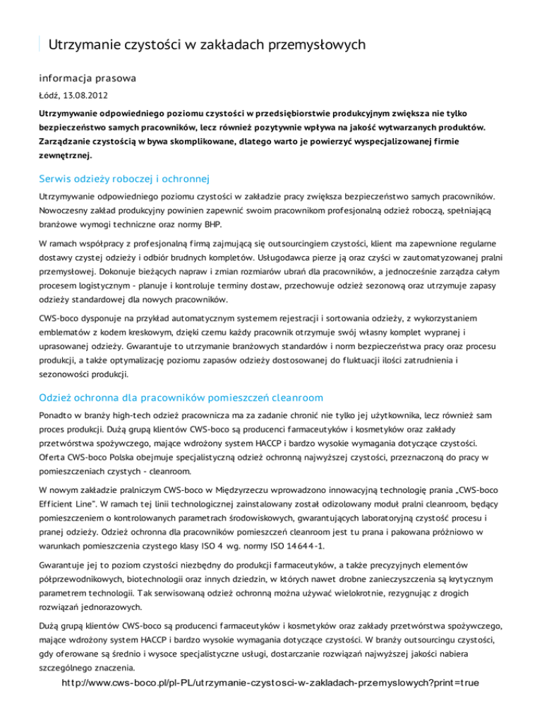Utrzymanie czystości w zakładach przemysłowych informacja prasowa Łódź, 13.08.2012 Utrzymywanie odpowiedniego poziomu czystości w przedsiębiorstwie produkcyjnym zwiększa nie tylko bezpieczeństwo samych pracowników, lecz również pozytywnie wpływa na jakość wytwarzanych produktów. Zarządzanie czystością w bywa skomplikowane, dlatego warto je powierzyć wyspecjalizowanej firmie zewnętrznej. Serwis odzieży roboczej i ochronnej Utrzymywanie odpowiedniego poziomu czystości w zakładzie pracy zwiększa bezpieczeństwo samych pracowników. Nowoczesny zakład produkcyjny powinien zapewnić swoim pracownikom profesjonalną odzież roboczą, spełniającą branżowe wymogi techniczne oraz normy BHP. W ramach współpracy z profesjonalną firmą zajmującą się outsourcingiem czystości, klient ma zapewnione regularne dostawy czystej odzieży i odbiór brudnych kompletów. Usługodawca pierze ją oraz czyści w zautomatyzowanej pralni przemysłowej. Dokonuje bieżących napraw i zmian rozmiarów ubrań dla pracowników, a jednocześnie zarządza całym procesem logistycznym - planuje i kontroluje terminy dostaw, przechowuje odzież sezonową oraz utrzymuje zapasy odzieży standardowej dla nowych pracowników. CWS-boco dysponuje na przykład automatycznym systemem rejestracji i sortowania odzieży, z wykorzystaniem emblematów z kodem kreskowym, dzięki czemu każdy pracownik otrzymuje swój własny komplet wypranej i uprasowanej odzieży. Gwarantuje to utrzymanie branżowych standardów i norm bezpieczeństwa pracy oraz procesu produkcji, a także optymalizację poziomu zapasów odzieży dostosowanej do fluktuacji ilości zatrudnienia i sezonowości produkcji. Odzież ochronna dla pracowników pomieszczeń cleanroom Ponadto w branży high-tech odzież pracownicza ma za zadanie chronić nie tylko jej użytkownika, lecz również sam proces produkcji. Dużą grupą klientów CWS-boco są producenci farmaceutyków i kosmetyków oraz zakłady przetwórstwa spożywczego, mające wdrożony system HACCP i bardzo wysokie wymagania dotyczące czystości. Oferta CWS-boco Polska obejmuje specjalistyczną odzież ochronną najwyższej czystości, przeznaczoną do pracy w pomieszczeniach czystych - cleanroom. W nowym zakładzie pralniczym CWS-boco w Międzyrzeczu wprowadzono innowacyjną technologię prania „CWS-boco Efficient Line”. W ramach tej linii technologicznej zainstalowany został odizolowany moduł pralni cleanroom, będący pomieszczeniem o kontrolowanych parametrach środowiskowych, gwarantujących laboratoryjną czystość procesu i pranej odzieży. Odzież ochronna dla pracowników pomieszczeń cleanroom jest tu prana i pakowana próżniowo w warunkach pomieszczenia czystego klasy ISO 4 wg. normy ISO 14 64 4 -1. Gwarantuje jej to poziom czystości niezbędny do produkcji farmaceutyków, a także precyzyjnych elementów półprzewodnikowych, biotechnologii oraz innych dziedzin, w których nawet drobne zanieczyszczenia są krytycznym parametrem technologii. Tak serwisowaną odzież ochronną można używać wielokrotnie, rezygnując z drogich rozwiązań jednorazowych. Dużą grupą klientów CWS-boco są producenci farmaceutyków i kosmetyków oraz zakłady przetwórstwa spożywczego, mające wdrożony system HACCP i bardzo wysokie wymagania dotyczące czystości. W branży outsourcingu czystości, gdy oferowane są średnio i wysoce specjalistyczne usługi, dostarczanie rozwiązań najwyższej jakości nabiera szczególnego znaczenia. ht t p://www.cws-boco.pl/pl-PL/ut rzymanie-czyst osci-w-zakladach-przemyslowych?print =t rue Higena osobista pracowników Zapewnienie pracownikom odpowiedniej odzieży roboczej to nie jedyny obowiązek pracodawcy. Kolejnym elementem zwiększającym ich komfort oraz bezpieczeństwo w pracy jest odpowiednio wyposażona toaleta. W takiej toalecie powinny znaleźć się: podajnik mydła w płynie lub w pianie, podajnik ręczników papierowych lub ręcznika bawełnianego, odświeżacz powietrza oraz podajnik papieru toaletowego. Dodatkowo należy zadbać o regularny serwis zamontowanych sprzętów oraz uzupełnianie ich o materiały eksploatacyjne. Firmy oferujące usługę outsourcingu czystości wychodzą swoim klientom naprzeciw i oferują kompleksowe rozwiązania, zapewniając nie tylko wyposażenie toalety, ale również regularny serwis urządzeń oraz uzupełnianie dozowników w mydło czy podajniki w ręczniki papierowe. Jak widać na przedstawionych przykładach, utrzymywanie odpowiedniego poziomu czystości nie tylko pozwala zachować jakość produkcji, lecz również zwiększa bezpieczeństwo pracowników i ma korzystny wpływ na warunki pracy. Co ważne, o czystość w zakładzie pracy należy dbać na każdym etapie produkcji. Więcej informacji o ofercie utrzymania czystości w zakładach przemysłowych jest dostępne na stronach: www.cwsboco.pl (http://www.cws-boco.pl) Kontakt dla mediów Ewa Nowak CWS-boco Polska Sp. z o.o. ul. Rokicińska 156 b 92-4 12 Łódź T el: +4 8 4 26839710 (tel:4 84 26839710) Fax: +4 8 4 2683974 7 Magdalena Pawlak Agencja PR Fleishman-Hillard Warszawa T el: +4 8605227229 (tel:4 8605227229) Fax: +4 8226630091 Media Możesz znaleźć zdjęcia do innych tematów w naszej bazie zdjęć. Zobacz wszystkie zdjęcia prasowe (/pl-PL/baza-zdjec) ht t p://www.cws-boco.pl/pl-PL/ut rzymanie-czyst osci-w-zakladach-przemyslowych?print =t rue