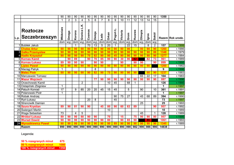 90 1 17 1 9 85 Grom dom 5 90 90 90 85 90 90 dom 20 90 90 90 90 wyj. 1 90 90 45 90 90 dom wyj. 22 90 90 90 90 90 90 30 90 90 90 90 90 90 75 90 77 90 90 10 90 45 20 20 45 15 45 20 8 90 90 90 90 68 90 12 90 13 dom wyj. 15 90 90 90 90 90 82 90 90 90 90 90 90 1 65 90 5 90 45 90 45 75 27 90 60 63 90 14 dom 8 90 90 90 82 wyj. 2 90 88 90 73 90 90 90 22 90 68 25 89 90 81 90 90 73 89 90 90 90 90 90 990 990 4 90 90 86 990 5 88 90 90 990 90 90 90 990 675 1080 1350 45 80 10 90 15 Sokół 90 11 Olimpia 90 10 Huczwa 90 9 Igros wyj. 13 90 90 82 70 90 90 8 90 82 90 8 Victoria Ostoja wyj. dom 70 90 90 90 90 90 70 90 90 90 90 90 7 Łada 90 6 Cosmos Korona 90 5 2 Legenda: 50 % rozegranych minut 80 % rozegranych minut 100 % rozegranych minut Granica L.K. Omega dom wyj. dom 1 90 90 90 90 90 90 90 90 90 90 89 89 90 90 90 90 90 1 90 90 90 90 4 Pogoń Ł. Bubiłek Jakub Chałas Artur Gałka Przemysław Hadło Krzysztof Kornas Kamil Kornas Łukasz Lipiec Paweł Maciąg Patryk Malec Piotr Marczewski Tomasz Mazur Wojciech Orzechowski Kamil Ostapiński Zbigniew Paluch Konrad Polanowski Piotr Robak Andrzej Ryń Łukasz Strenciwilk Damian Szura Krystian Świergoń Martin Waga Sebastian Wróbel Łukasz Wurszt Dawid Wyrostkiewicz Paweł Razem 90 3 Orkan 1 2 3 4 5 6 7 8 9 10 11 12 13 14 15 16 17 18 19 20 21 22 23 24 90 2 Włókniarz L.p. Roztocze Szczebrzeszyn 90 1 89 45 90 70 15 75 90 90 90 90 80 90 85 90 86 90 90 90 89 90 90 90 90 90 990 990 990 990 990 990 982 990 986 1350 Razem Rok urodz. 157 1260 1348 1277 961 899 1260 9 90 1237 17 104 90 887 126 1 10 361 1 89 394 73 25 90 957 10 1 128 80 957 1061 90 1345 990 14838 r.1999 r.1986 r.1979 r.1984 r.1989 r.1995 r.1982 r.1996 r.1983 r.1983 r.1996 r.1995 r.1997 r.1991 r.1997 r.1990 r.1997 r.1993 r.1992 r.1989 r.1989 r.1995 r.1993 r.1989 grał we wszystkich meczach Czerwona kartka pauza po żółtych lub czerwonych kartkach Młodzieżowiec Junior