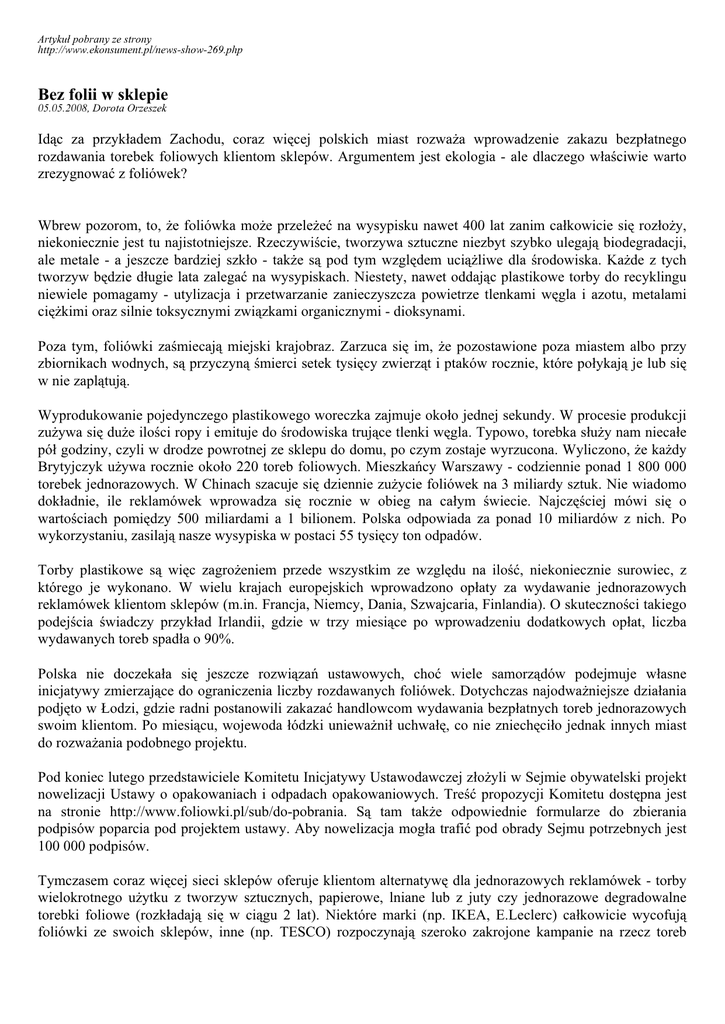 Artykuł pobrany ze strony http://www.ekonsument.pl/news-show-269.php Bez folii w sklepie 05.05.2008, Dorota Orzeszek Idąc za przykładem Zachodu, coraz więcej polskich miast rozważa wprowadzenie zakazu bezpłatnego rozdawania torebek foliowych klientom sklepów. Argumentem jest ekologia - ale dlaczego właściwie warto zrezygnować z foliówek? Wbrew pozorom, to, że foliówka może przeleżeć na wysypisku nawet 400 lat zanim całkowicie się rozłoży, niekoniecznie jest tu najistotniejsze. Rzeczywiście, tworzywa sztuczne niezbyt szybko ulegają biodegradacji, ale metale - a jeszcze bardziej szkło - także są pod tym względem uciążliwe dla środowiska. Każde z tych tworzyw będzie długie lata zalegać na wysypiskach. Niestety, nawet oddając plastikowe torby do recyklingu niewiele pomagamy - utylizacja i przetwarzanie zanieczyszcza powietrze tlenkami węgla i azotu, metalami ciężkimi oraz silnie toksycznymi związkami organicznymi - dioksynami. Poza tym, foliówki zaśmiecają miejski krajobraz. Zarzuca się im, że pozostawione poza miastem albo przy zbiornikach wodnych, są przyczyną śmierci setek tysięcy zwierząt i ptaków rocznie, które połykają je lub się w nie zaplątują. Wyprodukowanie pojedynczego plastikowego woreczka zajmuje około jednej sekundy. W procesie produkcji zużywa się duże ilości ropy i emituje do środowiska trujące tlenki węgla. Typowo, torebka służy nam niecałe pół godziny, czyli w drodze powrotnej ze sklepu do domu, po czym zostaje wyrzucona. Wyliczono, że każdy Brytyjczyk używa rocznie około 220 toreb foliowych. Mieszkańcy Warszawy - codziennie ponad 1 800 000 torebek jednorazowych. W Chinach szacuje się dziennie zużycie foliówek na 3 miliardy sztuk. Nie wiadomo dokładnie, ile reklamówek wprowadza się rocznie w obieg na całym świecie. Najczęściej mówi się o wartościach pomiędzy 500 miliardami a 1 bilionem. Polska odpowiada za ponad 10 miliardów z nich. Po wykorzystaniu, zasilają nasze wysypiska w postaci 55 tysięcy ton odpadów. Torby plastikowe są więc zagrożeniem przede wszystkim ze względu na ilość, niekoniecznie surowiec, z którego je wykonano. W wielu krajach europejskich wprowadzono opłaty za wydawanie jednorazowych reklamówek klientom sklepów (m.in. Francja, Niemcy, Dania, Szwajcaria, Finlandia). O skuteczności takiego podejścia świadczy przykład Irlandii, gdzie w trzy miesiące po wprowadzeniu dodatkowych opłat, liczba wydawanych toreb spadła o 90%. Polska nie doczekała się jeszcze rozwiązań ustawowych, choć wiele samorządów podejmuje własne inicjatywy zmierzające do ograniczenia liczby rozdawanych foliówek. Dotychczas najodważniejsze działania podjęto w Łodzi, gdzie radni postanowili zakazać handlowcom wydawania bezpłatnych toreb jednorazowych swoim klientom. Po miesiącu, wojewoda łódzki unieważnił uchwałę, co nie zniechęciło jednak innych miast do rozważania podobnego projektu. Pod koniec lutego przedstawiciele Komitetu Inicjatywy Ustawodawczej złożyli w Sejmie obywatelski projekt nowelizacji Ustawy o opakowaniach i odpadach opakowaniowych. Treść propozycji Komitetu dostępna jest na stronie http://www.foliowki.pl/sub/do-pobrania. Są tam także odpowiednie formularze do zbierania podpisów poparcia pod projektem ustawy. Aby nowelizacja mogła trafić pod obrady Sejmu potrzebnych jest 100 000 podpisów. Tymczasem coraz więcej sieci sklepów oferuje klientom alternatywę dla jednorazowych reklamówek - torby wielokrotnego użytku z tworzyw sztucznych, papierowe, lniane lub z juty czy jednorazowe degradowalne torebki foliowe (rozkładają się w ciągu 2 lat). Niektóre marki (np. IKEA, E.Leclerc) całkowicie wycofują foliówki ze swoich sklepów, inne (np. TESCO) rozpoczynają szeroko zakrojone kampanie na rzecz toreb wielokrotnego użytku. Obecnie prawie w każdym super- i hipermarkecie można kupić torbę ekologiczną. Jednak w większości mniejszych sklepów, niepodzielnie królują “jednorazówki" - zresztą, z marketów także nie zniknęły: okazjonalnie towarzyszą im apele “Oszczędzaj reklamówki" umieszczone na boku kasy. Sieci, które dotychczas pakowały towar do foliówek za klienta (np. Auchan), nie zrezygnowały z tej praktyki. Propozycje ustawowego ograniczenia dostępu do bezpłatnych toreb plastikowych z reguły spotykają się z aprobatą ekologów. Kontrowersyjne jest natomiast pytanie: czym je zastąpić? Praktykowane w niektórych krajach na szeroką skalę jednorazowe torebki papierowe (np. USA) mają równie wielu zwolenników, co przeciwników. Z jednej strony, ich utylizacja czy ewentualny recykling nie jest szczególnie kłopotliwy a nawet jeśli opakowanie znajdzie się na wysypisku, to rozłoży się w przeciągu kilku miesięcy. Torebki papierowe nie mogą całkowicie wyeliminować foliowych (do pakowania produktów mokrych, np. ryb, mięsa, kiszonek), ale w większości zastosowań spełniają swoją rolę. Skąd więc wątpliwości? Okazuje się, że produkcja torby papierowej jest znacznie bardziej uciążliwa dla środowiska niż w przypadku zwykłej reklamówki. Wyprodukowanie papierowego opakowania zużywa cztery razy więcej energii, powoduje większe zanieczyszczenie powietrza oraz 50-krotnie bardziej zanieczyszcza wodę. I przede wszystkim wymaga wycinki drzew. Przykładowo: w 1999 roku w Stanach Zjednoczonych produkcja 10 miliardów wykorzystanych w trakcie tego roku toreb papierowych pochłonęła 14 milionów drzew. Dodatkową wadą opakowań z papieru w stosunku do plastikowych jest ich cena. Za pojedynczą torbę papierową zapłacimy kilkadziesiąt groszy, podczas gdy jedna foliówka kosztuje ułamki groszy. Torby wielokrotnego użytku są jeszcze droższe, kosztują zwykle kilka złotych, ale mogą nam służyć nawet kilka lat zanim się zniszczą. Takie torby są najlepszym wyjściem dla troszczącego się o środowisko konsumenta a gdy ze sklepów w końcu znikną darmowe reklamówki, okażą si