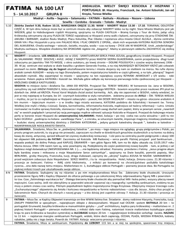 FATIMA NA 100 LAT 5 - 14.10.2017 GRUPA II ANDALUZJA. WIELCY ŚWIĘCI KOSCIOŁA Z HISZPANII I PORTUGALII. Bł. Hiacynta, Franciszek, św. Antoni lizboński, Jan od Krzyża, Teresa Wielka Madryt – Avilla – Segovia – Salamanka – FATIMA – Bathala – Alcobasa – Nazare – Lizbona Sewilla – Cordoba - Granada – Toledo - Madryt 5.10 6 7 8N 9 Zbiórka Zwoleń 9.30, Radom 10.15, WARSZAWA OKĘCIE 11.30. WAW – MADRYT Wylot 13.30 - 17.10. TERMINAL ODLOTÓW CZĘŚĆ A. W tym dniu kolacja może być w centrum miasta aby zobaczyć MADRYT lekko na by night. Stare Miasto Madrytu jest jak WIEDEŃ, gdyż to Habsburgowie rządzili Hiszpanią; spojrzymy na PLAZA CASTILLIA – Bramę Europy z Tour de Kioto, jadąc ulicą Królewską zatrzymamy się przy PLAZA DE TOROZ największej w Hiszpanii areny walk z bykami, zatrzymamy się przy STADIONIE ŚW. JAKUBA I BARNABY, stadion Realu Madryt, Placu Kolumba, Plac Cibeles i najstarsza ulica miasta CALLE ALCALA , słynna centralna GRAN VIA i Plac Hiszpański a przy nim PALACIO REAL I PLAC ORIENTE Z OPERĄ , obok nich wspaniała KATEDRA NUESTRA SENIORA DEL ALMUDENA. Chwila wolnego – wieczór, światło, muzyka, woda – czas na kawę – ŻYCIE JAK W MADRYCIE. Urok „wiedeńskiego” Madrytu zachwyca. Wszędzie chodzimy NA SPOKOJNIE nigdzie nie „biegamy”. Mamy w pierwszym oddechu ZACHWYCIĆ się stolicą Hiszpanii. MADRYT – śniadanie. LOS ANGELES (ale nie w USA) - SANKTUARIUM SERCA PANA JEZUSA, geograficzny środek Hiszpanii. Przejazd do SALAMANKI PRZEZ SEGOVIĘ i AVILE. JADĄC Z MADRYTU przez MASYW SIERRA GUADERAMA, zanim przejedziemy długi tunel zobaczymy po japońsku TAK-TO-WIDZĘ z okna autokaru, po lewej stronie – DOLINE POLEGŁYCH z czasów wojny domowej 1936 39. W jej centrum stoi wykuta w skale bazylika z grobem Generała Franko, a na niej NAJWIĘKSZY BETONOWY KRZYŻ jaki człowiek postawił na ziemi. Zbliżając się do Segovii ukształtowanie terenu i miasta skojarzy się nam ze statkiem na morzu. Na rufie słynny arabski zamek ALKAZAR – wzięty na logo Disneylandu, potem majestatyczna katedra w części głównej, a na tyle „płynącej” Segovii akwedukt rzymski. Aby zapamiętać to miasto – spojrzymy na ten największy czynny RZYMSKI AKWEDUKT z I/II wieku - robi wrażenie. Potem piękna KATEDRA i Kościół św. Michała gdzie odbyła się koronacja pierwszego króla zjednoczonej już Hiszpanii – KRÓLOWEJ IZABELII KASTYLIJSKIEJ. SEGOVIA to miejsce życia i działania Św. JANA OD KRZYŻA. Przyjaciel Św. TERESY WIELKIEJ. W konwencie św. Jana w SEGOWI, zamyślimy się nad JANEM PAWŁEM II, który odwiedzał w Segovii swojego MISTRZA - bowiem wszystkie prace naukowe JPII pisał na dziełach św. JANA od KRZYŻA. Ponoć Karol Wojtyła chciał zostać karmelitą. Ach, aby nie zapomnieć o SEGOVI, należy wiedzieć, że jest w niej najwięcej w Europie, bo 14 - czynnych kościołów w stylu romańskim. Jedziemy jeszcze do AVILLI – ŚW. TERESA WIELKA – myślisz, że już to co najładniejsze w Hiszpanii zobaczyłeś – powoli, NA DESER WIZUALNY – miasto na górze- otoczone arabskim 4 km murem – bajecznym murem – a w środku tego miasta warowna, KATEDRA podobna do lizbońskiej i konwent św. Teresy Wielkiej (nie mylić z Małą z Lisieux). Święta, karmelitanka, reformatorka Kościoła, mądrzejsza od twórcy reformacji – Lutra. Umiała rozmawiać na trudne sprawy Kościoła, stanowcza i mądra. Jej mądrych uwag słuchał sam papież, który w pewnym sensie „nawrócił się” w swoich poglądach i przyznał jej rację pomagając mądrze odnowić sytuacje Kościoła w Hiszpanii. Przejazd do kolejnego miasta perły w koronie miast Hiszpanii do uniwersyteckiej SALAMANKI. Hotel, kolacja – po niej czeka nas uczta wizualna – jeśli tu nie byłeś OCZEKUJ „padnięcia na kolana uwielbiając Pana ”, o zmroku, w sztucznym świetle, imponuje magiczny miodowy piaskowiec – budulec starej uniwersyteckiej dzielnicy z DWOMA KATEDRAMI „ jedyny gotycki katedralny dwupak ”, katedra w katedrze – NAJWSPANIALSZE NOCĄ MIASTO ŚWIATA. SALAMANKA . Śniadanie, Msza Św. w „podwójnej Katedrze ”, po mszy – tego miejsce nie oglądają grupy pielgrzymów z Polski, po prostu program autorski, tu się grup nie prowadzi, zapraszam na chwile w dziedzińcach gmachów studenckich a na koniec na dobrą kawę do starej, antycznej, sprzed kilkuset lat czynnej studenckiej restauracji. I cóż pora na centralny punkt pielgrzymki z okazji 100 lat objawień MB jedziemy do FATIMY. Zaczniemy od Kościoła MB Radosnej – serca parafii. Później przyjazd pod Sanktuarium , wypada podejść do doliny Pokoju pod KAPLICĘ OBJAWIEŃ – tam gdzie figura MB, tam na tle dębu ukazała się 13.05.1917 roku Mama Jezusa. ONA I ON razem tam są, wiec powitajmy się. Podejdziemy do części podziemnej nowej bazyliki - tam, w jednej z sal będziesz mógł doświadczyć (NIESPODZIANKA NR. 1 )…….nie będziemy zdradzać. Poznamy przesłanie z Fatimy „Jezus pragnie abym była bardziej znana i miłowana a moje Niepokalane Serce zatriumfuje”.. spojrzymy na Dwie bazyliki, pomniki papieży, Mur BERLINSKI, groby Hiacynty, Franciszka, Łucji, droga ślubowań, zajrzymy do „ukrytej” kaplica JEZUSA W NAJŚW. SAKRAMENCIE przed wejściem zobaczysz duże Niepokalane SERCE MARYJI…i tu ta niespodzianka. Hotel, kolacja. Zmiana czasu. 21.30 różaniec i procesja ze świecami. Fatima – IMIĘ córki Mahometa, z miłości po konwersji na chrześcijaństwo poślubiła katolickiego rycerza….ona dała nazwę temu miejscu. Małżeństwo nr. 1, kształtujące oblicze Portugalii – poznamy jeszcze dwa. Bo Portugalia na pięknej miłości trzech par ukształtowała swoje oblicze. FATIMA. Śniadanie. Szykujemy się na różaniec a po nim międzynarodowa Msza Św. Zabieramy białe chusteczki. Uroczyste przeniesienie figury MB z Kaplicy Objawień do ołtarza polowego a po zakończonej Mszy odprowadzamy Figurę MB z powrotem – to tzw. Czas „fatims