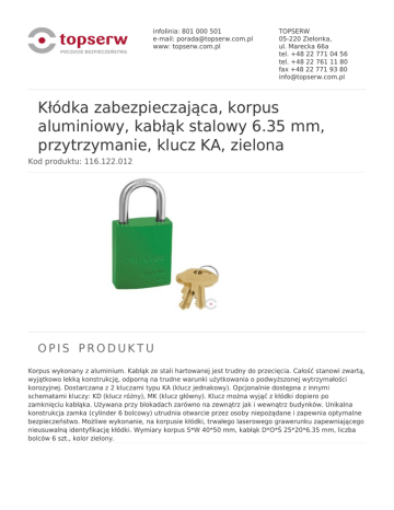 infolinia: 801 000 501 e-mail: [email protected] www: topserw.com.pl TOPSERW 05-220 Zielonka, ul. Marecka 66a tel. +48 22 771 04 56 tel. +48 22 761 11 80 fax +48 22 771 93 80 [email protected] Kłódka zabezpieczająca, korpus aluminiowy, kabłąk stalowy 6.35 mm, przytrzymanie, klucz KA, zielona Kod produktu: 116.122.012 OPIS PRODUKTU Korpus wykonany z aluminium. Kabłąk ze stali hartowanej jest trudny do przecięcia. Całość stanowi zwartą, wyjątkowo lekką konstrukcję, odporną na trudne warunki użytkowania o podwyższonej wytrzymałości korozyjnej. Dostarczana z 2 kluczami typu KA (klucz jednakowy). Opcjonalnie dostępna z innymi schematami kluczy: KD (klucz różny), MK (klucz główny). Klucz można wyjąć z kłódki dopiero po zamknięciu kabłąka. Używana przy blokadach zarówno na zewnątrz jak i wewnątrz budynków. Unikalna konstrukcja zamka (cylinder 6 bolcowy) utrudnia otwarcie przez osoby niepożądane i zapewnia optymalne bezpieczeństwo. Możliwe wykonanie, na korpusie kłódki, trwałego laserowego grawerunku zapewniającego nieusuwalną identyfikację kłódki. Wymiary korpus S*W 40*50 mm, kabłąk D*O*Ś 25*20*6.35 mm, liczba bolców 6 szt., kolor zielony. DANE TECHNICZNE Rodzaj klucza KA - klucz jednakowy Ilość kluczy 2 Korpus Kompozytowy Kabłąk Stal hartowana Przytrzymanie klucza Tak Szerokość korpusu 40 mm Wysokość korpusu 50 mm Długość kabłąka 25 mm Odstęp kabłąka 20 mm Średnica kabłąka 6,35 mm Liczba bolców 6 Kolor Zielony AKCESORIA Uchwyt (wieszak) pomocniczy do kłódek zabezpieczających, 12 szt. 116.129.101 Tablica ścienna na blokady, kłódki (20), zawieszki S*D*G 558*558*44 mm 116.116.380 Tablica ścienna na blokady, kłódki (10), zawieszki S*D*G 558*393*44 mm, 116.116.370 Tablica ścienna (Ex) na blokady, kłódki (4), zawieszki S*D*G 406*311*44 mm 116.116.360 Wieszak/tablica ścienna na kłódki bezpieczeństwa 18-22 szt. 116.116.301 Wieszak/tablica ścienna na kłódki bezpieczeństwa 6-8 szt. 116.116.300 Skrzynka przenośna do przechowywania blokad, kłódek S*D*G 420*230*216 mm 116.116.620 Skrzynka zabezpieczająca klucze kłódek bezpieczeństwa, dwufunkcyjna - przenośna, ścienna, żółta 116.116.102 Skrzynka zabezpieczająca klucze kłódek bezpieczeństwa, dwufunkcyjna - przenośna, ścienna, czerwona 116.116.101 Skrzynka zabezpieczająca klucze kłódek bezpieczeństwa, przenośna 116.116.100 CERTYFIKATY POWIĄZANE Produkt Kłódka zabezpieczająca, korpus aluminiowy, kabłąk stalowy 6.35 mm, przytrzymanie, klucz KA, czarna Kłódka zabezpieczająca, korpus aluminiowy, kabłąk stalowy 6.35 mm, przytrzymanie, klucz KA, niebieska Kłódka zabezpieczająca, korpus aluminiowy, kabłąk stalowy 6.35 mm, przytrzymanie, klucz KA, zielona Kłódka zabezpieczająca, korpus aluminiowy, kabłąk stalowy 6.35 mm, przytrzymanie, klucz KA, pomarańczowa Kłódka zabezpieczająca, korpus aluminiowy, kabłąk stalowy 6.35 mm, przytrzymanie, klucz KA, czerwona Kłódka zabezpieczająca, korpus aluminiowy, kabłąk stalowy 6.35 mm, przytrzymanie, klucz KA, żółta