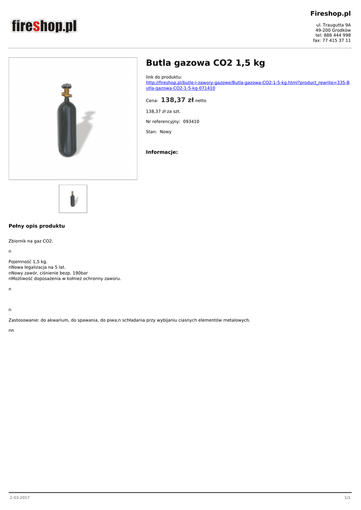 Fireshop.pl ul. Traugutta 9A 49-200 Grodków tel: 888 444 998 fax: 77 415 37 11 Butla gazowa CO2 1,5 kg link do produktu: http://fireshop.pl/butle-i-zawory-gazowe/Butla-gazowa-CO2-1-5-kg.html?product_rewrite=335-B utla-gazowa-CO2-1-5-kg-071410 Cena: 138,37 zł netto 138,37 zł za szt. Nr referencyjny: 093410 Stan: Nowy Informacje: Pełny opis produktu Zbiornik na gaz CO2. n Pojemność 1,5 kg. nNowa legalizacja na 5 lat. nNowy zawór, ciśnienie bezp. 190bar nMożliwość doposażenia w kołnież ochronny zaworu. n n Zastosowanie: do akwarium, do spawania, do piwa,n schładania przy wybijaniu ciasnych elementów metalowych. nn 2-03-2017 1/1