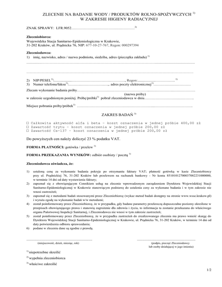 ZLECENIE NA BADANIE WODY / PRODUKTÓW ROLNO-SPOŻYWCZYCH 1) W ZAKRESIE HIGIENY RADIACYJNEJ ZNAK SPRAWY: LFR.9052……………………………………………2) Zleceniobiorca: Wojewódzka Stacja Sanitarno-Epidemiologiczna w Krakowie, 31-202 Kraków, ul. Prądnicka 76, NIP: 677-10-27-767, Regon: 000297394 Zleceniodawca: 1) imię, nazwisko, adres / nazwa podmiotu, siedziba, adres (pieczątka zakładu) 1) ....................……………………………….……………………………………………………………………..................................................... …………………………………………………………………………………………………………………………………………………… 2) NIP/PESEL1):...................………………………….…………, Regon:...................……………. 1) 3) Numer telefonu/faksu1):……….……………….…,. adres poczty elektronicznej1)………………………… Zlecam wykonanie badania próby…………………………………………………..……………….……………… (nazwa próby) w zakresie uzgodnionym poniżej. Próbę/próbki1) pobrał zleceniodawca w dniu…………………………………. Miejsce pobrania próby/próbek1) ……………………………………………………...…………………………. ZAKRES BADAŃ 3) □ Całkowita aktywność alfa i beta – koszt oznaczenia w jednej próbie 400,00 zł □ Zawartość trytu – koszt oznaczenia w jednej próbie 200,00 zł □ Zawartość Cs-137 – koszt oznaczenia w jednej próbie 200,00 zł Do powyższych cen należy doliczyć 23 % podatku VAT. FORMA PŁATNOŚCI: gotówka / przelew 1) FORMA PRZEKAZANIA WYNIKÓW: odbiór osobisty / pocztą 1) Zleceniodawca oświadcza, że: 1) 2) 3) 4) 5) 6) ustaloną cenę za wykonanie badania pokryje po otrzymaniu faktury VAT; płatność gotówką w kasie Zleceniobiorcy przy ul. Prądnickiej 76, 31-202 Kraków lub przelewem na rachunek bankowy - Nr konta 85101012700037082231000000, w terminie 14 dni od daty wystawienia faktury; zapoznał się z obowiązującym Cennikiem usług na zlecenie wprowadzonym zarządzeniem Dyrektora Wojewódzkiej Stacji Sanitarno-Epidemiologicznej w Krakowie stanowiącym podstawę do ustalenia ceny za wykonane badania i w tym zakresie nie wnosi zastrzeżeń; zapoznał się z metodami badań stosowanymi przez Zleceniobiorcę (wykaz metod badań dostępny na stronie www.wsse.krakow.pl) i wyraża zgodę na wykonanie badań w/w metodami; został poinformowany przez Zleceniobiorcę, że w przypadku, gdy badane parametry przekroczą dopuszczalne poziomy określone w przepisach obowiązującego prawa i stanowią zagrożenie dla zdrowia i życia, to informacja ta zostanie przekazana do właściwego organu Państwowej Inspekcji Sanitarnej, i Zleceniodawca nie wnosi w tym zakresie zastrzeżeń; został poinformowany przez Zleceniobiorcę, że w przypadku zastrzeżeń do zrealizowanego zlecenia ma prawo wnieść skargę do Dyrektora Wojewódzkiej Stacji Sanitarno-Epidemiologicznej w Krakowie, ul. Prądnicka 76, 31-202 Kraków, w terminie 14 dni od daty potwierdzenia odbioru sprawozdania; podane w zleceniu dane są zgodne z prawdą. ……………………………………………………………………… (miejscowość, dzień, miesiąc, rok) 1) niepotrzebne skreślić 2) wypełnia zleceniobiorca 3) właściwe zakreślić ……………………………………………………………… (podpis, pieczęć Zleceniodawcy lub osoby działającej w jego imieniu) 1/2 2) Kod(-y) próbki (-ek): ….…..…………………………………….…… ………………………………………………… ………………………………………………… ………………………………………………… (data i podpis osoby przyjmującej próbkę) 1) Przewidywany termin realizacji zlecenia ………………….……..………. 2) Uwagi: 3) Uzgodnienia z klientem w trakcie realizacji zlecenia: 2) wypełnia zleceniobiorca 2/2