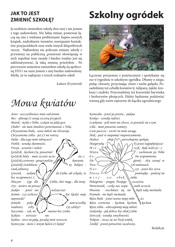 Szkolny ogródek Jak to jest zmienić szkołę? Ja osobiście zmieniłem szkołę dwa razy i nie jestem z tego zadowolony. Nie lubię zmian, ponieważ łączą się one z wieloma problemami: kupno nowych książek, nadrabianie tematów, nawiązanie kontaktów przyjacielskich oraz wiele innych kłopotliwych rzeczy. Najbardziej nie polecam zmiany szkoły z prywatnej na publiczną ,ponieważ obowiązują w nich zupełnie inne zasady i bardzo trudno jest się zaklimatyzować, Ja taką zmianę przeżyłem . Po pierwszym semestrze zmieniłem szkołę na społeczną STO i na razie jestem z niej bardzo zadowolony. Myślę ,że to najlepszy z trzech rodzajów szkół. Łukasz Krystowski Mowa kwiatów Aster - uszczęśliwiasz mnie codziennie. Bez - ofiaruję Ci swoją szczerą przyjaźń. Bratek - myślę o Tobie, czekam na jakiś gest. Chaber - nie mam śmiałości porozmawiać z Tobą. Chryzantema białą - stara miłość nie rdzewieje. Chryzantema żółta - już Ci nie wierzę. Dalia - dlaczego mnie odtrącasz? Fiołek - oznaka skromności. Frezja - uznanie i radość. Goździk - kocham Cię, poważnie! Goździk biały - mam szczere uczucia :). Goździk czerwony - gorące podziękowania. Goździki (wielobarwny bukiet) znak odmowy. Groszek - tęsknię do Ciebie, ale szkoda, że bez wzajemności :(. Hiacynt - żyję dla Ciebie, choć mogę... dla innej. Irys - uwierz mi proszę! Jaskier - jesteś niewdzięczna! Jaśmin - czy zechcesz być kiedyś moja naprawdę? Jemioła - pokonam wszelkie trudności, żeby Cię zdobyć! Kaczeniec - tak mi smutno bez Ciebie. Kaktus - ostrzeżenie. Kalina - serce mi pęka, pocałuj mnie wreszcie. Koniczyna - może z innym będzie Ci lepiej? 8 Łączymy przyjemne z pożytecznym i spotykamy się raz w tygodniu w szkolnym ogródku. Dbamy o niego, pieląc chwasty, przycinając chore i suche gałązki, Posadziliśmy też cebulki kwiatów tj. tulipany, żąkile, krokusy i szafirki. Przycinaliśmy też krzewinki barwinka i berberysów płożących. Efekty będziemy podziwiać wiosną gdy znów zajrzymy do kącika ogrodniczego Konwalia - jesteś po prostu... piękna. Krokus - oznaka radości. Lewkonia - jeśli mnie nie chcesz, to powiedz mi o tym. Lilia - mam poważne zamiary. Lwie paszcze - zwróć na mnie uwagę. Mak - puść w niepamięć nieporozumienia. Malwa - oboje potrzebujemy spokoju. Margerytka Ty jesteś najpiękniejsza! Mieczyk - będę walczyć :-). Mięta - zachowam po Tobie dobre wspomnienia. Nagietek - chcę zasnąć w Twoich ramionach. Narcyz - jesteś bez serca. Niezapominajka - podaruj mi m i e j - sce obok siebie. Pelargonia - pragnę Twojego szczęścia. Pierwiosnek - czeka nas wspaniałe uczucie. Piwonia - rozchmurz się, nie bądź taka nieśmiała. Prymula - nie bądź nieśmiała. Róża biała - jesteś warta mojej miło- ści. Róża czerwona - kocham, kocham, kocham. Róża żółta - odwzajemnij moją miłość. Stokrotka - jak dobrze być obok Ciebie. Storczyk - oznaka zmysłowości. Tulipan - cieszę się na Twój widok. Żonkil - jestem potwornie zazdrosny. Redakcja