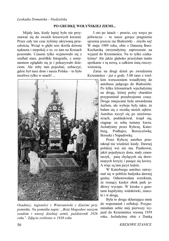 Leokadia Domańska - Niedzielska PO GRUDKĘ WOŁYŃSKIEJ ZIEMI... Mijały lata, kiedy lepiej było nie przyznawać się do swoich kresowych korzeni. Przez cały ten czas żyliśmy ukrywaną przeszłością. Wciąż w głębi serc tkwiła dziwna tęsknota i niepokój o to, co tam na Kresach pozostało. Czasem tylko wyjmowało się z szuflad stare, pożółkłe fotografie, z sentymentem oglądało się je i pokazywało dzieciom. Ale żeby tam pojechać, zobaczyć, gdzie był nasz dom i nasza Polska – to było możliwe tylko w snach! ... I oto po latach – prawie, czy wręcz po półwieczu – to nasze gorące pragnienie ujrzenia jeszcze raz Białozórki – ziściło się! W maju 1989 roku, obie z Danusią BurzKucharską otrzymałyśmy zaproszenie na wyjazd do Krzemieńca. Na to tylko czekałyśmy! Ale jakże głęboko przeżyłam tamto spotkanie z tą nową, a całkiem inną rzeczywistością. Zaraz na drugi dzień po zwiedzeniu Krzemieńca - już o godz. 5.00 rano z wielkim wzruszeniem wsiadłyśmy do autobusu jadącego do Białozórki. Po kilku kilometrach wjechałyśmy na drogę, której polny charakter przypominał przedwojenne czasy. Droga miejscami była utwardzona żużlem, ale wyboje były takie, że bałam się o resztkę moich zębów. Autobus toczył się po nierównościach, podskakiwał, trząsł się, ciągnąc za sobą tumany kurzu. Jechałyśmy przez Rybczę, Katerburg, Podhajce, Borszczówkę, Borsuki i Napadówkę. Przez Rybczę autobus przemknął nie wiedzieć kiedy. Dawnej polskiej wsi nie ma. Pustkowie, jakiś pojedynczy dom, mały cmentarzyk, parę chylących się drewnianych krzyży i pasące się krowy. A więc są tam jacyś ludzie. W Katerburgu autobus zatrzymał się w pobliżu budynku dawnej gminy. Odnotowałam wzrokiem, że rosnący kiedyś obok park jodłowy wycięto. W kiosku z gazetami kupiłyśmy widokówki, znaczki i w drogę. Była to droga skłaniająca mnie do wspomnień i refleksji. PrzypoOsadnicy, legioniści z Weteranówki z dziećmi przy mniałam sobie mój pierwszy wypomniku. Na pomniku napis: „Boże błogosław naszym osadom i naszej dzielnej armii, październik 1926 jazd do Krzemieńca wiosną 1939 roku. Jechałyśmy obie z Danką roku”. Zdjęcie zrobiono w 1938 roku 56 KRESOWE STANICE Siniarską na wstępny egzamin do Liceum Krzemienieckiego. Wiozła nas wtedy mama, naszym wozem i końmi. Właśnie pomiędzy Rybczą a Katerburgiem spotkałyśmy wóz jadący z przeciwnej strony, w którym jechała na wakacje Mela Kozubska, ucząca się już drugi rok w liceum. Z radością powitałyśmy się. Dziś już nie pamiętam, czy ją jeszcze kiedyś potem widziałam. Owego roku jesienią wybuchła wojna, w lutym 1940 roku moją całą rodzinę wywieziono na Ural, a Melę i jej rodziców w lecie 1943 roku zamordowali banderowcy. To spotkanie na zawsze utkwiło mi w pamięci. Wtedy wszystko było dla nas takie jakieś niecodzienne. .Byłyśmy młode i jeszcze pełne wielkich nadziei. Jadąc dalej, z dużym zainteresowaniem spoglądałam przez okna autobusu na mijane po drodze wioski. W każdej widziałyśmy po jednym sklepie i prawie w każdej stał jakiś pomnik żołnierza lub kobiety z dzieckiem, które postawiono ofiarom wojny. W Borsukach zdołaliśmy nawet odczytać napis: „Ku upamiętnieniu ofiar nacjonalizmu ukraińskiego”. Ludzi po drodze przybywało i do Łanowiec dojechałyśmy w tłoku. Łanowce nie sprawiły na mnie dobrego wrażenia. Zresztą i przed wojną było to mizerne, żydowskie miasteczko, z niewielką ilością zamieszkałych tam Polaków. Oprócz cerkwi i bożnicy był też kościół rzymsko-katolicki. Była to parafia z przyległymi kilkoma wsiami. Dworzec autobusowy mieści się naprzeciw stacji kolejowej, która od naszych czasów wcale się nie zmieniła. Jest tylko bardzo zaniedbana i wydała mi się jakby trochę mniejsza. Kiedyś była to już ostatnia nadgraniczna stacja. Oryszkowce ominęłyśmy i drogą okrężną zawadziłyśmy o Jankowce. Byłam zauroczona piękną rzeźbą terenu. W jarach i dolinach leżała jeszcze mgła. Zdawało mi się, że ten krajobraz znam - zastanawiałam się tylko, czy to jest rzeczywistość, czy może ja tylko śnię?... W Szuszkowcach tak KRESOWE STANICE jak przed wojną wzdłuż wiejskiej drogi, na błotnistych rozlewiskach pływały kaczki. Wiejskie domy, nawet dość porządne, stały ukryte w gęstwinie sadów. Strzech słomianych już nie widać. Doprowadzono elektryczność, na dachach liczne anteny telewizyjne. Po osadach wojskowych – Piłsudczance i Belinówce - ani śladu. Starte z powierzchni ziemi. W pewnej chwili, Danusia przerwała moje milczące zadumanie. Okazało się, że jesteśmy już na rynku w Białozórce. Wysiadłam jakaś oszołomiona i zdezorientowana. Rynku nie poznałam. Wszystkie żydowskie domy, tworzące kiedyś kształtny czworobok, wyburzono. W środkowym miejscu zrobiono trawnik, a po bokach postawiono trzy „leniny”, Dom Kultury, kooperatywę i selradę. Danusia była chyba bardziej przytomna ode mnie, ale i też wprowadzała jakiś element strachu. – Prędzej! - prędzej! - nie zatrzymuj się! - nerwowo mnie ponaglała. Pociągnęła mnie wąską uliczką w dół od rynku, w stronę dawnej gminy, która stała tak jak dawniej w otoczeniu brzóz. Po drugiej stronie stał ten sam drewniany budynek poczty. Tylko już oczywiście bez czerwonej skrzynki z orzełkiem i trąbką. I był taki jakiś mizerny, trochę pochylony ku ziemi, ale przecież ten sam... Zatrzymałyśmy się na rozdrożu. Oczyma wyobraźni szukałyśmy parku i skrytego tam wśród gęstych drzew, pałacu hrabiów Brzostowskich. Wypatrywałyśmy resztek kościoła parafialnego rozebranego z nakazu cara w 1888 roku... Ale nic tam nie pozostało - ani pałacu, ani resztek świątyni, ani starego parku... Dzień był piękny, słoneczny, majowy, a nam tak jakoś ciężko na duszy. Żal nam było owej przeszłości i tych nieistniejących już zabytków kultury. Ileż histor