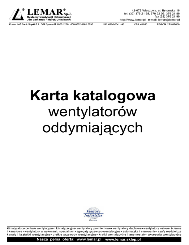 Karta katalogowa wentylatorów oddymiających wentylatory oddymiające CHAT Zastosowanie Seria wentylatorów CHAT może być stosowana do wyciągania gorącego dymu powstałego w czasie pożaru. Wentylatory spełniają wymagania normy EN 12101-3 i posiadają odporność na temperaturę 400oC/2h. Doskonale sprawdzają sie w wentylacji kuchni przemysłowych, parkingów czy budynków użyteczności publicznej. Konstrukcja Wentylatory promieniowe przeznaczone do montażu w pozycji poziomej w okrągłych kanałach wentylacyjnych. Obudowa galwanizowana, izolowana akustycznie. Obudowa z galwanizowanej blachy stalowej wyposażona w ognioodporną izolację akustyczną z włókna szklanego (MO) o grubości 25mm. Panel z króćcem wylotowym można przekładać w celu dostosowania wentylatora do istniejącej wentylacji. Wirnik aluminiowy z łopatkami pochylonymi do tyłu, dynamicznie wyważany. Silnik elektryczny Dostępne są trójfazowe silniki 230/400V-50Hz jednobiegowe, oraz trójfazowe silnik 400V-50Hz dwubiegowe. Wszystkie silniki mają stopień ochrony IP 55 i klase izolacji H. Dostępne są modele 4-, 6- i 4/8-biegunowe. 400oC/2h Otwór do odpływu skroplin i wyeliminowania kondensacji wody Panele wykonane z grubej ocynkowanej blachy stalowej, wewnątr z pokr ytej ognioodporną izolacją akustyczną (M0), w celu znaczącego zmniejszenia hałasu. Wszystkie wentylatory wyposażone są w sztywne ramy z uchwytem do podnoszenia, aby ułatwić instalację na podłodze lub suficie. Aluminiowe narożniki zapewniają wysoką jakość i solidność. Możliwość zmiany kierunku wylotu Dane techniczne Typ prędkość obrotowa moc max. natężenie wydajność max. [obr./min] [kW] [A] [m3/h] poziom ciśnienia akustycznego wlot [dB(A)] wylot [dB(A)] emitowany [dB(A)] masa nr artykułu [kg] Silnik trójfazowy czterobiegunowy CHAT/4-400 1415 0,75 2,0 4200 58 63 53 80 CHAT/4-500 1435 1,5 3,4 6200 63 70 58 110 CHAT/4-560 1475 2,2 4,6 8800 75 Silniki trójfazowe sześciobiegunowe 76 60 185 41020680 41020700 CHAT/6-560 960 1,1 3,0 5700 65 67 53 185 41020710 CHAT/6-630 975 1,5 3,7 10000 69 70 53 200 41020720 5,2 14000 73 CHAT/6-710 965 2,2 CHAT/6-800 975 3,0 1420 / 710 CHAT/4/8-500 CHAT/4/8-560 CHAT/4/8-400 74 58 215 41020730 7,0 17100 76 Silnik trójfazowy 4/8 biegunowy - dwubiegowy 78 60 229 41020740 0,75 / 0,12 2,2 / 0,85 63 53 80 41020750 1430 / 715 1,5 / 0,25 3,75 / 1,15 6200 63 70 58 110 41020760 1430 / 715 2,2 / 0,4 5,1 / 1,6 8800 75 76 60 187 41020770 www.venture.pl 4200 58 353 wentylatory oddymiające CHAT Charakterystyka akustyczna Moc akustyczna. Wartości przedstawione w tabeli są w dB(A) Typ Wylot CHAT/4-560 CHAT/4-560 CHAT/6-630 CHAT/4-710 CHAT/6-800 63 Hz 59 125 Hz 74 250 Hz 81 500 Hz 84 1000 Hz 88 2000 Hz 80 4000 Hz 70 8000 Hz 63 62 Wlot 67 69 72 76 89 81 69 Emitowany 59 64 63 61 73 62 53 47 Wylot 50 65 72 75 79 71 61 54 54 Wlot 56 66 71 75 74 71 64 Emitowany 49 61 63 60 58 52 48 39 Wylot 62 68 74 79 81 71 64 52 61 Wlot 65 66 68 78 82 70 63 Emitowany 56 59 58 62 64 49 46 44 Wylot 62 69 75 79 87 72 66 58 60 Wlot 69 70 73 81 85 73 67 Emitowany 61 64 63 66 68 53 50 44 Wylot 65 73 76 81 92 76 70 64 Wlot 69 72 75 83 89 76 70 64 Emitowany 60 65 65 67 71 55 52 47 Wymiary [mm] 400 A M OD Q 648 728 355 852 500 798 878 400 1002 560 860 940 500 1020 630 920 1000 630 1080 710 980 1060 630 1140 800 1037 1117 710 1197 55 A 55 A M Typ Q Charakterystyki pracy Q = wydajność wentylatora [m3/h] i [m3/s] Pe = ciśnienie statyczne [Pa] i [mmWG] Dane zgodne z normą ISO 5801 i AMCA 210-99 CHAT/4-400 [Pa] [mmWG] [m3/h] [m3/s] 354 Venture Industries Sp. z o.o. ul. Mokra 27, 05-092 Łomianki - Kiełpin tel. +48 22 751 95 50, 751 20 31 fax +48 22 751 22 59, 751 12 02 e-mail: [email protected] wentylatory oddymiające CHAT Charakterystyki pracy CHAT/4-500 CHAT/4-560 [Pa] [mmWG] [Pa] [mmWG] [m3/h] [m3/h] [m3/s] [m3/s] CHAT/6-560 CHAT/6-630 [Pa] [mmWG] [Pa] [mmWG] [m3/h] [m3/h] 3 [m3/s] [m /s] CHAT/6-710 CHAT/6-800 [Pa] [mmWG] [Pa] [mmWG] [m3/h] [m3/h] 3 [m3/s] [m /s] www.venture.pl 355