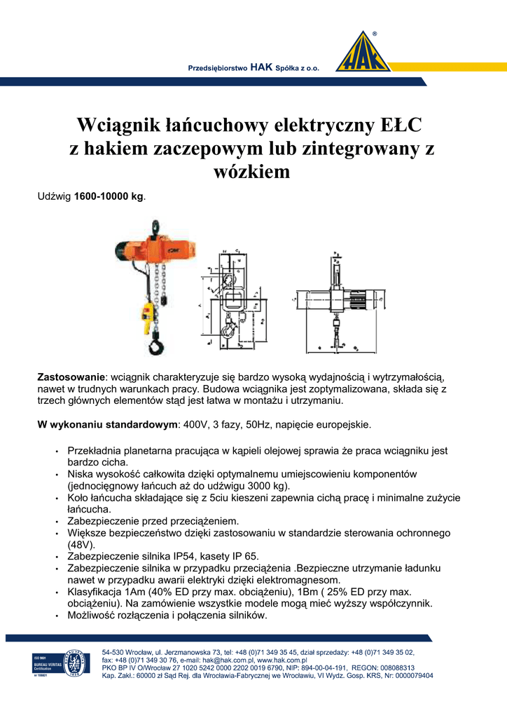 Wciągnik łańcuchowy elektryczny EŁC z hakiem zaczepowym lub