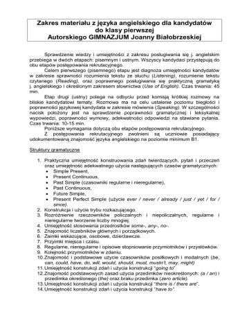 Zakres materiału z języka angielskiego dla kandydatów do klasy pierwszej Autorskiego GIMNAZJUM Joanny Białobrzeskiej Sprawdzenie wiedzy i umiejętności z zakresu posługiwania się j. angielskim przebiega w dwóch etapach: pisemnym i ustnym. Wszyscy kandydaci przystępują do obu etapów postępowania rekrutacyjnego. Celem pierwszego (pisemnego) etapu jest diagnoza umiejętności kandydatów w zakresie sprawności rozumienia tekstu ze słuchu (Listening), rozumienie tekstu czytanego (Reading), oraz poprawnego posługiwania się praktyczną gramatyką j. angielskiego i określonym zakresem słownictwa (Use of English). Czas trwania: 45 min. Etap drugi (ustny) polega na odbyciu przed komisją krótkiej rozmowy na bliskie kandydatowi tematy. Rozmowa ma na celu ustalenie poziomu biegłości i poprawności językowej kandydata w zakresie mówienia (Speaking). W szczególności nacisk położony jest na sprawdzenie poprawności gramatycznej i leksykalnej wypowiedzi, poprawności wymowy, adekwatności odpowiedzi na stawiane pytania. Czas trwania: 10-15 min. Poniższe wymagania dotyczą obu etapów postępowania rekrutacyjnego. Z postępowania rekrutacyjnego zwolnieni są uczniowie posiadający udokumentowaną znajomość języka angielskiego na poziomie minimum B1. Struktury gramatyczne 1. Praktyczna umiejętność konstruowania zdań twierdzących, pytań i przeczeń oraz umiejętność adekwatnego użycia następujących czasów gramatycznych: Simple Present, Present Continuous, Past Simple (czasowniki regularne i nieregularne), Past Continuous, Future Simple, Present Perfect Simple (użycie ever / never / already / just / yet / for / since). 2. Konstrukcja i użycie trybu rozkazującego. 3. Rozróżnienie rzeczowników policzalnych i niepoliczalnych, regularne i nieregularne tworzenie liczby mnogiej. 4. Umiejętność stosowania przedrostków some-, any-, no-. 5. Znajomość liczebników głównych i porządkowych. 6. Zaimki wskazujące, osobowe, dzierżawcze. 7. Przyimki miejsca i czasu. 8. Regularne, nieregularne i opisowe stopniowanie przymiotników i przysłówków. 9. Kolejność przymiotników w zdaniu. 10. Znajomość i podstawowe użycie czasowników posiłkowych i modalnych (be, can, could, have, do, will, would, should, must, mustn’t, may, might) 11. Umiejętność konstrukcji zdań i użycia konstrukcji “going to” 12. Znajomość podstawowych zasad użycia przedimków nieokreślonych: (a / an) i przedimka określonego (the) oraz braku przedimka (zero article). 13. Umiejętność konstrukcji zdań i użycia konstrukcji “there is / there are”. 14. Umiejętność konstrukcji zdań i użycia konstrukcji “have to”. 15. Umiejętność tworzenia i użycia wyrażeń typu „nieprawdaż…?” (question tags). 16. Zdania warunkowe typu I i II (First, Second Conditional). 17. Umiejętność konstrukcji zdań i użycia konstrukcji typu „Szkoda, że…” (wish + Past Simple). 18. Umiejętność konstrukcji zdań i użycia konstrukcji „used to”. 19. Rozróżnienie i poprawne użycie czasowników „make” oraz „let”. Wybrane zagadnienia leksykalne 1. Miejsca w mieście (library / museum / cinema etc.). 2. Członkowie rodziny (father / cousin / niece etc.). 3. Zwierzęta domowe (guinea pig / rabbit / canary etc.). 4. Hobby i zainteresowania (ride a horse / play cards / paint etc.) 5. Czynności codzienne (travel / watch a film / listen to music etc.). 6. Opis pogody (warm / chilly / foggy etc.). 7. Zawody i profesje (hairdresser / teacher / police officer etc.). 8. Opis kierunków i wskazywanie drogi (left / turn right / go along etc.). 9. Przymiotniki opisujące przedmioty (square / narrow / heavy etc.). 10. Dzikie zwierzęta (camel / ostrich / alligator etc.). 11. Obowiązki domowe (make the bed / cook / iron etc.). 12. Elementy infrastruktury miejskiej (phone booth / taxi stand / bus stop etc.). 13. Komputery i informatyka (website / screen / to click on etc.). 14. Terminy i zagadnienia geograficzne (earthquake / tornado / the North Pole etc.). 15. Wakacje i wypoczynek (tent / sleeping bag / rucksack etc.). Zagadnienia kulturowe 1. Znajomość specyfiki świąt i innych uroczystości krajów anglojęzycznych (Halloween, Christmas, Valentine’s Day, Easter, Guy Fawkes’ Day, St. Patrick’s Day, April Fool’s Day etc.). 2. Podstawowe wiadomości z zakresu geografii Wielkiej Brytanii (Szkocji, Walii, Anglii, Irlandii Północnej), Irlandii, USA, Kanady, Australii i Nowej Zelandii. 3. Podstawowe wiadomości z zakresu historii i realiów krajów anglojęzycznych (specyfika odmian języka angielskiego, najważniejsze miejsca Londynu i innych brytyjskich miast, znane postaci – W. Shakespeare, Rodzina Królewska, itd.). Rekomendowana literatura 1. 2. 3. 4. 5. 6. 7. 8. 9. M. Carling, S. Jervis, Grammar Time 3, Longman M. Carling, S. Jervis, Grammar Time 4, Longman E. Flannigan, Grammar Friends 3, Oxford S. Jervis, Grammar Time 2, Longman L. Kilbey, C. Skinner, M. Bogucka, New Friends 4, Longman R. Murphy, Essential Grammar in Use, Cambridge University Press C. Skinner, M. Bogucka, New Friends 2, Longman C. Skinner, M. Bogucka, New Friends 3, Longman T. Ward, Grammar Friends 2, Oxford