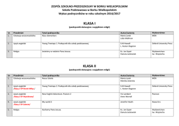 ZESPÓŁ SZKOLNO-PRZEDSZKOLNY W BORKU WIELKOPOLSKIM Szkoła Podstawowa w Borku Wielkopolskim Wykaz podręczników w roku szkolnym 2016/2017 KLASA I (podręczniki dotacyjne z wyjątkiem religii) Lp. 1. Przedmiot Tytuł podręcznika Autor/autorzy Wydawnictwo MEN Edukacja wczesnoszkolna Nasz elementarz Maria Lorek Lidia Wollman 2. Język angielski Young Treetops 1. Podręcznik dla szkoły podstawowej S.M Howell L. Kester-Dogston Oxford University Press 3. Religia Jesteśmy w rodzinie Pana Jezusa. Ks. Jan Szpet Danuta Jackowiak Wydawnictwo św. Wojciecha Wydawnictwo MEN KLASA II (podręczniki dotacyjne z wyjątkiem religii) Lp. 1. Przedmiot Tytuł podręcznika Autor/autorzy Edukacja wczesnoszkolna Nasza Szkoła Maria Lorek Monika Zatorska 2. Język angielski /klasy 2 SP Borek Wlkp./ Young Treetops 2. Podręcznik dla szkoły podstawowej S.M Howell L. Kester-Dogston Oxford University Press 3. Język angielski /klasy 2 SF Wycisłowo/ New English Adventure. Poziom 2 Viv Lambert Anne Worrall Pearson 4. Język angielski /klasy 2 SF Zalesie/ My world 2 Jennifer Heath Nowa Era 5. Religia Kochamy Pana Jezusa. Ks. Jan Szpet Danuta Jackowiak Wydawnictwo św. Wojciecha KLASA III (podręczniki dotacyjne z wyjątkiem religii) Lp. 1. Przedmiot Tytuł podręcznika Autor/autorzy Wydawnictwo MEN Edukacja wczesnoszkolna Nasza Szkoła Maria Lorek Monika Zatorska 2. Język angielski /klasy 3 SP Borek Wlkp./ Young Treetops 3. Podręcznik dla szkoły podstawowej S.M Howell L. Kester-Dogston Oxford University Press 3. Język angielski /klasy 3 SF Wycisłowo/ Bugs world 3. Papiol Elisenda Toth Maria Kondro Magdalena Macmillan 4. Język angielski /klasy 3 SF Zalesie/ „ My world 3” Jennifer Heath Nowa Era 5. Religia Przyjmujemy Pana Jezusa. Ks. Jan Szpet Danuta Jackowiak Wydawnictwo św. Wojciecha KLASA IV (podręczniki dotacyjne z wyjątkiem religii) Lp. 1. Wydawnictwo Nowa Era Przedmiot Tytuł podręcznika Autor/autorzy Język polski Słowa na start! Podręcznik do języka polskiego dla klasy czwartej szkoły podstawowej. Część 1: Kształcenie literackie i kulturowe Słowa na start! Podręcznik do języka polskiego dla klasy czwartej szkoły podstawowej. Część 2: Kształcenie językowe Marlena Derlukiewicz Tim Falla Paul ADavies, Sylvia Wheeldon Paul Shipton Ewa Palczak Marta Kozubska Ewa Krawczyk Lucyna Zastąpiło Grzegorz Wojciechowski Oxford University Press Marcin Braun Agnieszka Mańkowska Małgorzata Paszyńska Marcin Braun Agnieszka Mańkowska Małgorzata Paszyńska Nowa Era 2. Język angielski /dla uczniów z obowiązkowym językiem angielskim/ Steps Forward 1 3. „Ich und du 54” Podręcznik do języka niemieckiego dla klasy 4 4. Język niemiecki /dla uczniów z obowiązkowym językiem niemieckim/ Historia i społeczeństwo 5. Matematyka „Wczoraj i dziś”. Podręcznik do historii i społeczeństwa dla klasy czwartej szkoły podstawowej. Matematyka z kluczem dla klasy 4 szkoły podstawowej- część 1 Matematyka z kluczem dla klasy 4 szkoły podstawowej- część 2. Danuta Chwastniewska Agnieszka Gorzałczyńska-Mróz Danuta Rożek Wydawnictwo Szkolne PWN Nowa Era Nowa Era 6. Przyroda „Tajemnice przyrody” Podręcznik do przyrody dla klasy czwartej szkoły podstawowej. Maria Marko-Worłowska Feliks Szlajfer Joanna Stawarz Nowa Era 7. Plastyka „Do dzieła”. Podręcznik do plastyki dla klasy czwartej szkoły podstawowej Nowa Era 8. Muzyka „Lekcja muzyki”. Podręcznik do muzyki dla klasy czwartej szkoły podstawowej 9. Zajęcia techniczne Jak to działa? Podręcznik do zajęć technicznych dla klasy czwartej szkoły podstawowej 10 11 Zajęcia komputerowe Religia Lubię to! Podręcznik do zajęć komputerowych dla klasy czwartej szkoły podstawowej „Jestem chrześcijaninem” Jadwiga Lukas Krystyna Onak Monika Gromek Grażyna Kilbach Lech Łabecki Marta Łabecka Michał Kęska Ks. Jan Szpet Danuta Jackowiak Nowa Era Nowa Era Nowa Era Wydawnictwo św. Wojciecha Klasa V (podręczniki dotacyjne z wyjątkiem religii) Lp. Przedmiot 1. Język polski Tytuł podręcznika „Słowa na start”. Podręcznik do kształcenia kulturowego i literackiego cz. 1 „Słowa na start”. Podręcznik do kształcenia językowego cz. 2 2. Matematyka Autor Marlena Derlukiewicz Wydawnictwo Nowa Era Anna Wojciechowska Agnieszka Marcinkiewicz Nowa Era „Matematyka z kluczem”. Podręcznik do matematyki dla klasy piątej szkoły Marcin Braun Agnieszka Mańkowska podstawowej, część 1 Nowa Era Marcin Braun Agnieszka Mańkowska Małgorzata Paszyńska Nowa Era Małgorzata Paszyńska „Matematyka z kluczem”. Podręcznik do matematyki dla klasy piątej szkoły podstawowej, część 2 3. Historia i społeczeństwo „Wczoraj i dziś” Podręcznik do historii i społeczeństwa dla klasy piątej szkoły podstawowej Grzegorz Wojciechowski 4. Język angielski /dla uczniów z obowiązkowym językiem angielskim/ „Steps in English 2” 5. Język niemiecki /dla uczniów z obowiązkowym językiem niemieckim/ 6. Przyroda „Ich und du 5” Podręcznik do języka niemieckiego dla klasy 5 Nowa Era Tim Falla Paul ADavies, Sylvia Wheeldon Paul Shipton Ewa Palczak Marta Kozubska Ewa Krawczyk Lucyna Zastąpiło Oxford University Press „Tajemnice przyrody” Podręcznik do przyrody dla klasy piątej szkoły podstawowej. Joanna Ślósarczyk Ryszard Kozik Feliks Szlajfer Nowa Era 7. Zajęcia komputerowe 8. Zajęcia techniczne „Lubię to!” Podręcznik do zajęć komputerowych dla klasy piątej szkoły podstawowej Jak to działa? Podręcznik do zajęć technicznych dla klasy piątej szkoły podstawowej Nowa Era Nowa Era 9. Muzyka „Lekcja muzyki”. Podręcznik do muzyki dla klasy piątej szkoły podstawowej Michał Kęska Lech Łabecki Marta Łabecka Monika Gromek Grażyna Kilbach Jadwiga Lukas Krystyna Onak ks.Jan Szpet Danuta Jackowiak Teresa Król 10. Plastyka „Do dzieła”. Podręcznik do plastyki dla klasy piątej szkoły podstawowej 11. Religia „Wierzę w Boga” 12. Wychowanie do życia w rodzinie „W drod